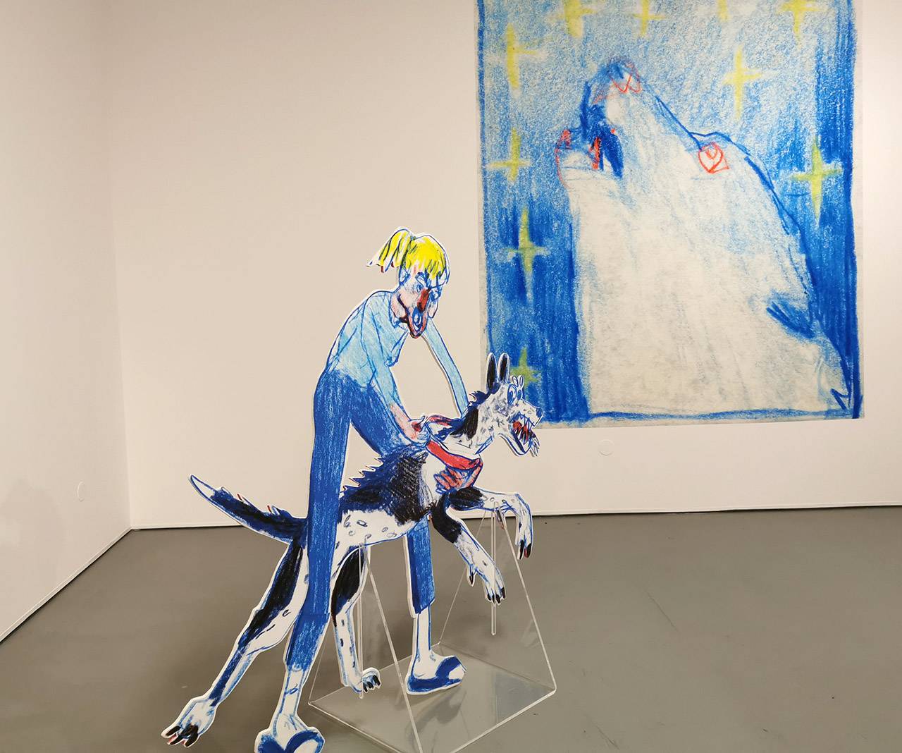מבחינה חומרית המיצב בחיפה עשוי בטכניקה דומה לזו שעבדתי בה בשנים האחרונות: מדובר בהגדלות דיגיטליות ענקיות של רישומים קטנים לצד ציור קיר שעשיתי ידנית בחלל ושני רישומי מקור קטנים. התערוכה ״כלבות״ ברוזנפלד שמורכבת מציורי שמן, מצטרפת למסורת ארוכה של ייצוגי ״כלב״ בתולדות הציור.