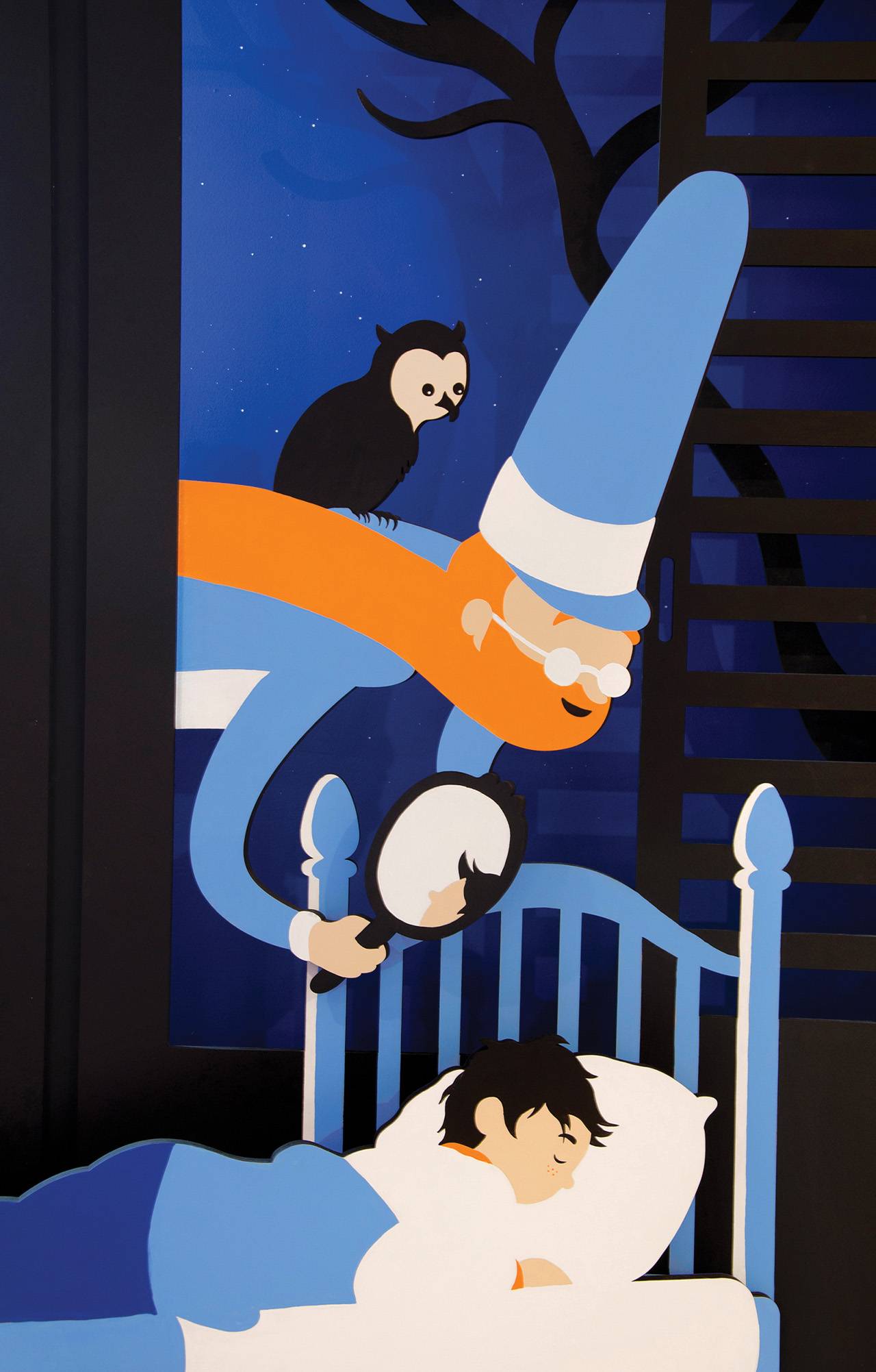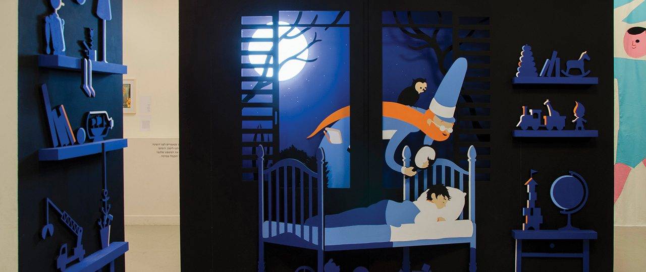 עבור התערוכה במוזיאון חיפה הפחתי חיים באחת מכפולות הספר – איור חדר הילד והרגע בו הקוסם רוכן מעליו ומפעיל את ראי הקסמים שלו. אחת התלבטויות המרכזיות נבעה מכך שהרגשתי שהסצינה הזאת, בה אדם רוכן מעל ילד ישן דרך החלון, עלולה להיות מעט מאיימת ואף מטרידה. מה גם שההצצה לחלום היא מבט למקום הכי אינטימי. נעזרתי בזקן, ביחד עם השטיח, כדי ליצור מעטפת חמימה וחובקת סביב הילד וניסיתי להגיע לאיזון נכון של נעימות מבלי לאבד מהמסתורין והקסם.