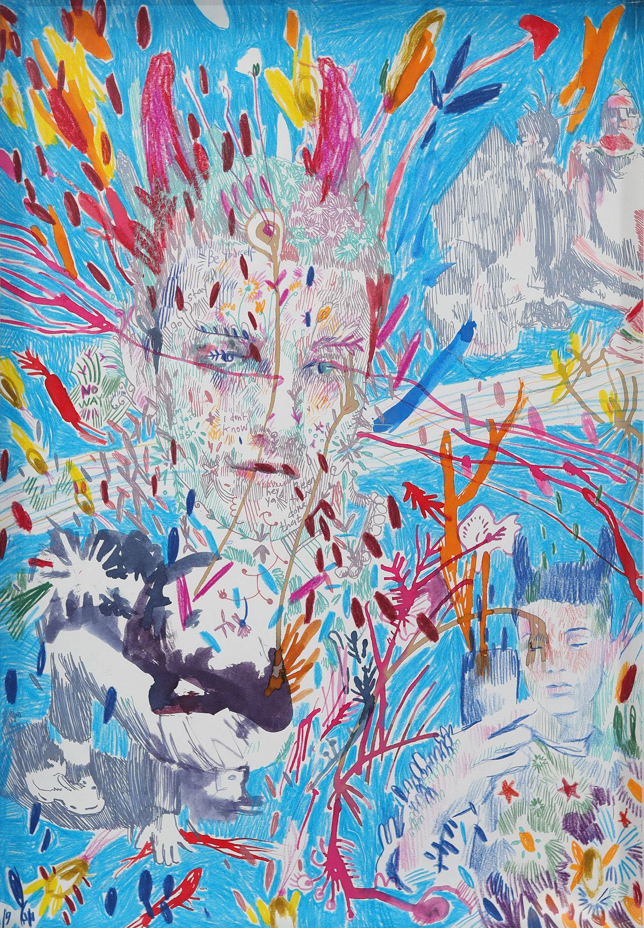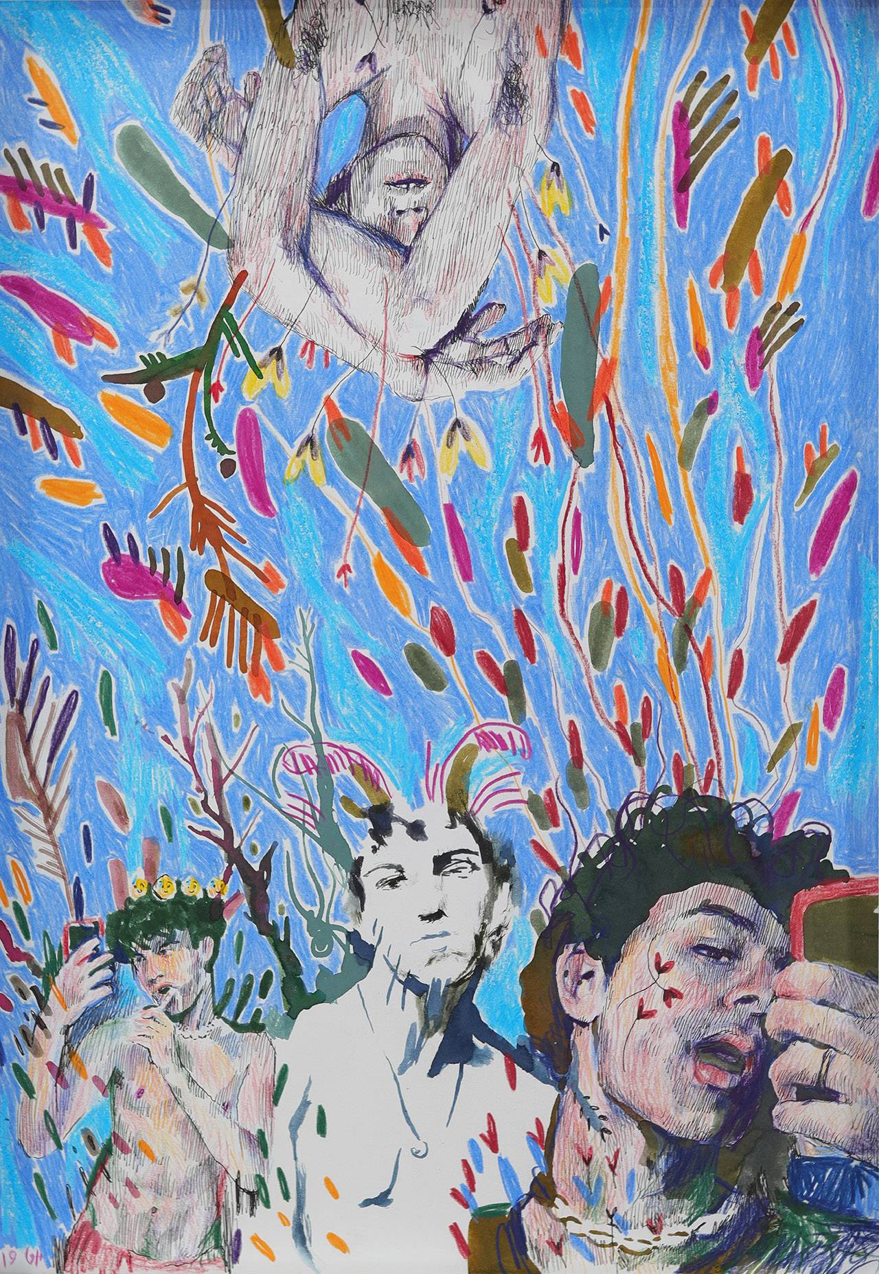 סדרת הציורים הגדולים שעשיתי לכבוד התערוכה היא הרחבה של הנושאים שאני עוסק בהם, בין אם זה הגוף הגברי או פורטרטים של בחורים צעירים. האפשרות שהגודל הפיזי הציעה היתה קודם כל במרחב החדש שיצר אפשרות לקולאז׳ים, לכתיבת טקסטים של שירים שאני שומע כשאני מצייר, ומקום להתנסות יותר עם הפיגמנטים, עם כל מה שעולה או בא באותו רגע; מקסימום אחרב רישום יפה.
