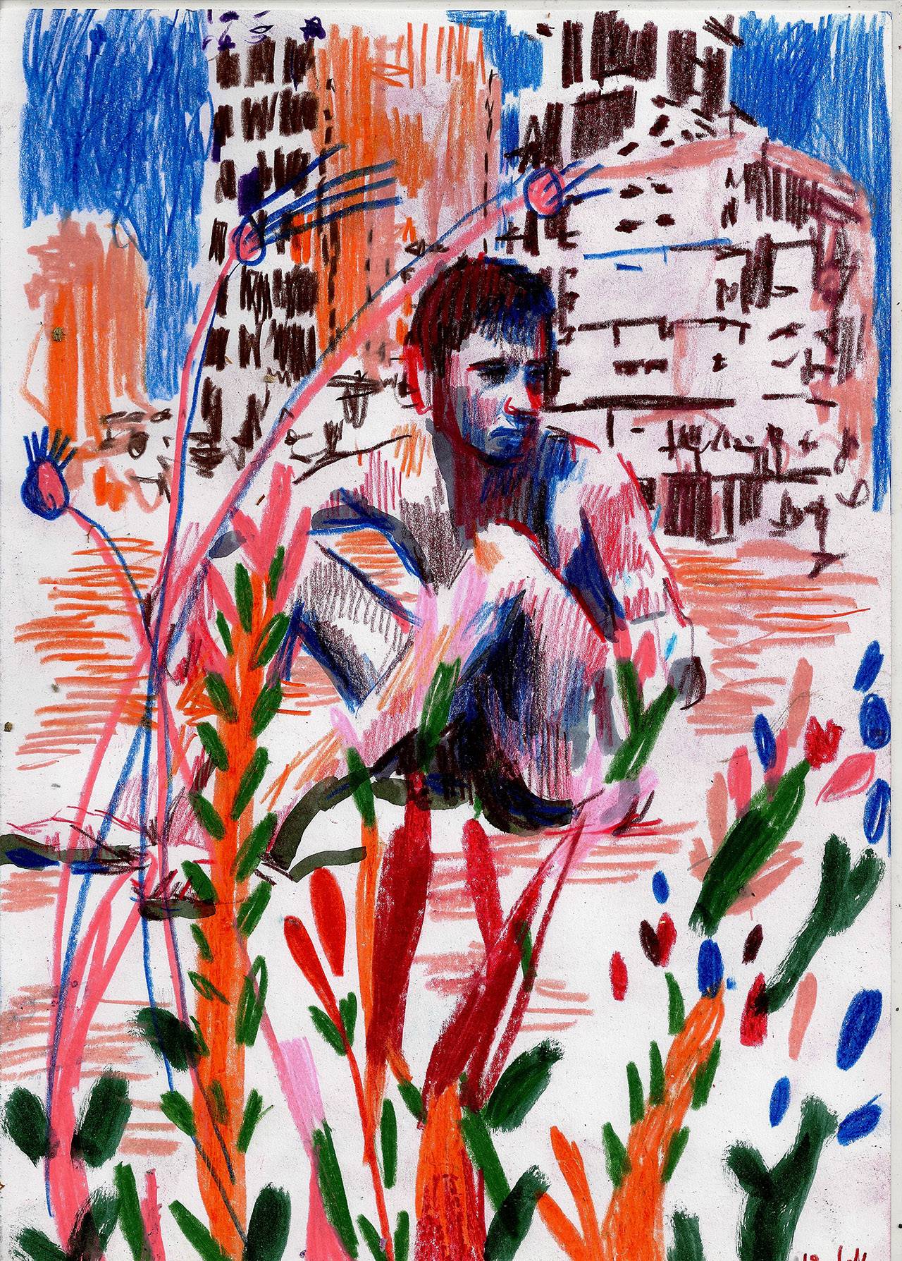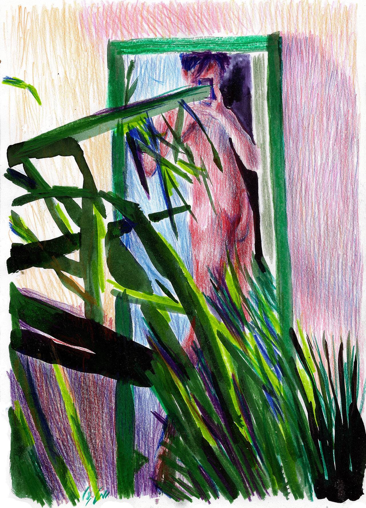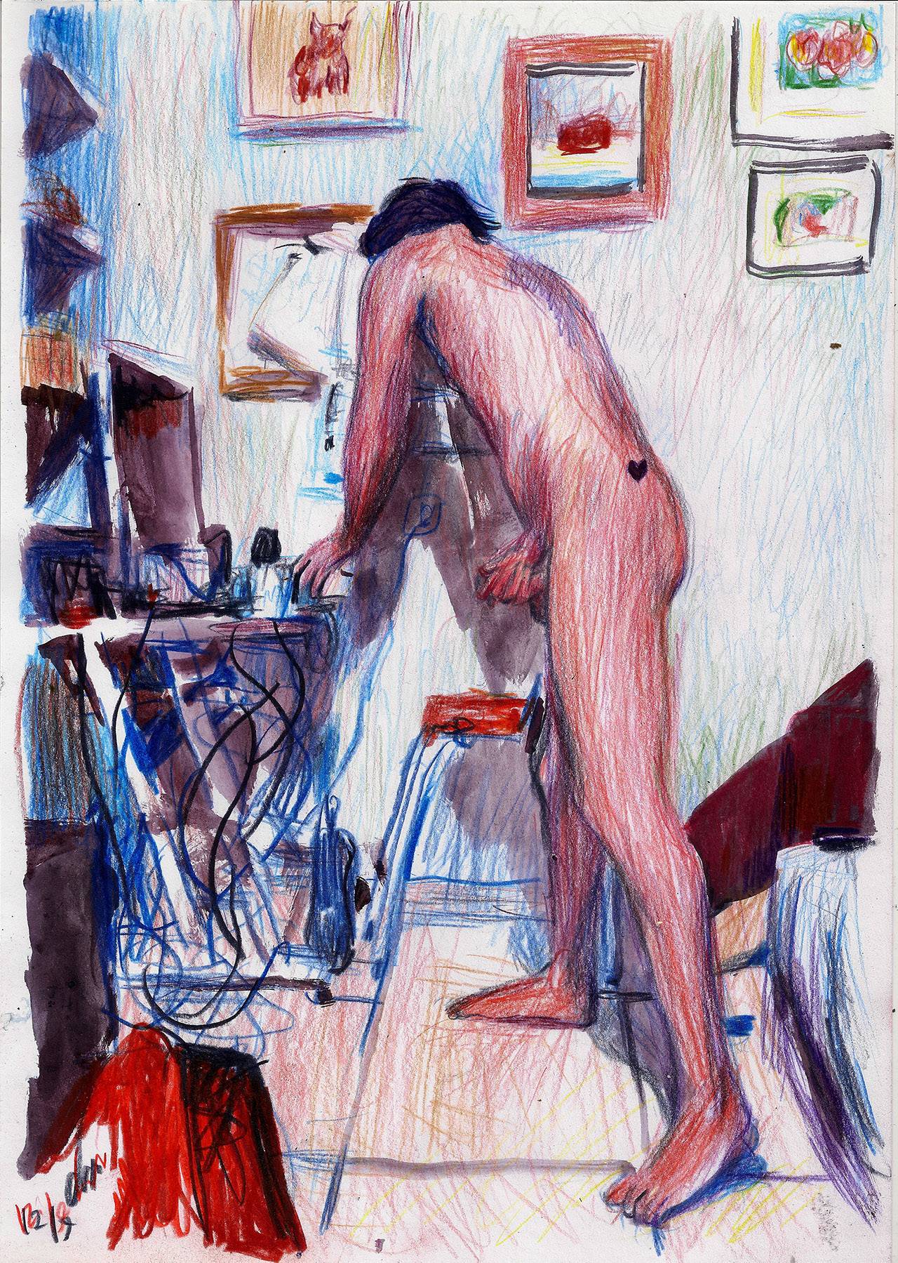 אני מחבב את הקוקון שיצרתי לעצמי, ושאני מצייר בחומרים ״נשיים״ או ילדיים כמו עפרונות צבעוניים וטושים, שיש בהם גם ממד של צניעות. אני מעט חושש מציור בצבעי שמן שיש לו היסטוריה ואיזו הילת מכובדות, שמאיימת להפוך אותי ממי שמשחק בטושים לגבר שמתלכלך ונמצא בסטודיו מבודד מהעולם.