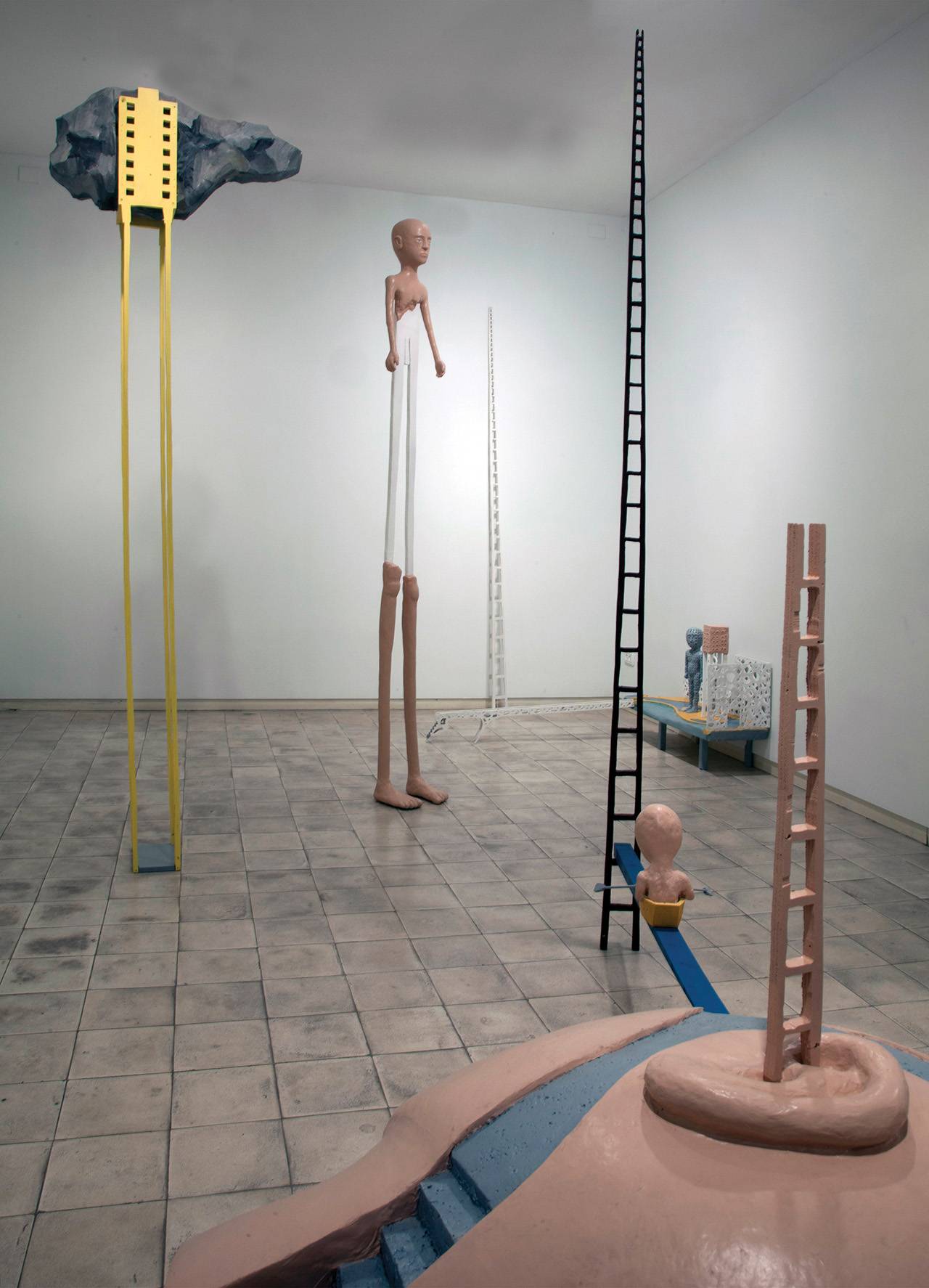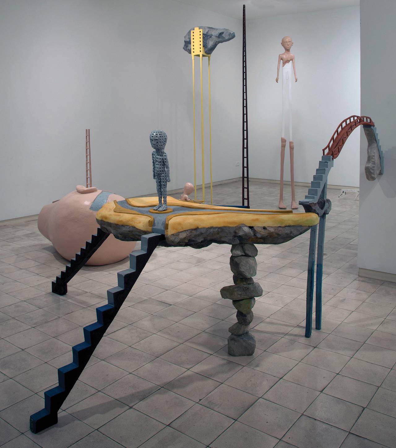 בתהליך העבודה עניינו אותי היחסים בין ארכיטקטורה ומרחב עירוני לבין הגוף. העיסוק הזה עניין אותי מבחינה של תנועה וזרימה אנושית במרחב, כמו גם יחסי פרופורציה כביטוי למצבים נפשיים. התנועה והזרימה במרחב של המיצב היא בין דימויים ואובייקטים, מעבר מאובייקט, למרחב ולגוף. הדמויות תמיד מקבלות את הדיס־פרופורציה שלהן וטרנספורמציות נוספות ביחס לנוף ולמקום. הן מעוצבות באמצעות המתחים הן של הסביבה והן של המרקם הנפשי שלהן.