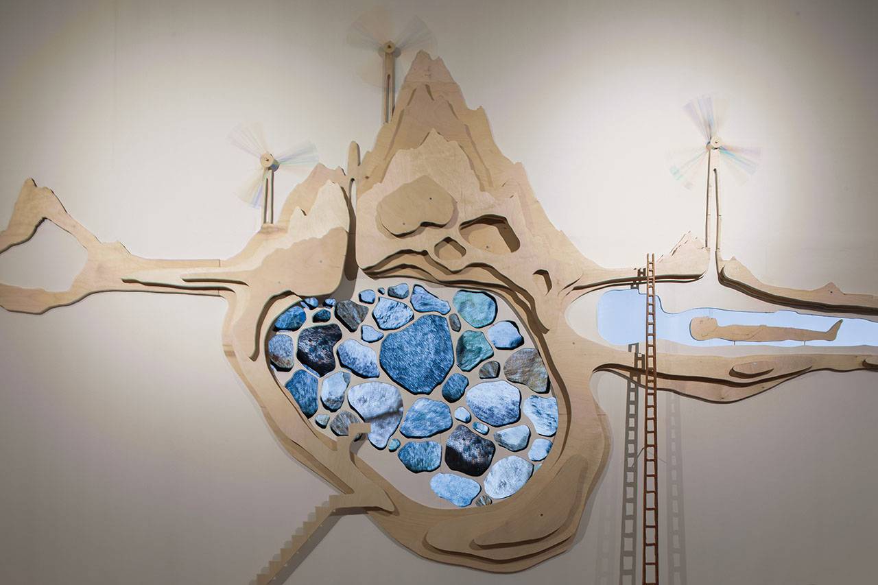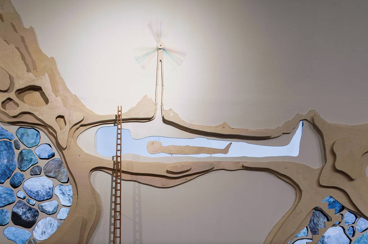 כשהוזמנתי ליצור עבודה חדשה לחלל התצוגה, התחלתי בבניית תבליט פיסולי תלת־ממדי של חלקי נוף וגוף משכבות עץ הנערמות אלה על אלה. בתוך התבליט יצרתי מעין חלונות ריקים בצורת כיסי אדמה שבהם נשתלו מסכים. סרטי האנימציה המוקרנים ממסכים נסתרים מעניקים לחלקים אלה נראות של איברים אורגניים, חיים ונעים. כך לדוגמה, באחד הסרטים נראה גל של אבנים ״נושמות״ הנטוע במעבה האדמה. האבנים רוחשות בתנועה של התכווצות והרפיה, ונראות כמו לב פועם, או תנועה של נשימה תת־קרקעית. מעל פני האדמה נראות הקרנות אחרות, ושבשבות מסתובבות המופעלות על ידי מנועים.