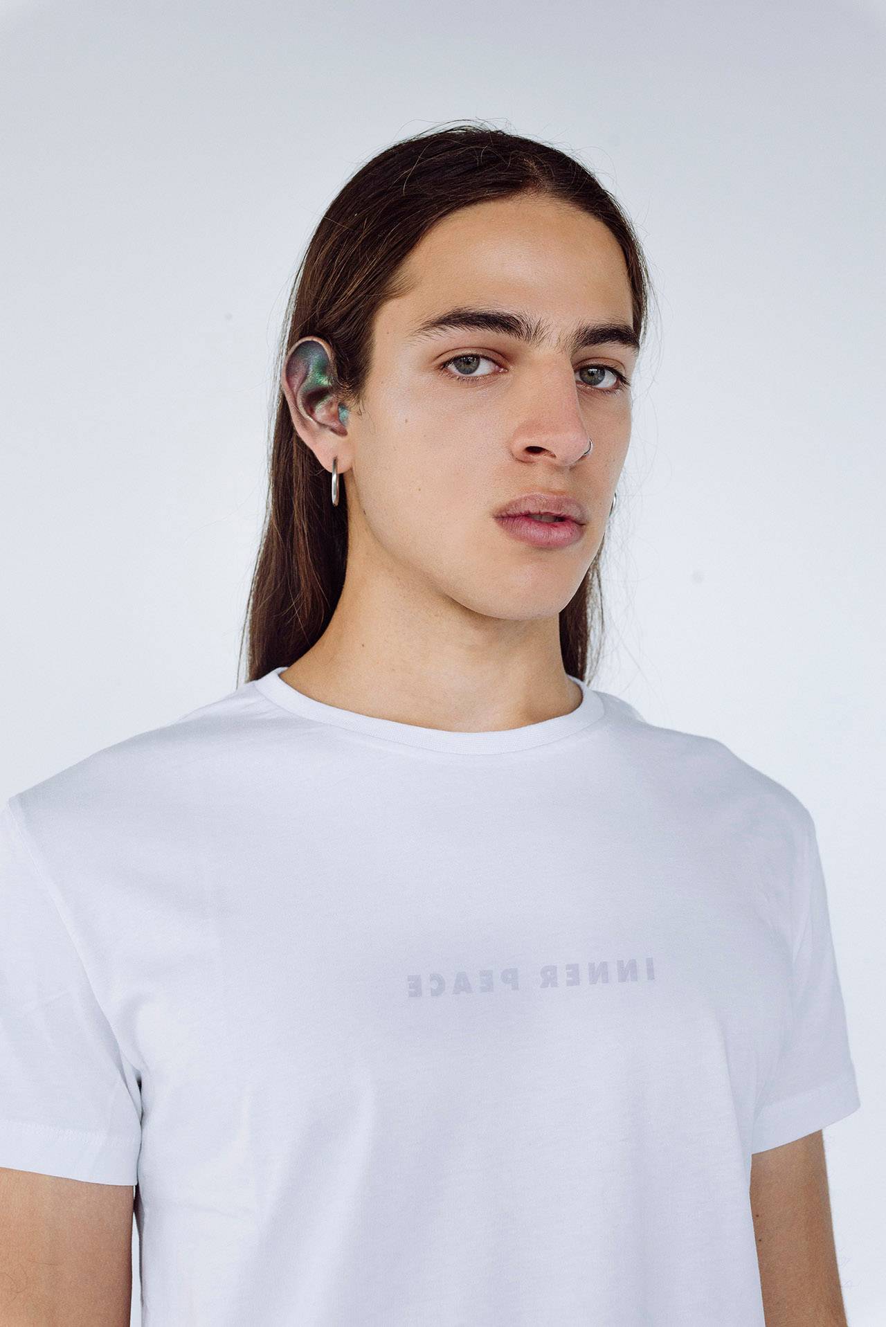 קולקציית INNER PEACE נולדה מתוך הדיסוננס של התקופה האחרונה: תחושה שמצד אחד אנחנו נמצאים בתוך אסון מתגלגל והעולם מצוי בכאוס כללי, ומצד שני זה עדיין לא משפיע לנו על היום־יום ויש רווחה חומרית גדולה. מהמקום של החיפוש אחר שלווה פנימית בתוך כל זה, יצאנו עם הטי שירט ששם הקולקציה מודפס עליה מבפנים.