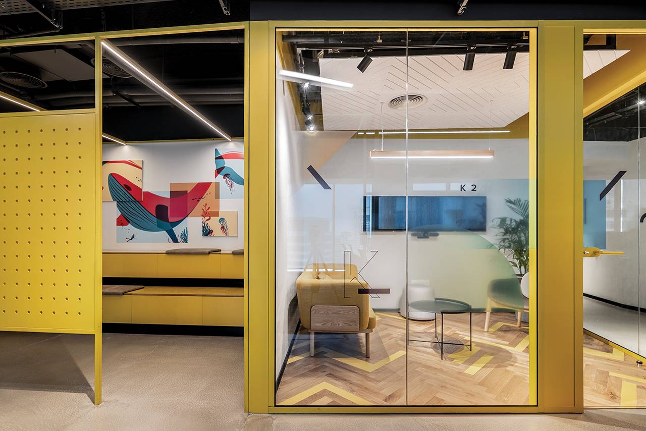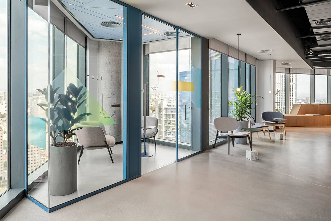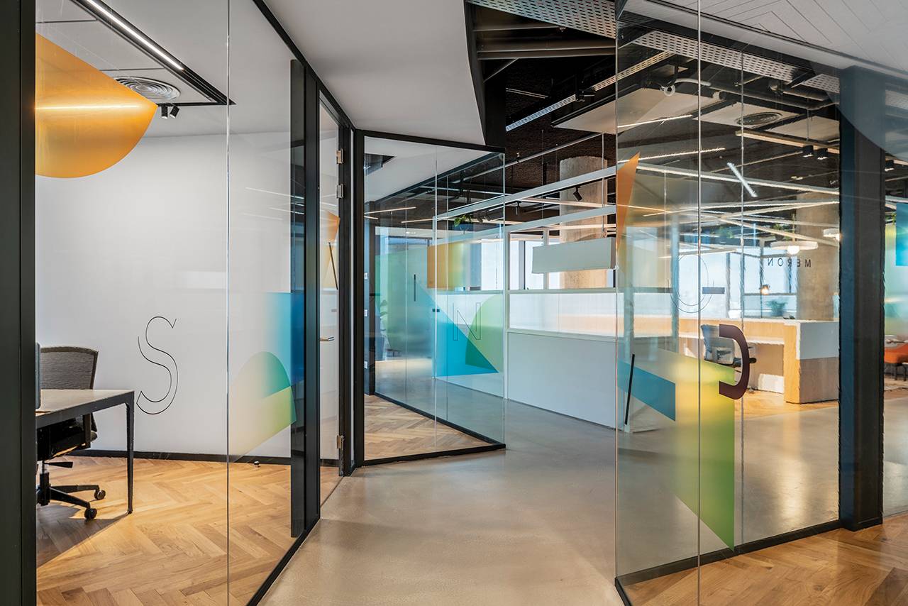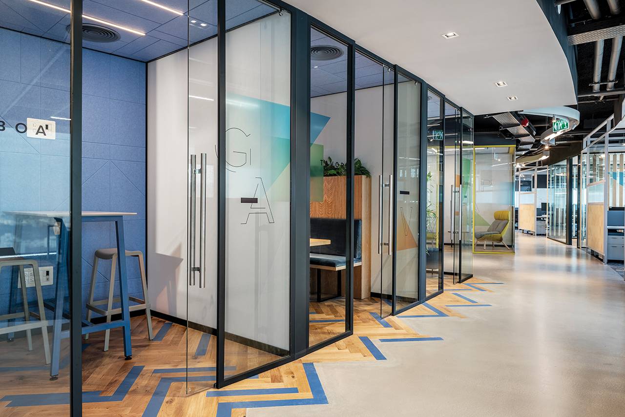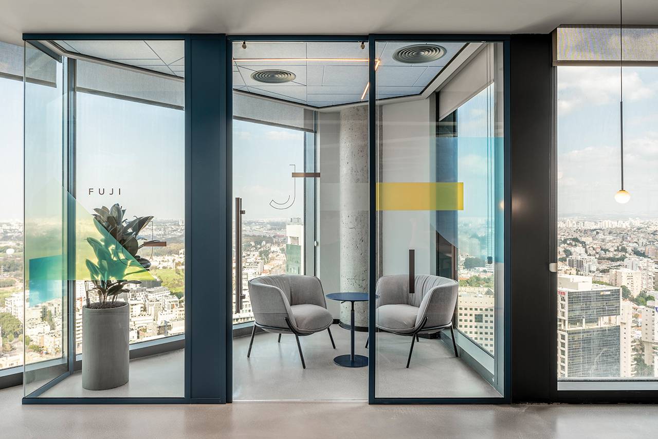 בנוסף למתחמים אלה תוכננו למעלה מ־15 חדרים שתומכים בחלל האופן־ספייס, ובהם חדרי ישיבות, חדרי סיעור מוחות, חללים המיועדים לישיבות אינטואיטיביות ומהירות וחדרים לישיבות של אחד־על־אחד. חללים אלה דורשים אקוסטיקה מושלמת, ולהשגתה בחרנו במערכות מחיצות רצפה־תקרה (חברת מיידסק) שיוצרו ייעודית עבור הפרויקט: מהן מחיצות בזיגוג יחיד ומהן בזיגוג כפול, בהתאם לצרכי החדר. על מנת לשמור על שקיפות מרבית שילבנו במערכות בעלות הזיגוג הבודד דלתות הזזה מזכוכית שקופה, ובאזורים בהם נדרשה אקוסטיקה גבוהה יותר שילבנו מערכת מחיצות בזיגוג כפול עם דלתות ציר שקופות. פרופילי המחיצות נצבעו בשלל גוונים בהתאם לפלטת הצבעים של הפרויקט עם התאמה מלאה של הפרזולים והידיות.