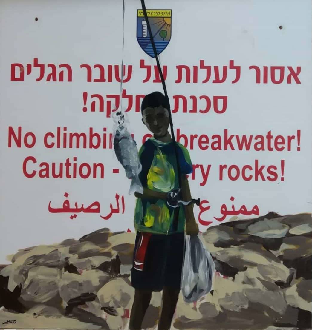 את העבודות הקודמות שלי מ־2019, ״המתרחצים״ (אקריליק על שלט פי.וי.סי. 160*80) ״המתרחצות״ (טושים על שלט פי.וי.סי. 70*80), ועבודה ללא כותרת (אקריליק על שלט פיויסי 70*70), עשיתי אחרי הבחירות המקומיות בעיר. נבחר ראש עיר חדש אחרי 30 שנה, והפעולה הראשונה שהוא עשה הייתה להוריד את הגדרות הלבנות והשלטים המגבילים ואת איסורי הכניסה שהיו חלק מרכזי מפני העיר. זו פעולה סמלית במובן העמוק, וגם יש לה חלק חשוב בחוויית החיים של תושב בעיר. הלכתי לים, אספתי משם את השלטים שהורדו ועליהם ציירתי.