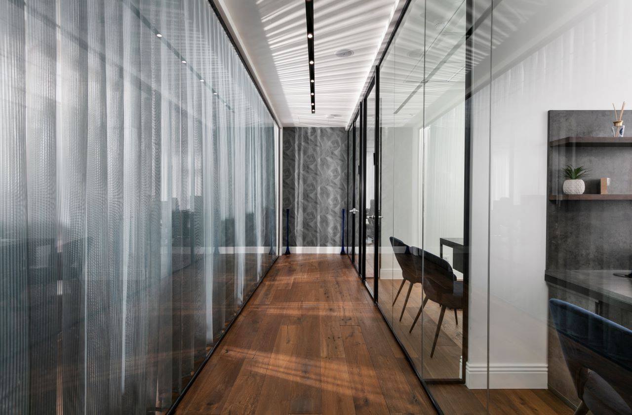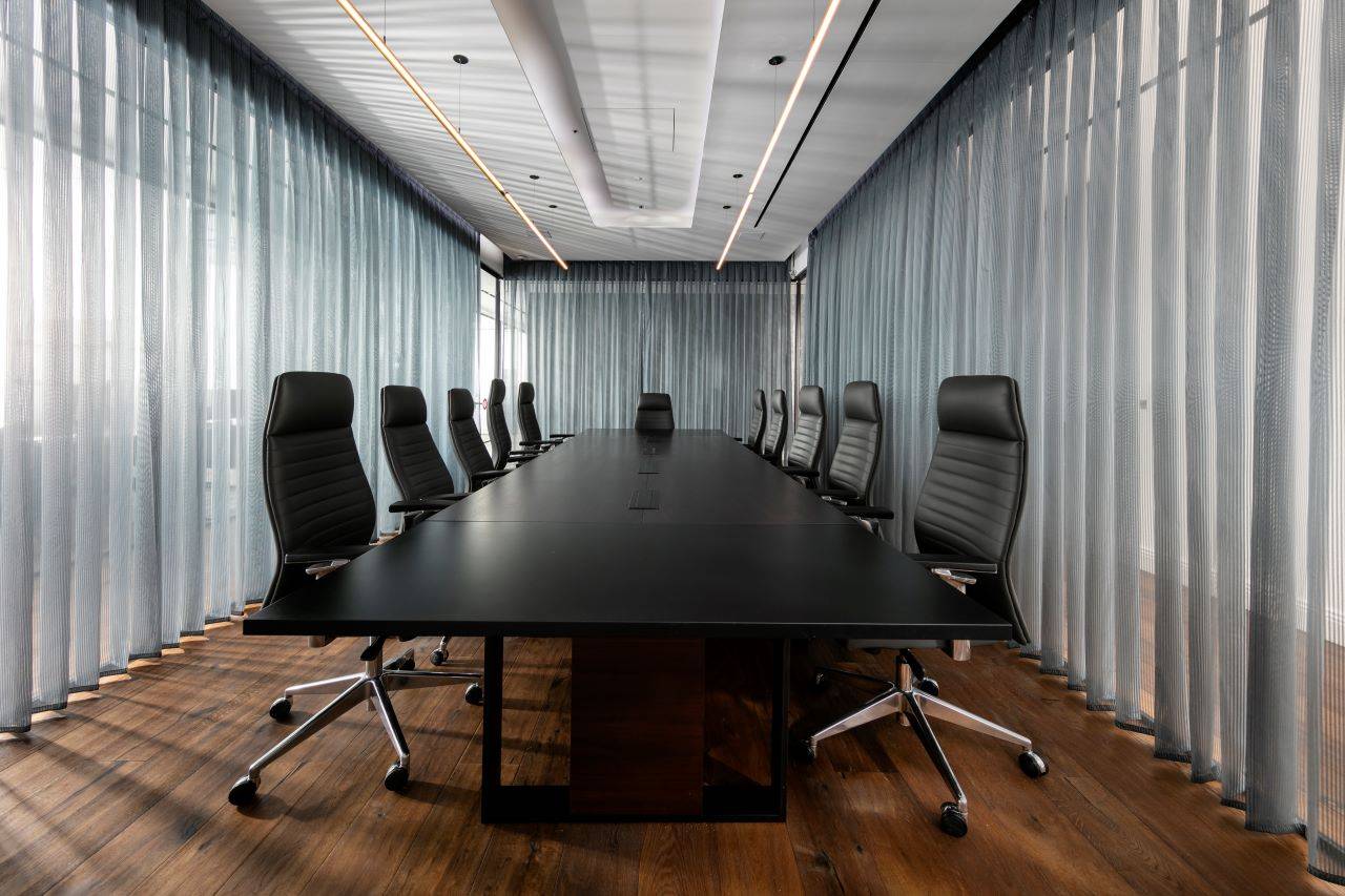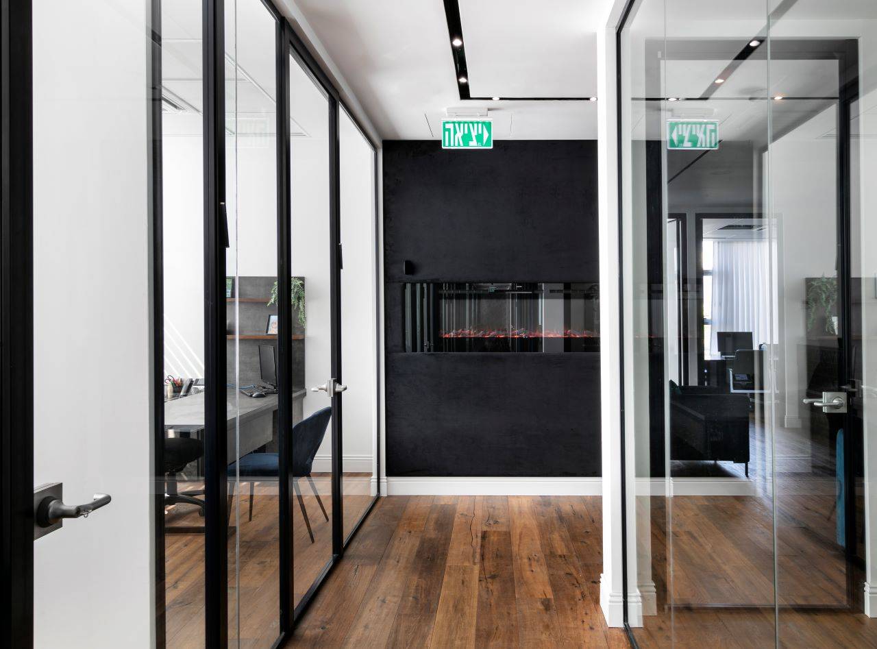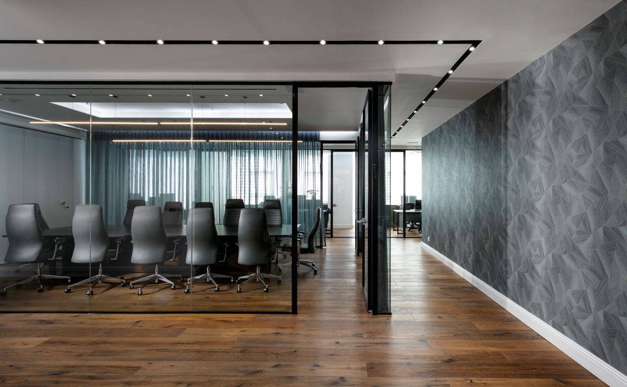 בסמוך לכניסה ממוקם חדר ישיבות מעוצב כאקווריום ממחיצות זכוכית עם וילונות חשמליים ש״נשפכים״ בהיקפו ויוצרים מראה חם ונעים. בחדר הישיבות ניצב שולחן גדול המשרת בנוחות 16 אנשים בישיבה נינוחה, והציוד הטכני הנדרש משולב באופן מוצנע מהעין. חללי המשרדים, שגודלם כ־8 מ״ר, פונים אל מסדרון ארוך. הם מתוכננים עם מחיצות זכוכית אווריריות במסגרת פרופיל בגוון כחול־לילה, ושקיפותן מאפשרת לאור הטבעי לחדור ולשטוף גם את צדם הפנימי.