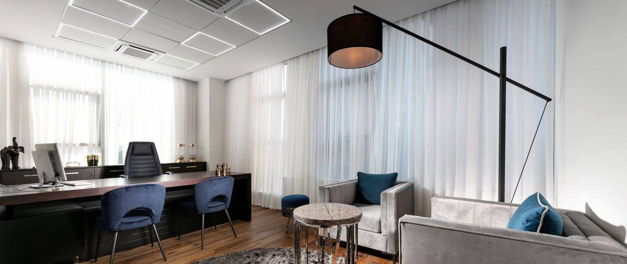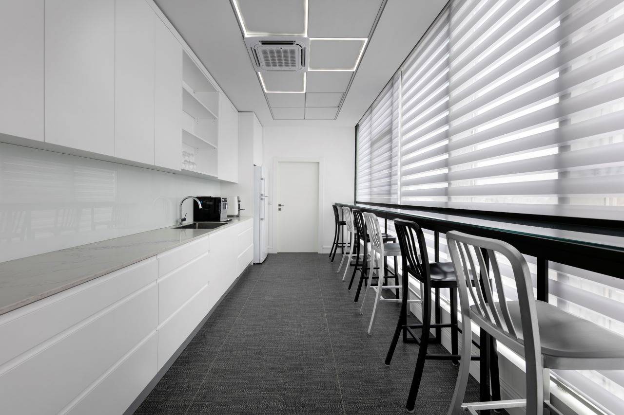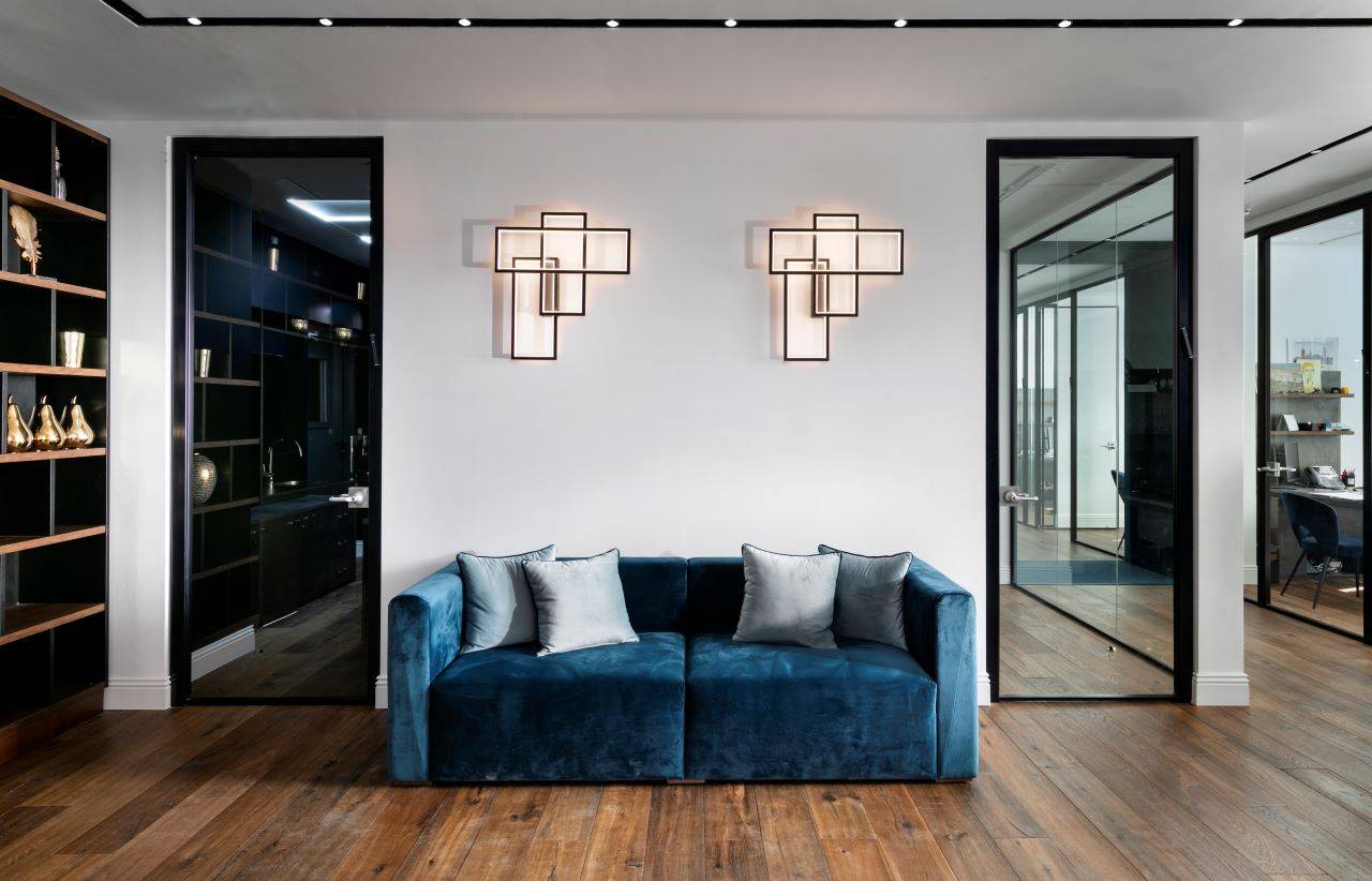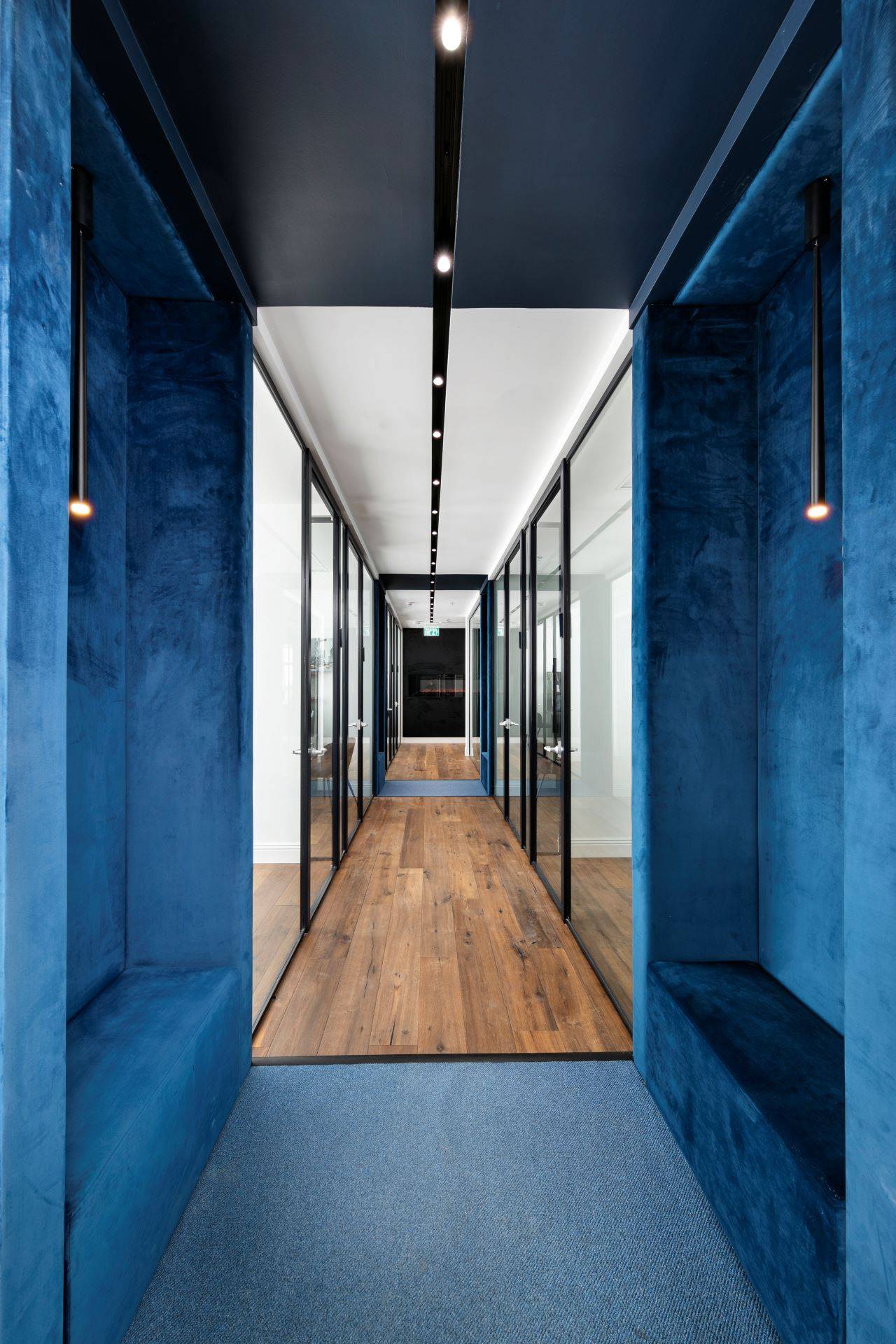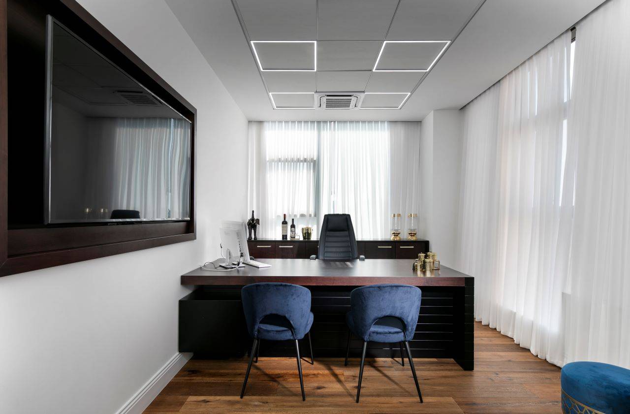 בסמוך לכניסה ממוקם חדר ישיבות מעוצב כאקווריום ממחיצות זכוכית עם וילונות חשמליים ש״נשפכים״ בהיקפו ויוצרים מראה חם ונעים. בחדר הישיבות ניצב שולחן גדול המשרת בנוחות 16 אנשים בישיבה נינוחה, והציוד הטכני הנדרש משולב באופן מוצנע מהעין. חללי המשרדים, שגודלם כ־8 מ״ר, פונים אל מסדרון ארוך. הם מתוכננים עם מחיצות זכוכית אווריריות במסגרת פרופיל בגוון כחול־לילה, ושקיפותן מאפשרת לאור הטבעי לחדור ולשטוף גם את צדם הפנימי.