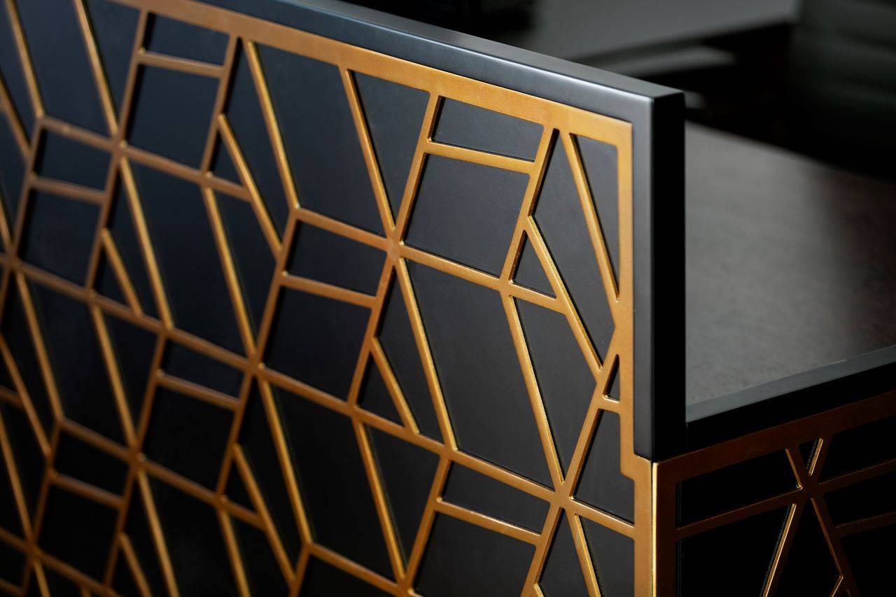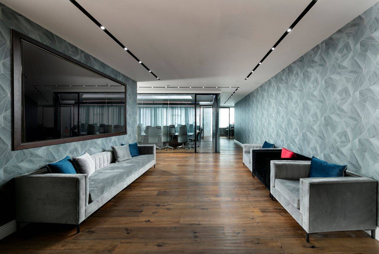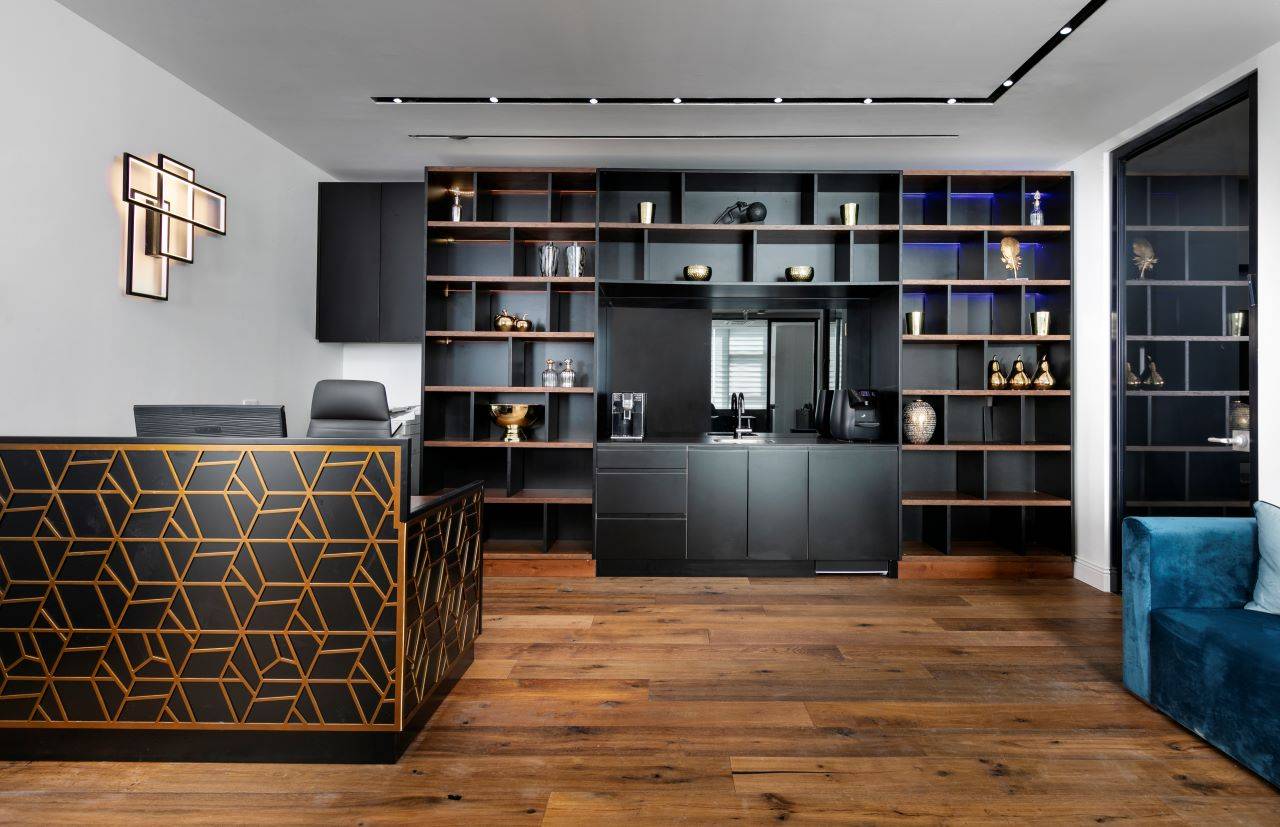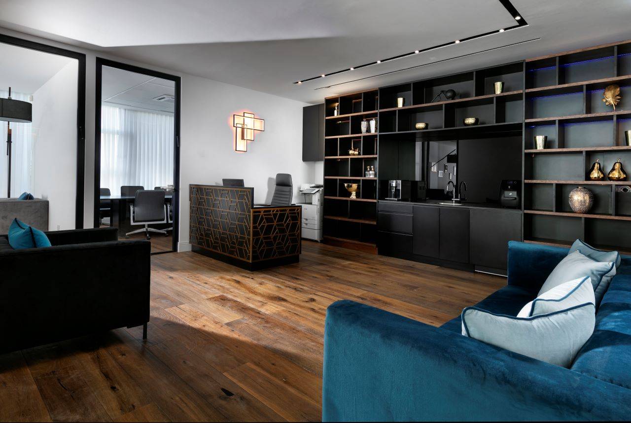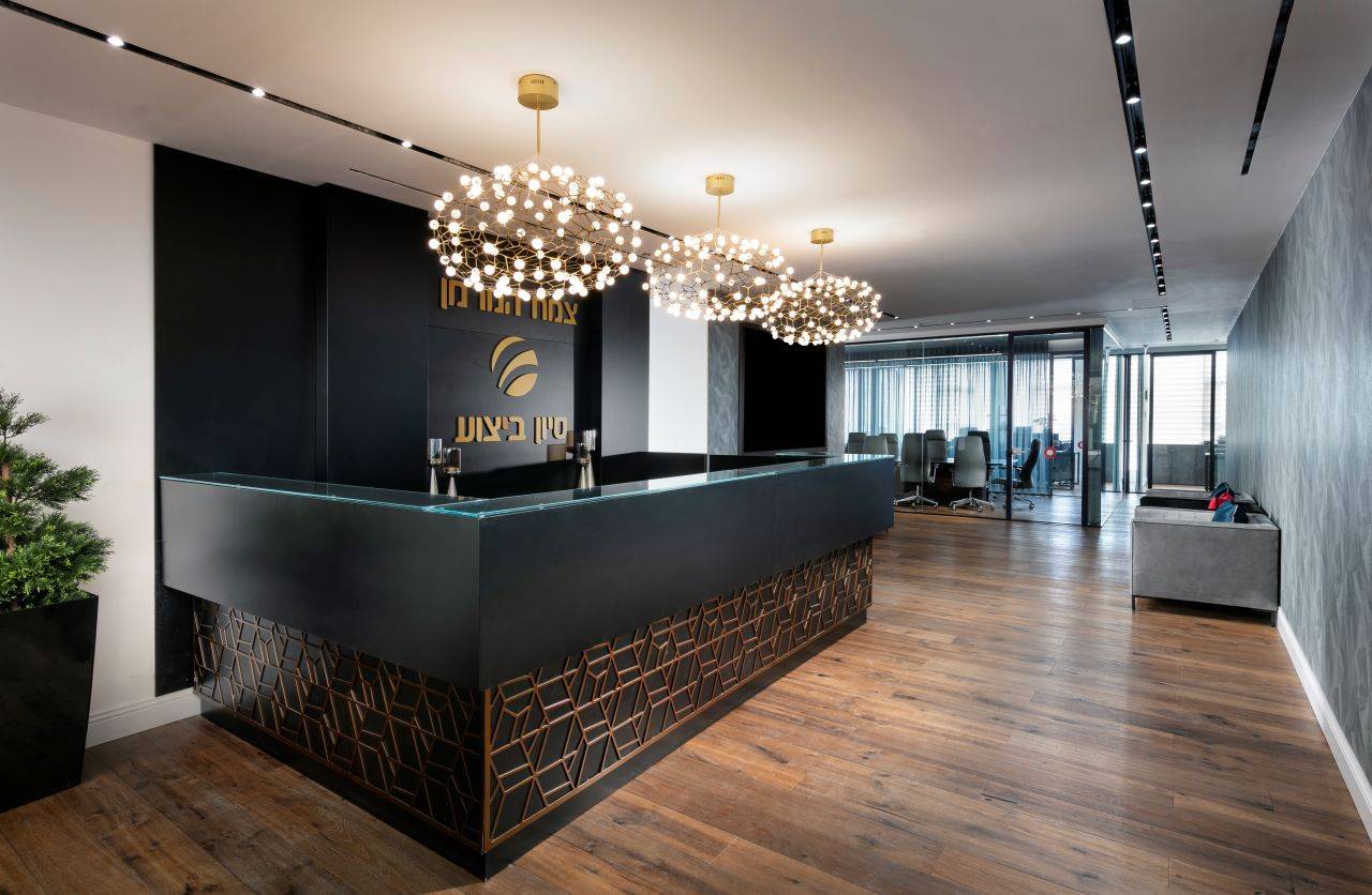 החלל כולו רוצף בפרקט אלון תלת־שכבתי בגימור מעושן, וכל פריטי הריהוט והנגרות ששולבו בעיצוב ללא יוצא מן הכלל תוכננו ייעודית עבורו על ידי עזריה־ברקוביץ. בכניסה הראשית למשרד ממוקם דלפק גדול בגוון חום ונגה כהה. מעליו משתלשלים שלושה גופי תאורה תלויים, כשמוטיב המשרבייה שמעטר את הדלפק הוא העתק של מוטיב המשרבייה של גופי התאורה. פינת ההמתנה שבהמשך עוטה מראה של סלון אלגנטי, המשלב חיפוי בטפט כחול עם נגיעות זהובות, כורסאות וספה רחבת־ממדים בריפוד טקסטיל קטיפתי אפור וכורסה נוספת בריפוד קטיפה שחור.