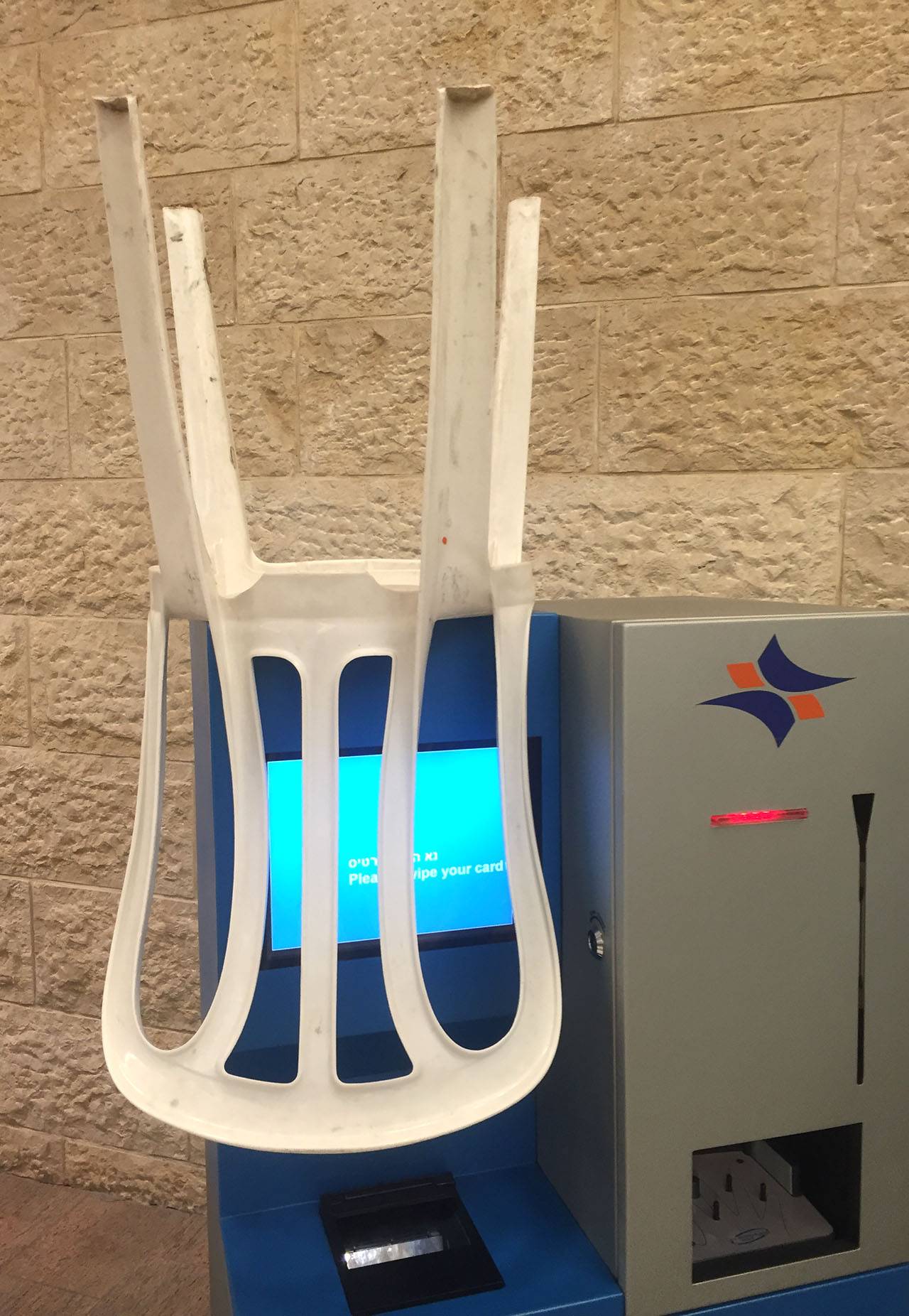ההשראה למנורה הגיעה בכלל מהתמונה למעלה: כשחזרתי מאיזו טיסה והכיסא הזה היה על המכונה לקריאת הדרכונים כדי שנבין שהיא לא עובדת… אפרופו שדות תעופה ואפרופו הומור