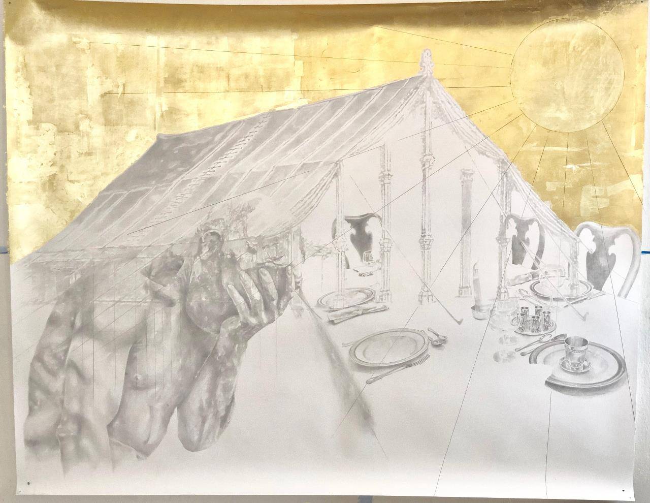 פיזי, פעם ראשונה מאז הקורונה. אני חוזרת לסטודיו, ויש כרגע עבודות גדולות שהן בתהליך התחלתי… המון סקיצות מהתקופה האחרונה, וגם מהעבר הקרוב, שמצאתי אותן מעניינות. צילומים שהדפסתי ורשמים שכתבתי.