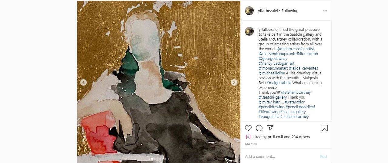 את טועה כאן. זה לא קמפיין במובן המקובל. גם סטלה מקרטני וגם גלריה סאצ׳י הציגו את זה באינסטגרם באופן מאוד מפרגן ונדיב. זה פרויקט פיור אמנות מדהים ומרומם, שכולנו שמחנו לקחת בו חלק. זאת חשיפה מדהימה. הפרויקט הוא אינסטגרמי – והוא נעשה באופן שכל כך מכבד אמנות ונותן במה מדהימה. יש חוויות שאין להן ערך כספי, הן קורות, מפתיעות והן מתנה מוחלטת לכולם. העבודה נשארה אצלי למזכרת