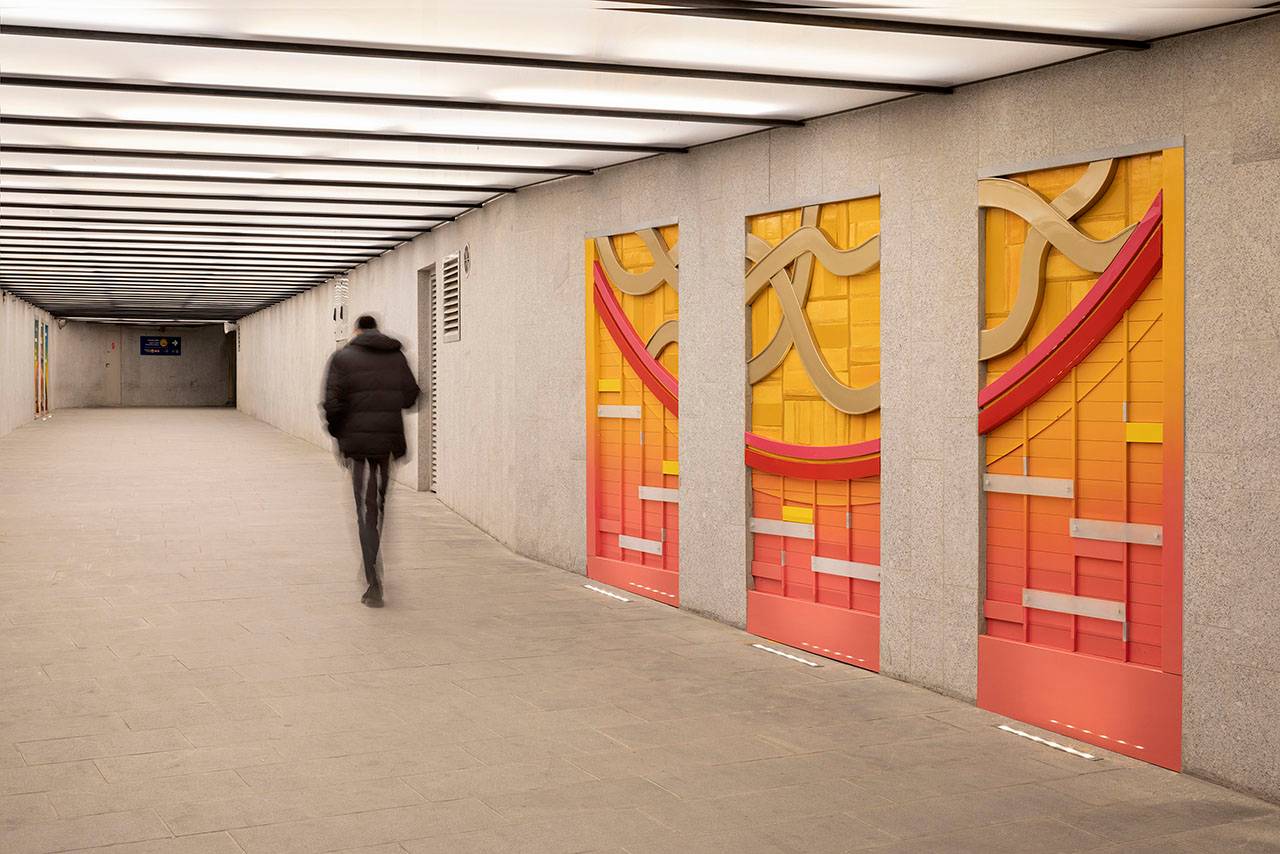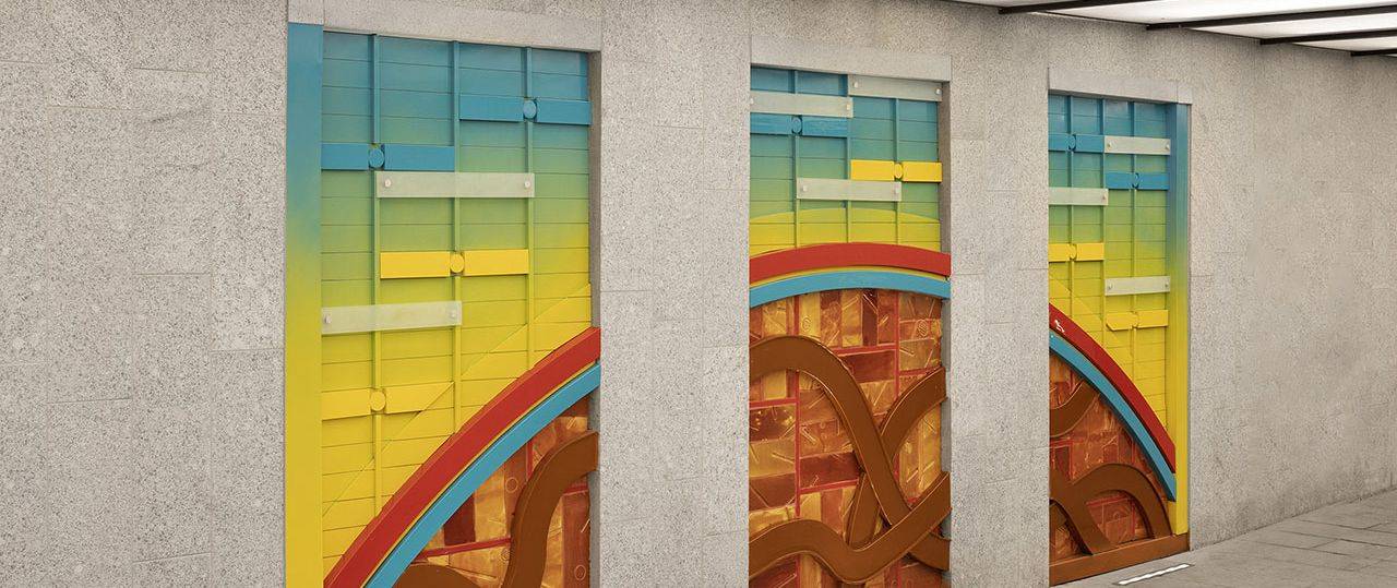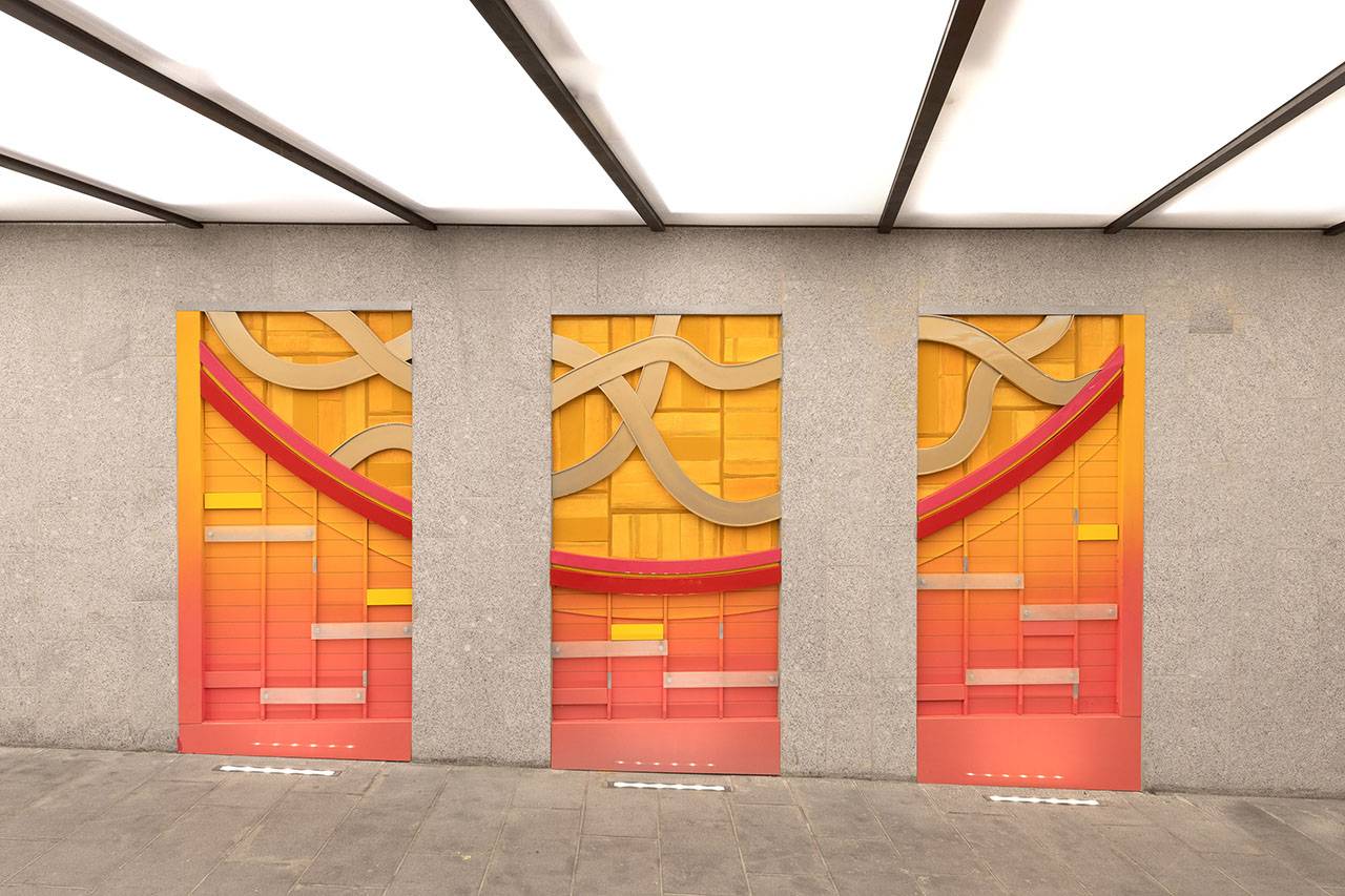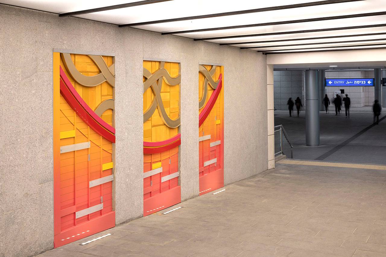 כניסה (מזרח), יציאה (מערב): אלומיניום צבוע, קרמיקה, זכוכית חלבית, מנטים, 2019. אוצרת: איה מירון, מוזיאון ישראל, ירושלים. פרויקט הכניסה לעיר – חברת עדן, חברה לפיתוח כלכלי בירושלים. יוזמה וניהול: חברת רן וולף, תכנון אורבני וניהול פרויקטים.