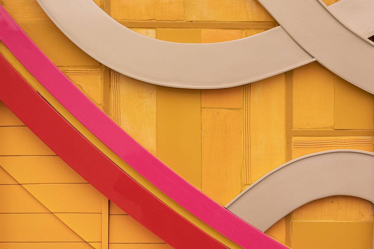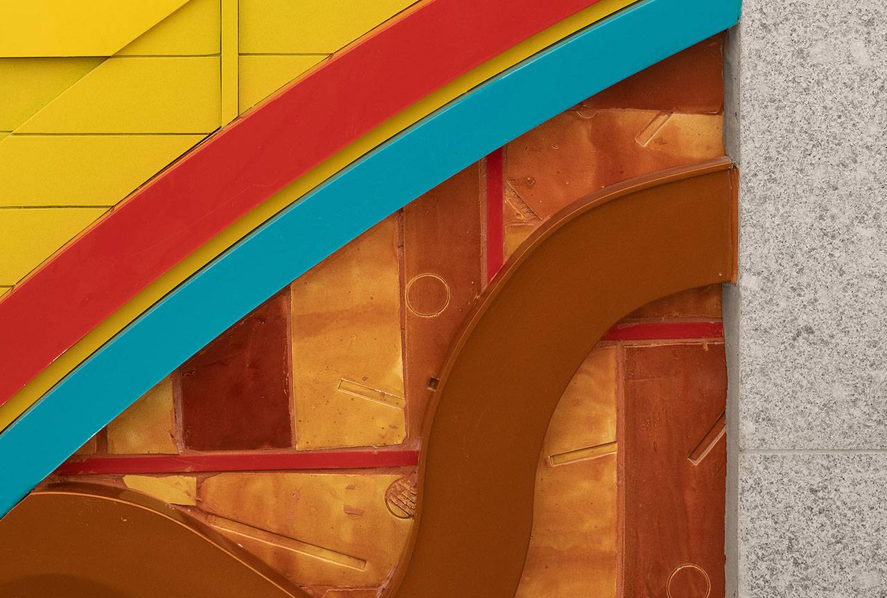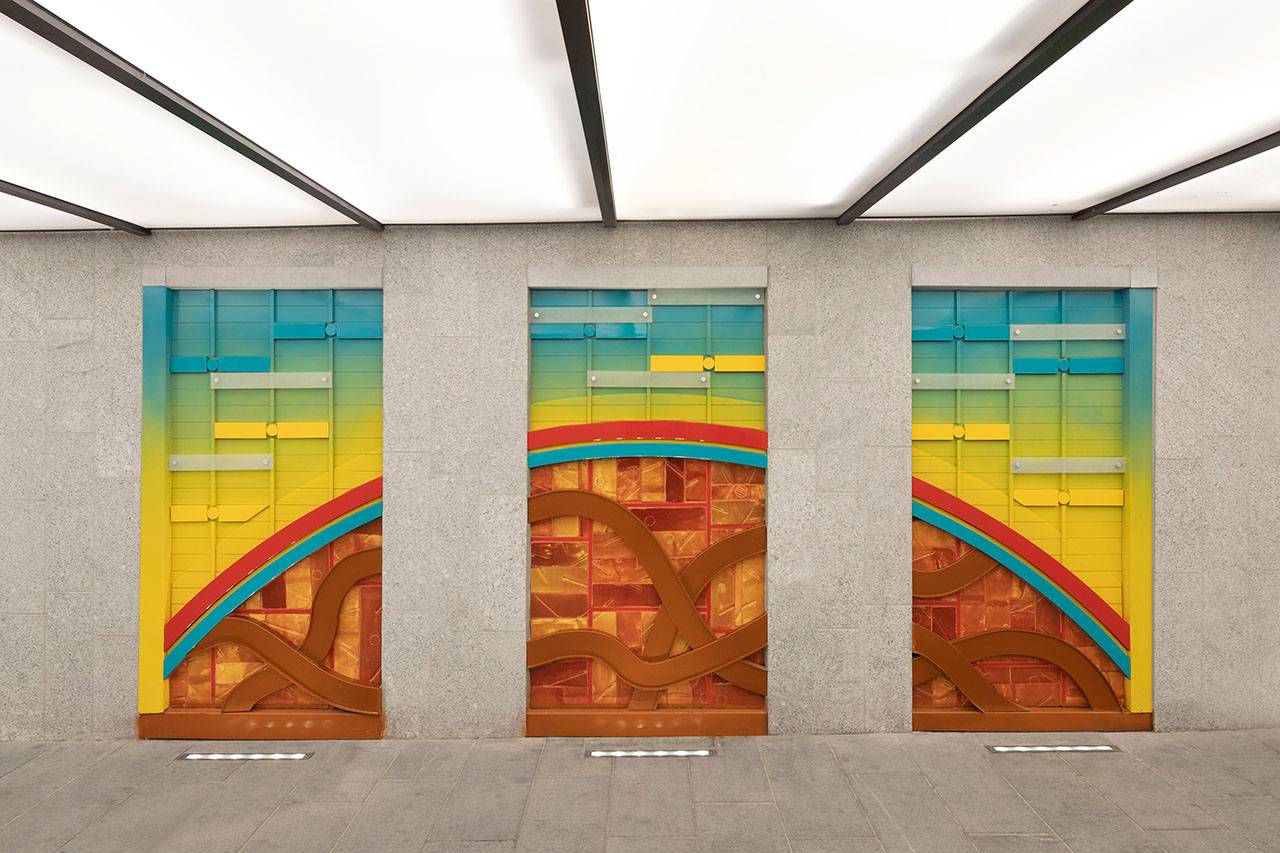 כניסה (מזרח), יציאה (מערב): אלומיניום צבוע, קרמיקה, זכוכית חלבית, מנטים, 2019. אוצרת: איה מירון, מוזיאון ישראל, ירושלים. פרויקט הכניסה לעיר – חברת עדן, חברה לפיתוח כלכלי בירושלים. יוזמה וניהול: חברת רן וולף, תכנון אורבני וניהול פרויקטים.