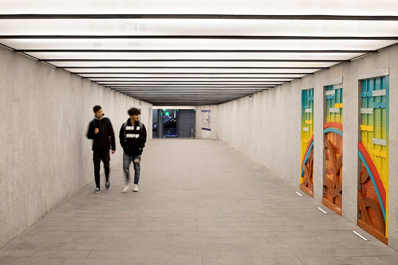 העבודה מתייחסת לרגע מעבר בין זמן ובין מקום. לא התחלתי ישר עם דימוי מוגדר, אבל הצורות החצי עיגוליות יכולות לכוון למחשבה על שמש, על זריחה ושקיעה, ומעבר כזה מהיום של הבחוץ למחשכי התחנה ולהפך. עם זאת, אלו עבודות שחולפים על פניהן די במהירות, כך שגם אם יש דימוי מוגדר יותר (כפי שהצילום שמתעד אותן מקפיא), המבט של הצופה בפועל, תוך כדי הליכה, ״מפרק״ את הדימוי הזה ומשאיר לצופה מרווח להשלים אותו בראש.