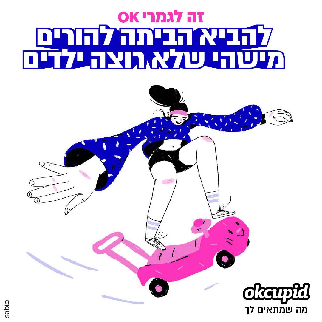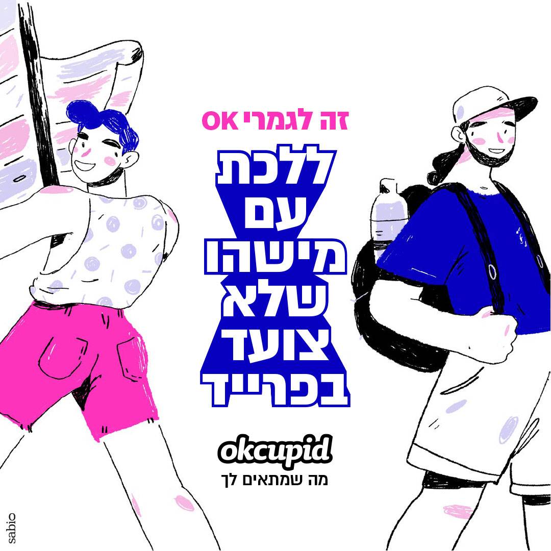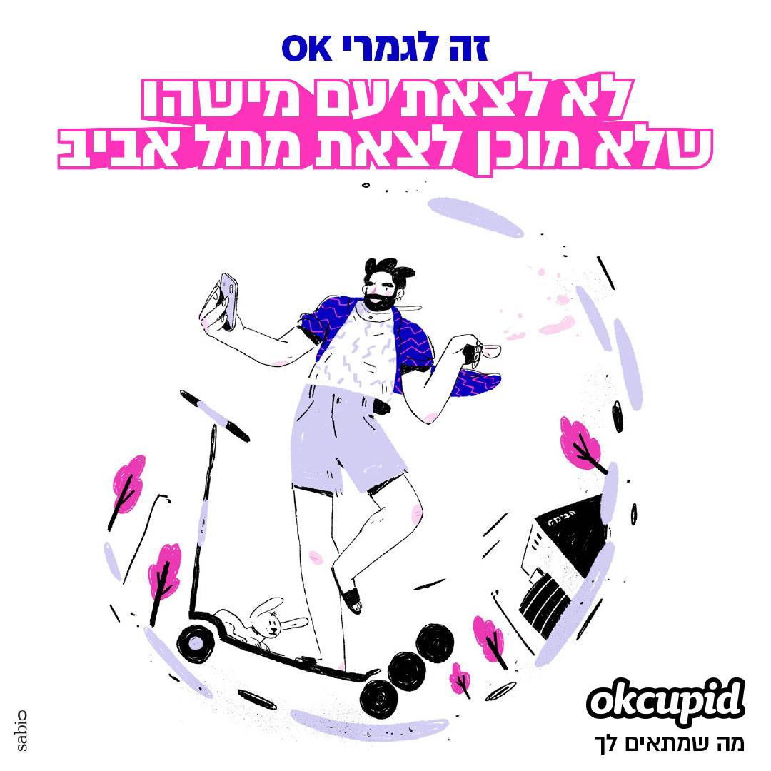 לכן, כשלפני חודש וקצת פנו אלי ממשרד הפרסום סאביו בבקשה לנסות לייצר קמפיין איור ואנימציות עבור אפליקציית ההיכרויות OkCupid, קמפיין שיפנה לקשת רחבה של אנשים וידגיש את מגוון האפשרויות שיש לחיבור בין בני זוג, מיד נמשכתי לעניין. אני אוהב לגעת באיור במצבים של תקשורת וזוגיות, ומבחינתי זה היה איזשהו המשך טבעי לאותה סדרת סתיו שיצרתי, ולאותו תהליך ארוך שאני נמצא בו של מחקר איורי על יחסים בין־אישיים. זו היתה הזדמנות להדגיש את המסר האישי שלי דרך האיור.
