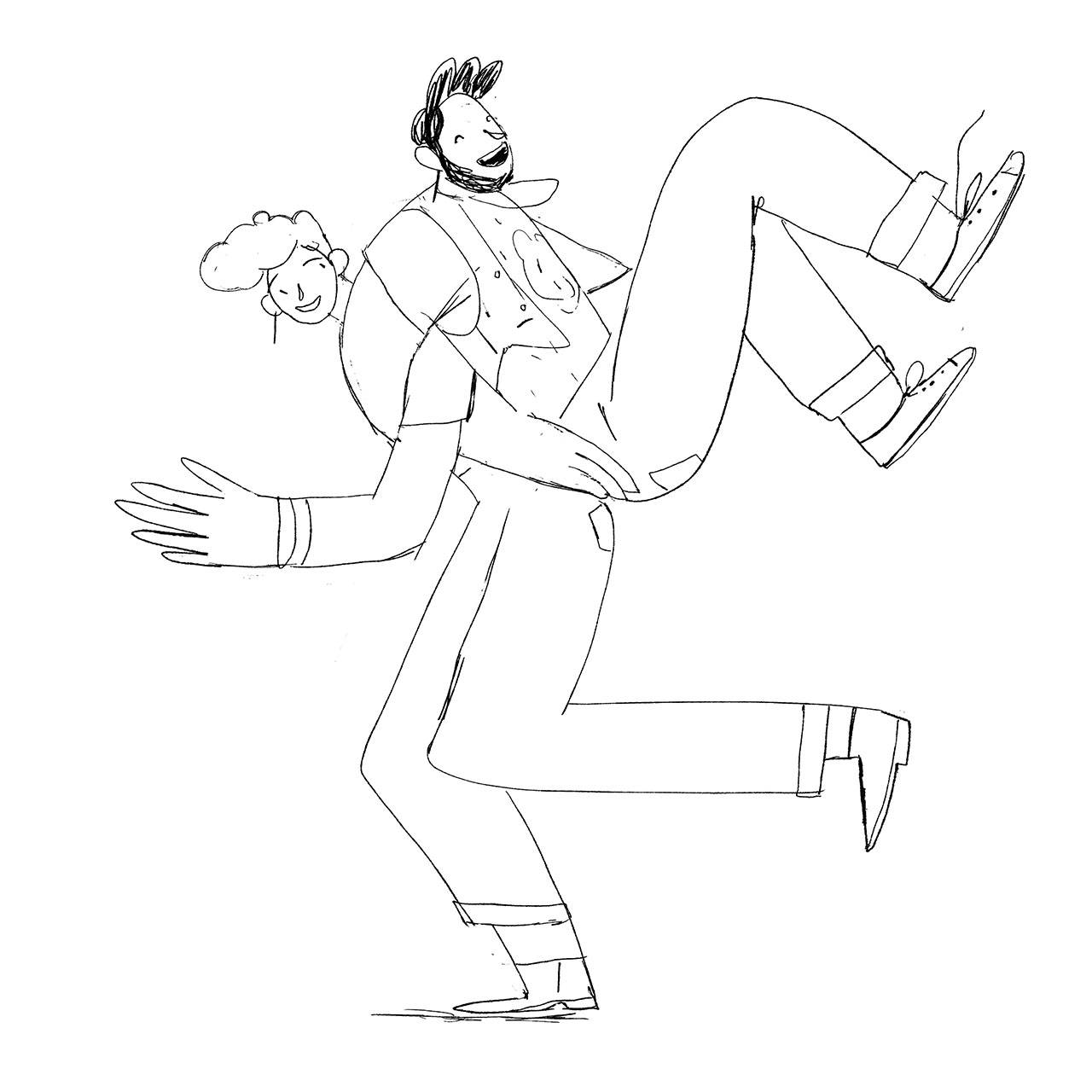 כדי לשחרר את המחסום הראשוני, התחלתי לאייר זוגות במצבי תנועה וריקוד שונים וזה מאוד עזר לזרימה של העבודה. תוך כדי הרישומים עלו רעיונות והתנועה והקלילות של הדמויות עזרו לי למנף את האיורים למקום שלבסוף הם הגיעו אליו. מה שהכתיב את האווירה זה כמובן פלטת הצבעים המצומצת של המותג שהפכה את האיורים ליותר שמחים ואווריריים.