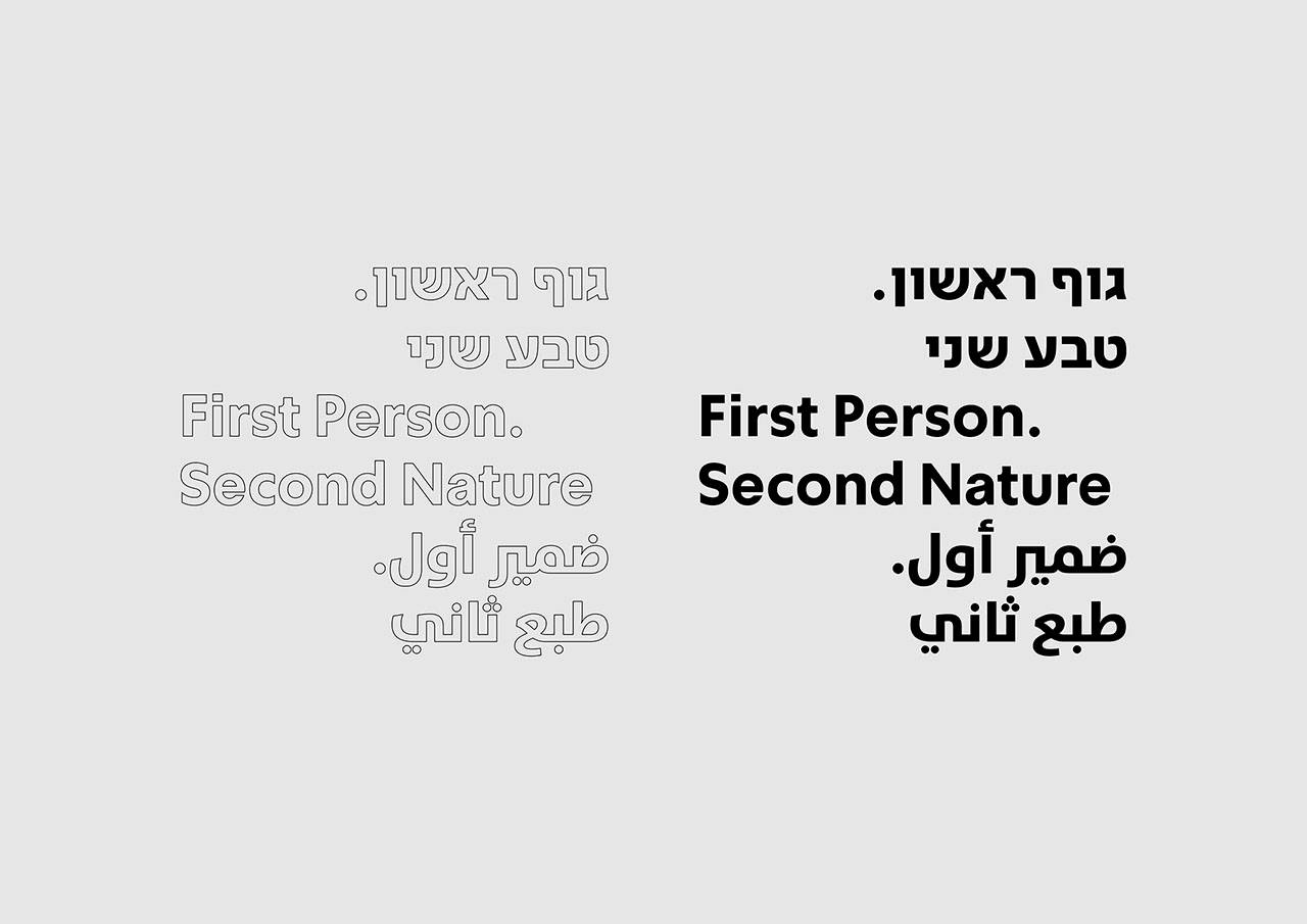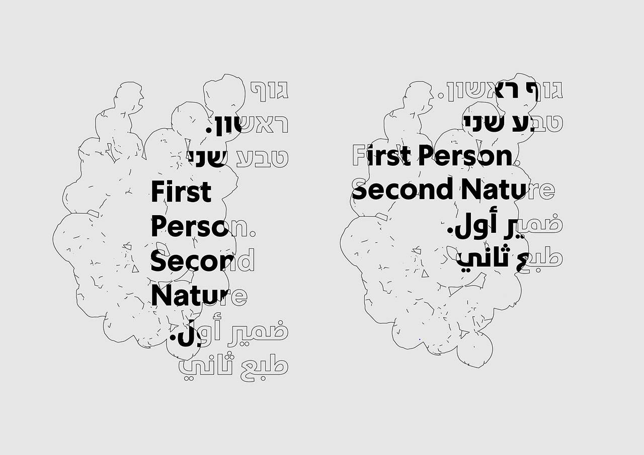 בשל הזמן הקצר והצורך לשתף בתהליך החשיבה והעיצוב את השותפים לתהליך, העדפנו להציג בתחילת התהליך כיוונים רבים, גם אם חלקיים, הן לשפת הביאנלה והן לשפת התערוכה. הזהות החזותית במקרה זה היא יותר טיפוגרפית ומבוססת על פירוקים שונים של הגופן (סימפלר) וחילוץ של קווי מתאר מינימליים שלו, כך שתתאפשר קריאה השל הכתוב. רישומי קו סכמטיים, כמו ציורי מערות שימשו כרפרנס במקרה זה. גם כאן עניינה אותנו הזיקה בין הגוף (האות המקורית) וקווי המתאר שלו. במקרה זה של האות עצמה.