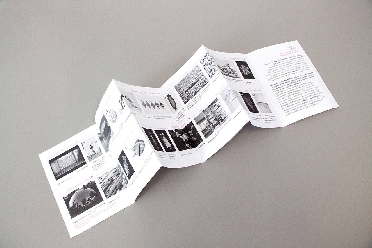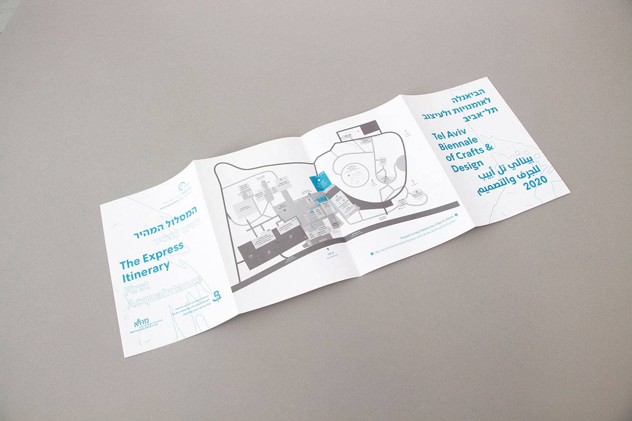 במקומות אחרים – בתערוכה עצמה, בדגלים ברחבי המוזיאון המסמנים את תוואי התערוכה, ובכניסות לחללים, נעשה שימוש בקווי המתאר של האוביקטים המצולמים ללא הצילום עצמו. אוביקט מאתגר נוסף היה עיצוב סדרה של ברושורים לחלוקה – כלליים בשפות שונות שהכילו מידע אודות הביאנלה ומפת התמצאות סכמטית, וברושורים עם הצעות למסלולים אצורים לאורכי זמן שונים (שעה עד שלוש שעות).