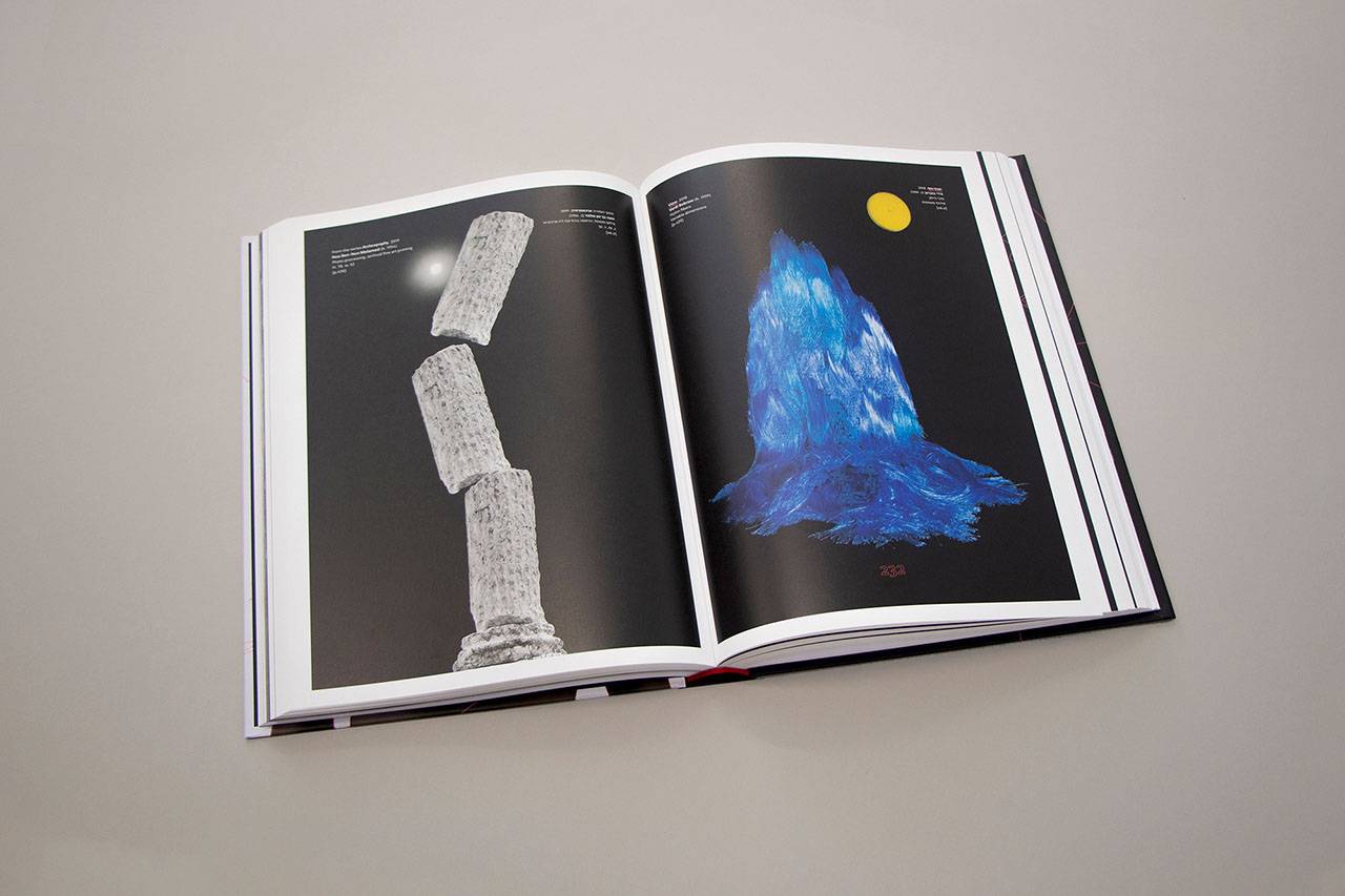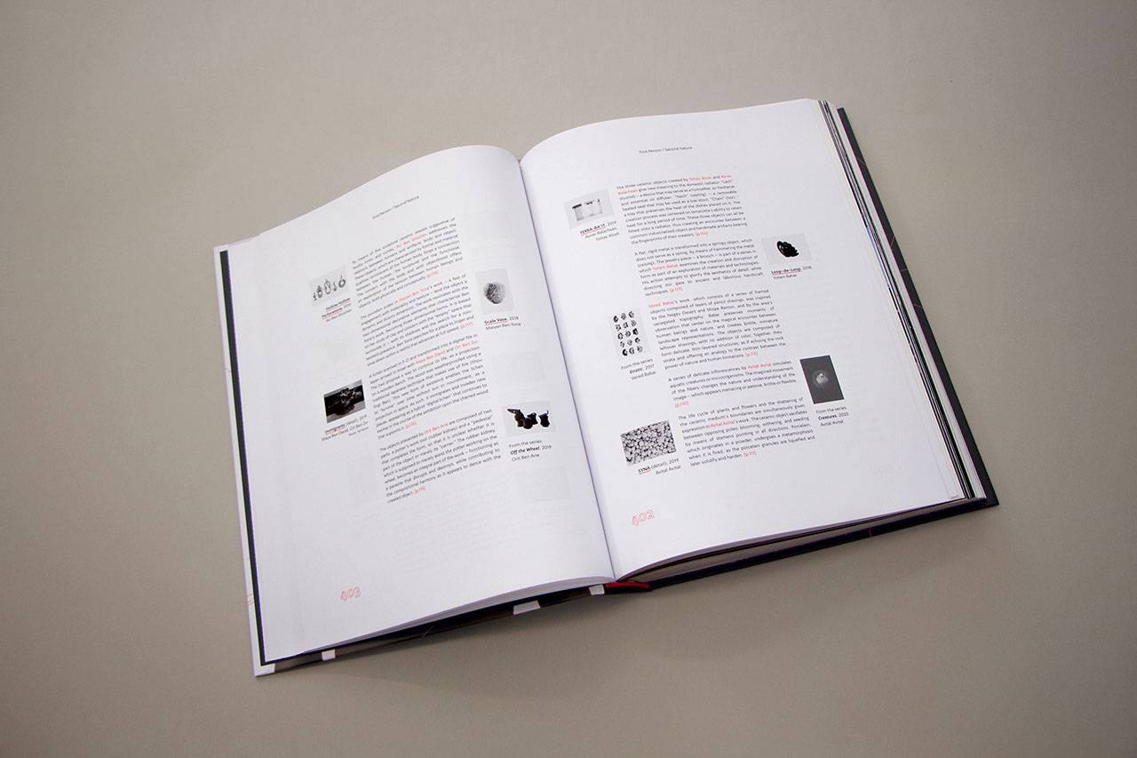 חיבור בין אופני הצילום הללו מתקיים גם בכריכת הקטלוג, שבה השתמשנו בתמונה של אובייקט מצד אחד (עבודה אופיר זמודזיאק) ובתמונה של אוביקט על דמות מצד שני (עבודה של ליטל גולדנברג). כך, שבקטלוג עצמו נעשתה התאמה לכל המרכיבים החזותיים שלעיל.