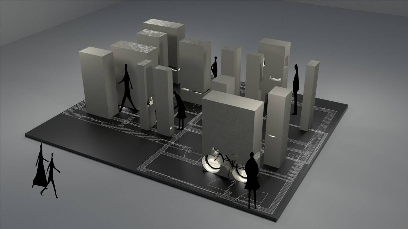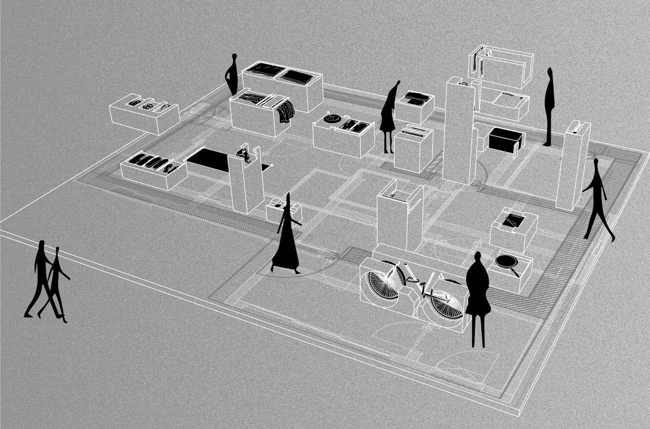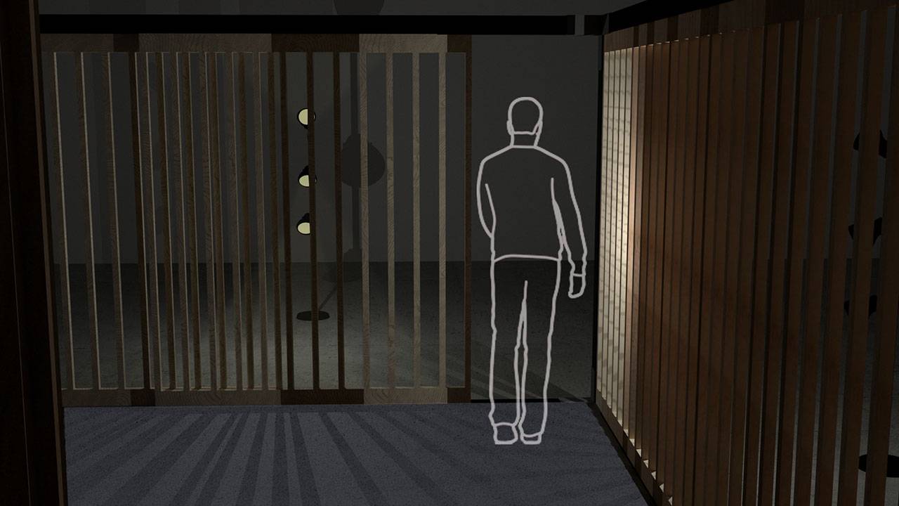 הרעיון מקבל בחלל ביטוי באמצעות עמודים קבועים, שכל אחד מהם מעוצב ״מסביב״ לחפץ. על הרצפה משורטטים החללים שבהם שהתה בתקופת הבידוד, כשהקבוע הופך לארעי והארעי לקבוע.