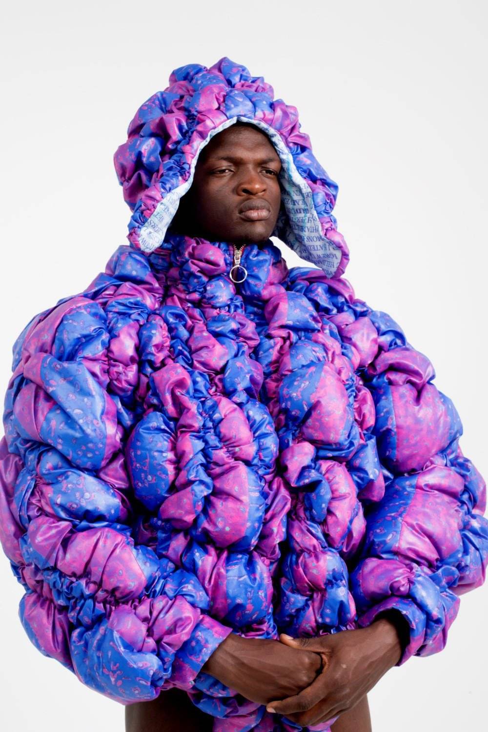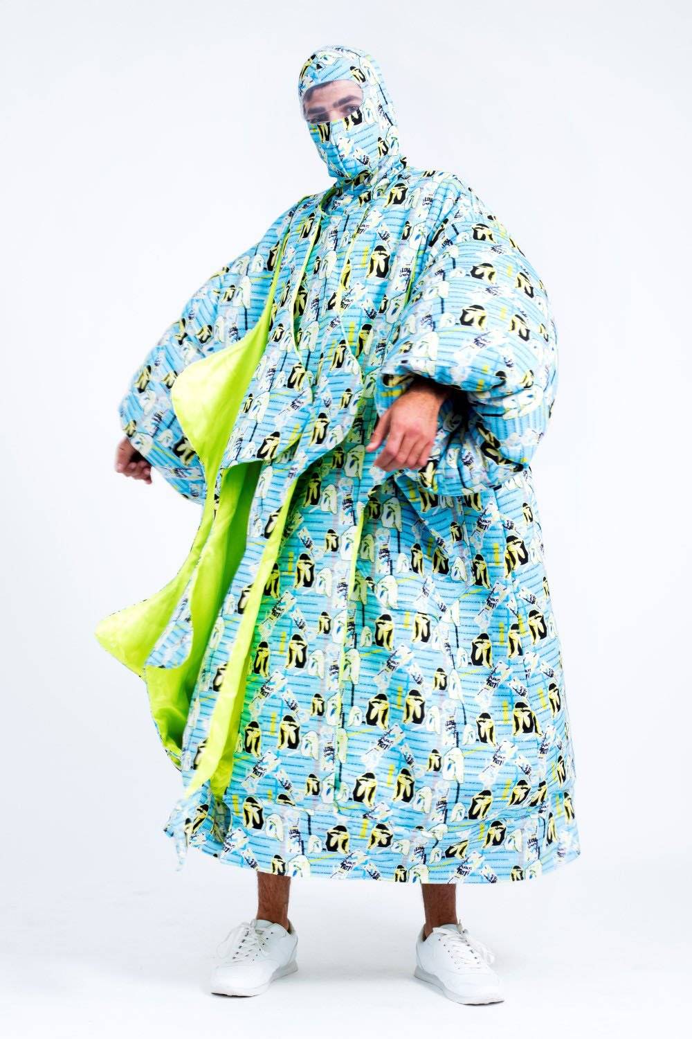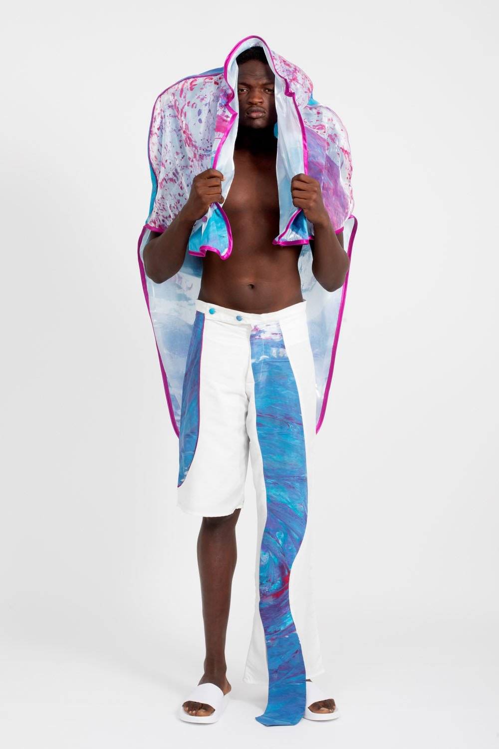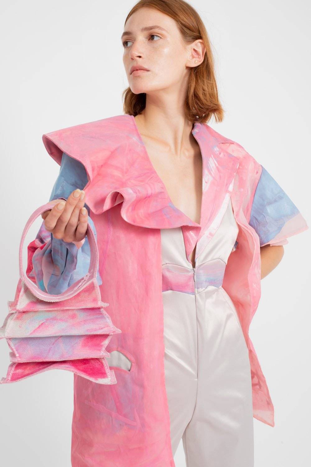 יצרתי מערכות לבוש ותיקים שמצד אחד כמו מרחפים בתנועה בלתי נשלטת, ומנגד פריטים המורכבים מצורות גיאומטריות המשקפים שיטתיות, חזרתיות ויציבות. צבעתי את הטקסטילים במזיגה נוזלית של צבע כדי שהצבעוניות תהיה משתנה ובלתי צפויה.