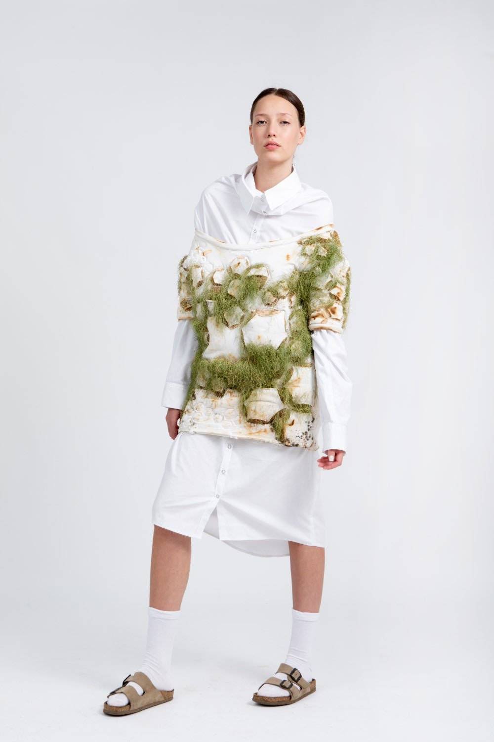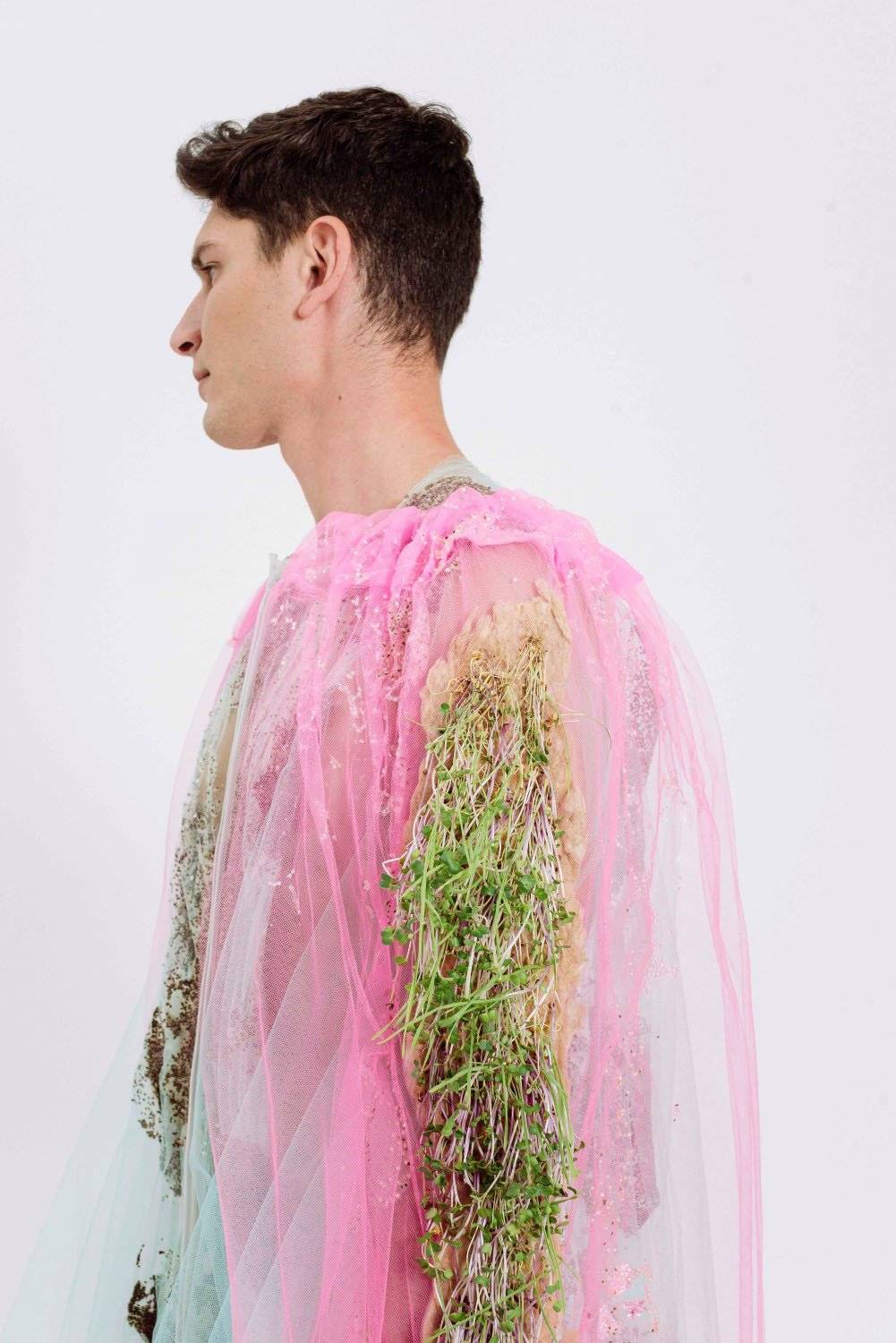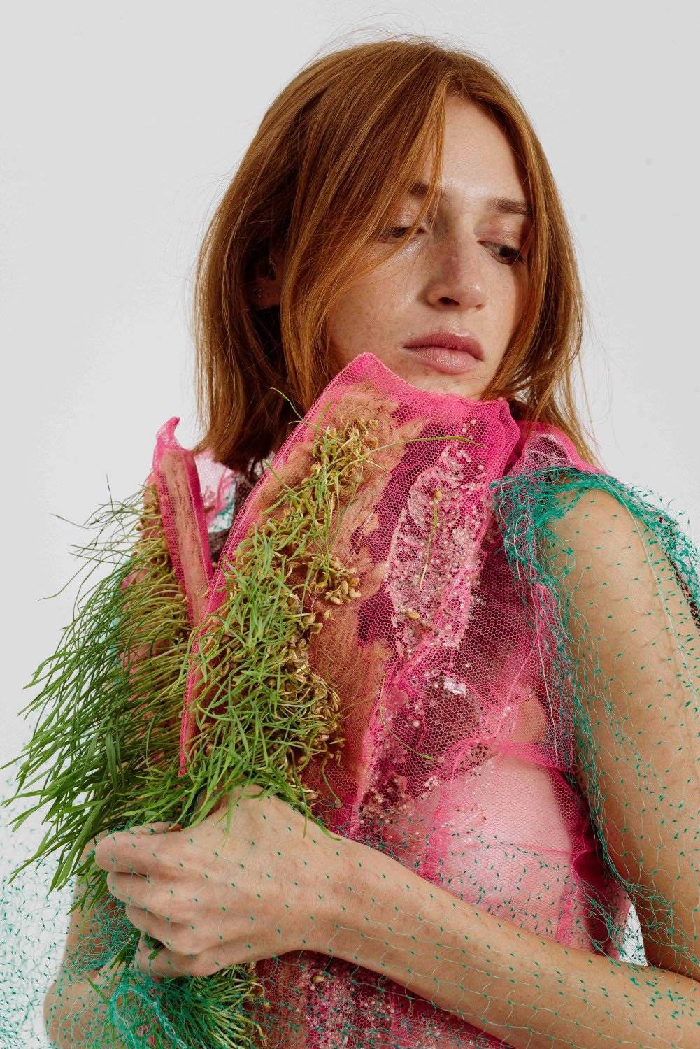 הדגמים משלבים שכבות של פרטי לבוש רחבים וגדולים ומנגד קטנים ומכווצים, שספק מגנים ועוטפים את אותה ילדה שהייתי, ספק חובקים וחונקים ומקשים עליה לגדול ולהתפתח. עיצבתי דפוסים בהשראת המשושה של הכלורופלסט, צבעתי בדים בקפה כסמל לעולם המבוגרים ובו זמנית מזכיר אדמה ובוץ, ולבסוף הנבטתי בתוך הטקסטיל עצמו גידולים שספק צומחים ומשגשגים על קרקע פורייה, ספק נהדפים ונחנקים בתוך הבגדים.