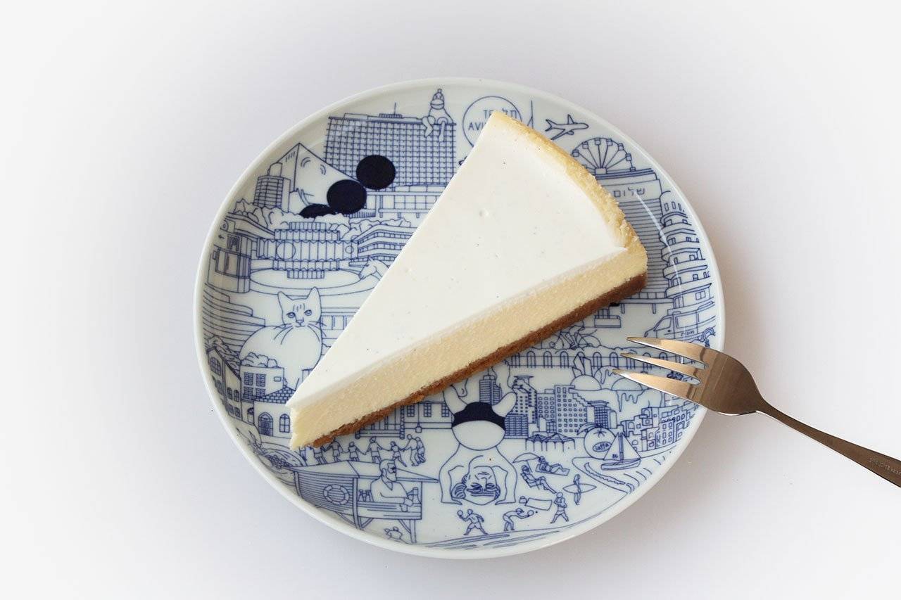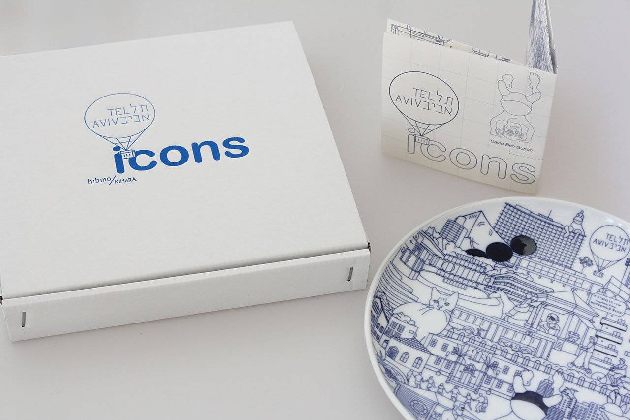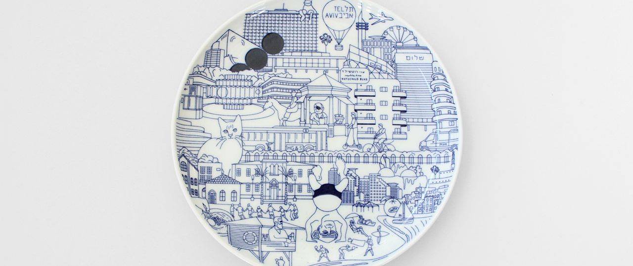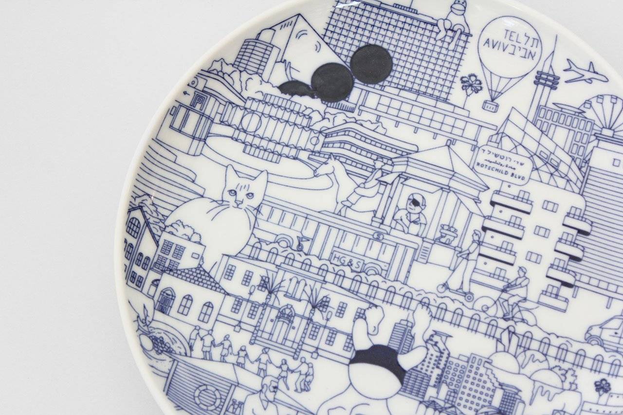 TLV אייקון, צלחת פורצלן מעוטרת באיורים מינימליסטיים־מעודנים של אייקונים תל אביביים, נולדה אצל פראג רוקח בהשראת אחותה היפנית, טוקיו־אייקון, לציון עשור לחנות־גלריה היבינו בתל אביב