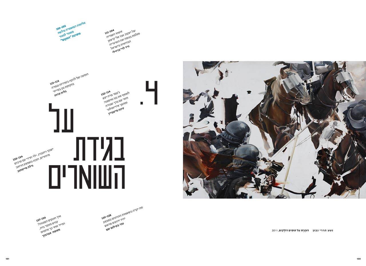 הפונט של הטקסט הרץ גדול מדי (אני מצמצם את גודל הרווח בין השורות, אבל לא מעז להקטין את גודל הפונט). כך גם הכותרת, גודל 30? 30! צועקות הכותרות את שהלב ממאן לקבל, סימוני השוליים הולכים ומצטמצמים, מעולם לא עבדתי עם שוליים כל כך קטנים, והוויכוחים עם מייקי: ״בחייאת, מייקי, תשאיר לי קצת לבן…״, אני נחנק, אני לא נושם, אין פה רווחים, אין פה שוליים, מי יוכל לקרוא את זה.
