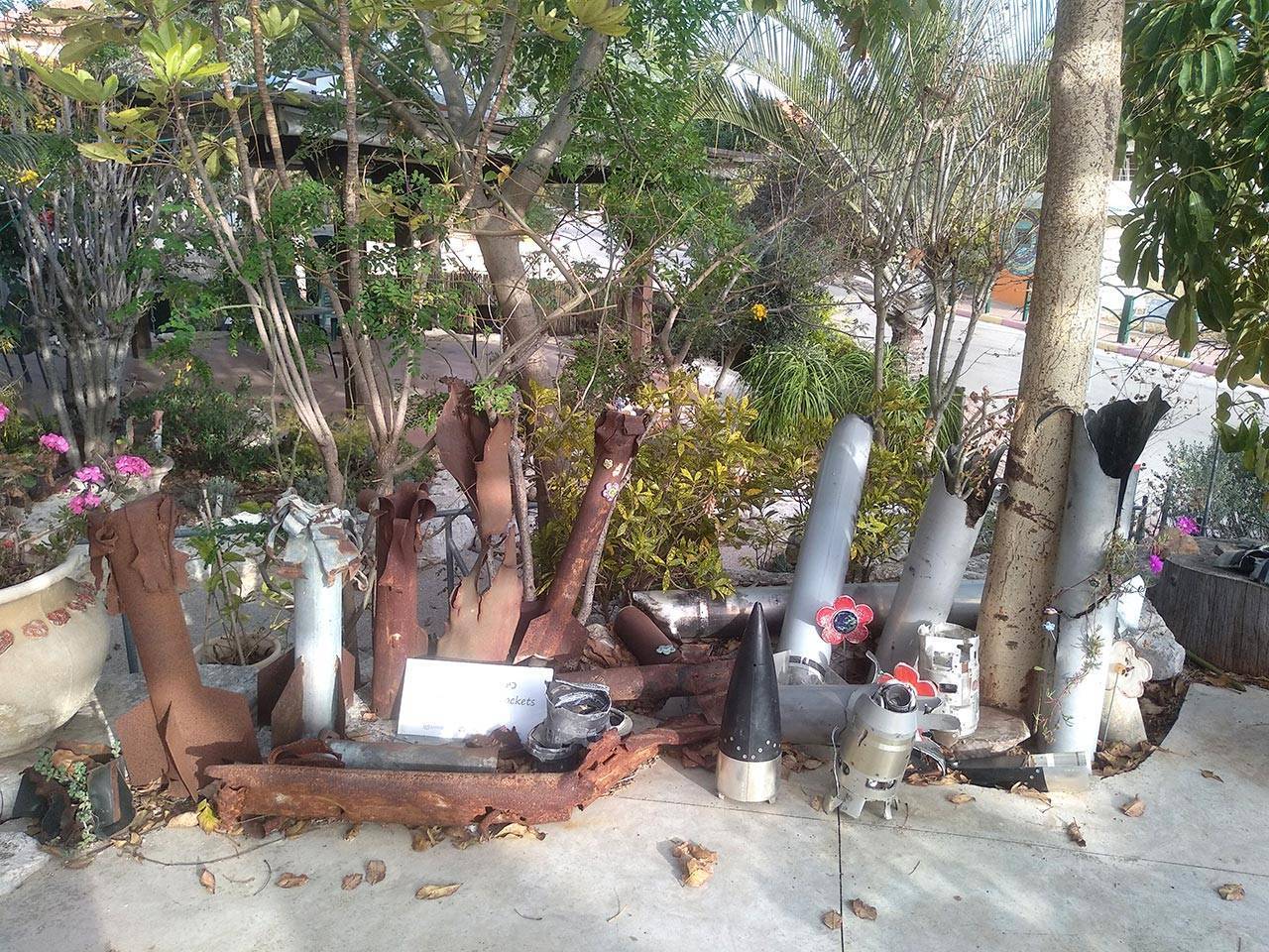 בחצר של מרכז המבקרים הנחתי כעשרה צינורות חלודים, פגרים של קסאמים ורקטות שנפלו ביישוב בחלק מטרור בלתי נפסק. בין צינורות הפלדה מטפסים צמחים ירוקים ומונחים פרחי קרמיקה.