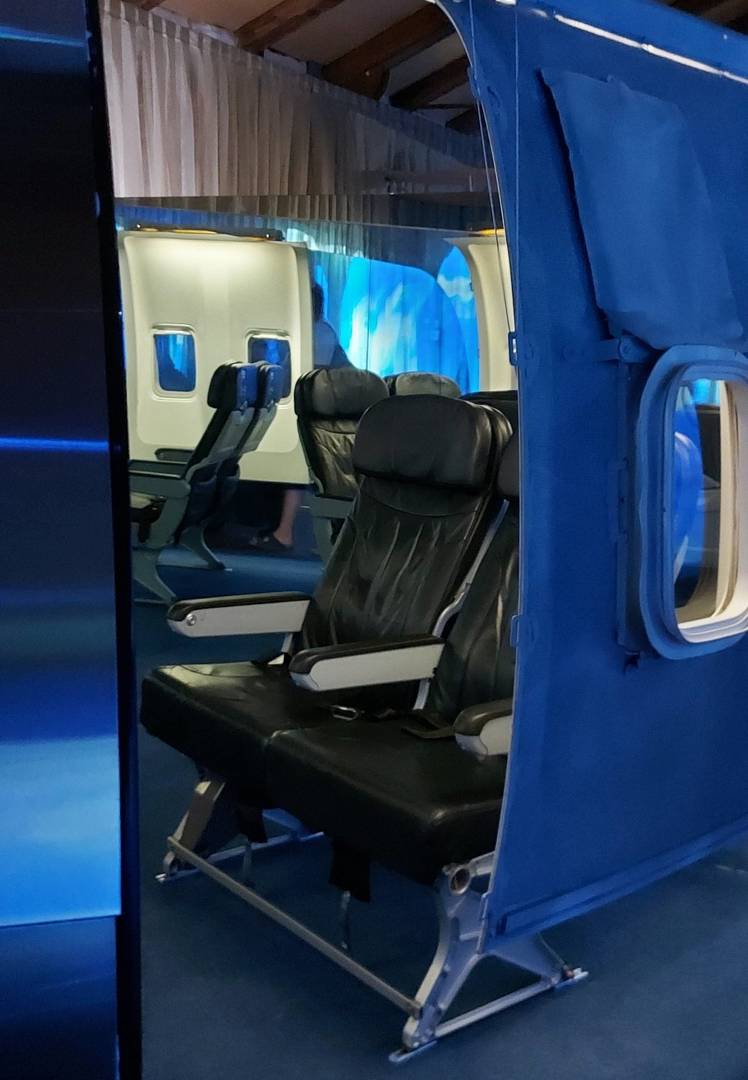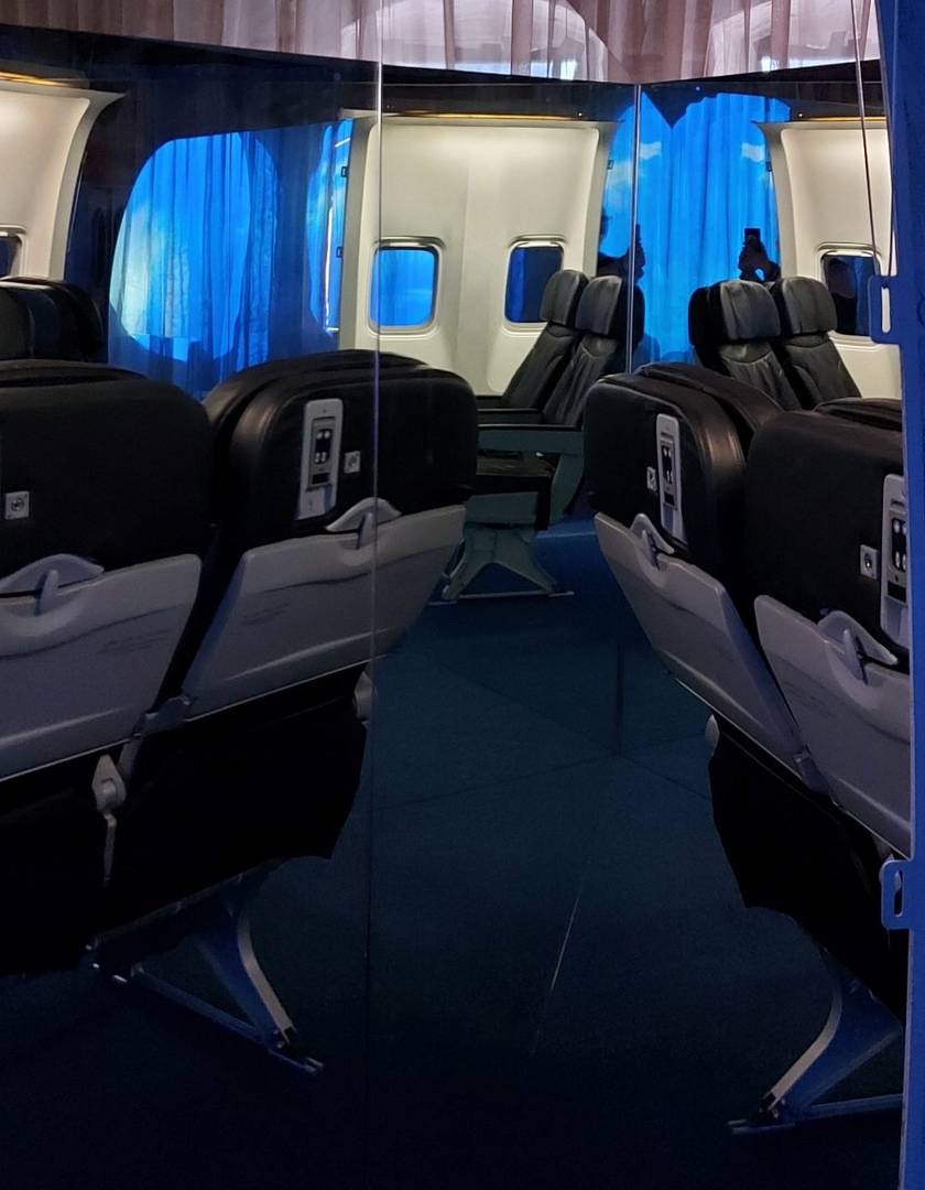 ואז מתגלה לעיניהם המראה. מדובר במראה הניצבת מול עיניהם, במקום שבו היה אמור להיראות גב הכסא שלפניהם. מראה נוספת ניצבת מאחורי גבם, והן פונות בזווית זו לזו, ויוצרות טור אינסופי של השתקפויות. זו לא רק טיסה נדירה, היא אפילו פרטית. מה עוד נבקש?