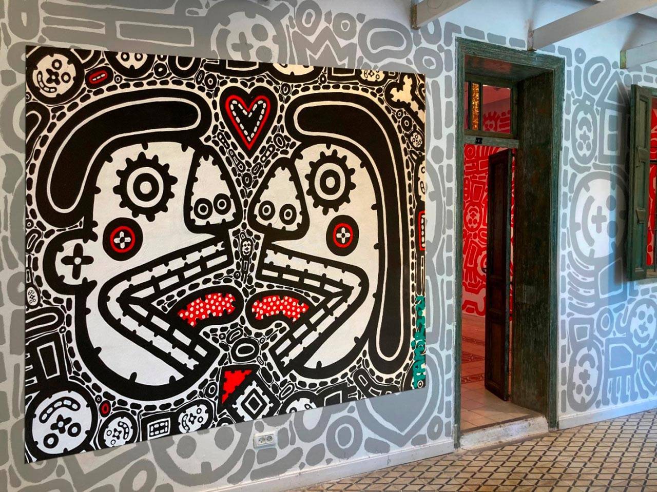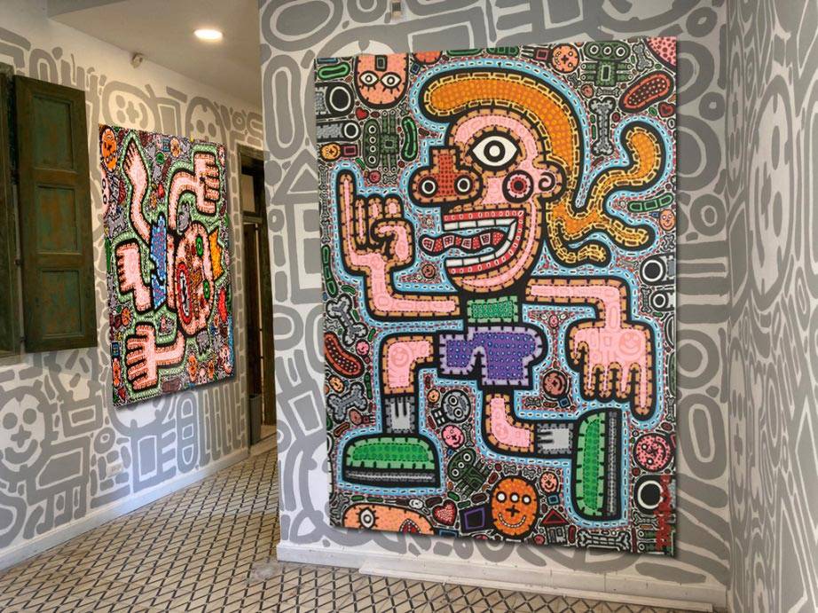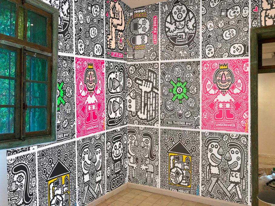 בחלל הכניסה הקהל נחשף לאוסף של עבודות ציור ומיצב היוצרים תחושה של טיילת עירונית. שלושת החללים הבאים מיוצגים על יד שלושת האלמנטים של רוח אש ומים. רוח הוא חלל יומן קורונה המכוסה טפט ייחודי מודפס על קנווס ובו כ־80 ציורי יומן. חלל האש הוא חלל יומן מלחמה ובו פסל עצום הבנוי קרטונים צבעוניים בדמות טנק דו ראשי הדחוס בתוך חדר שכל קירותיו מצוירים באדום. חלל המים הוא חלל שקירותיו מצוירים בדמויות ששוחות במרחב שחור לבן כשמעליהן מוקרן יומן מאויר כחול בתנועה מעגלית סביב החדר, מלווה סאונד של שחיה הנותנת תחושה של כניסה לבריכת מים.