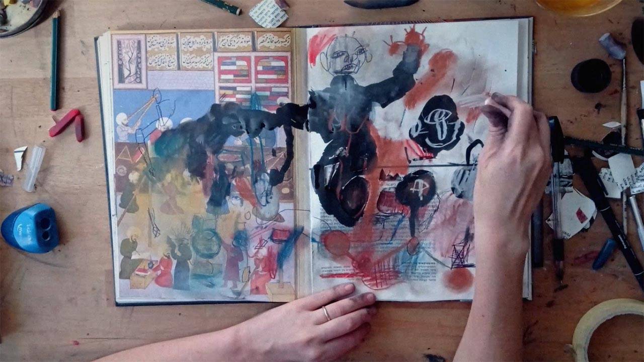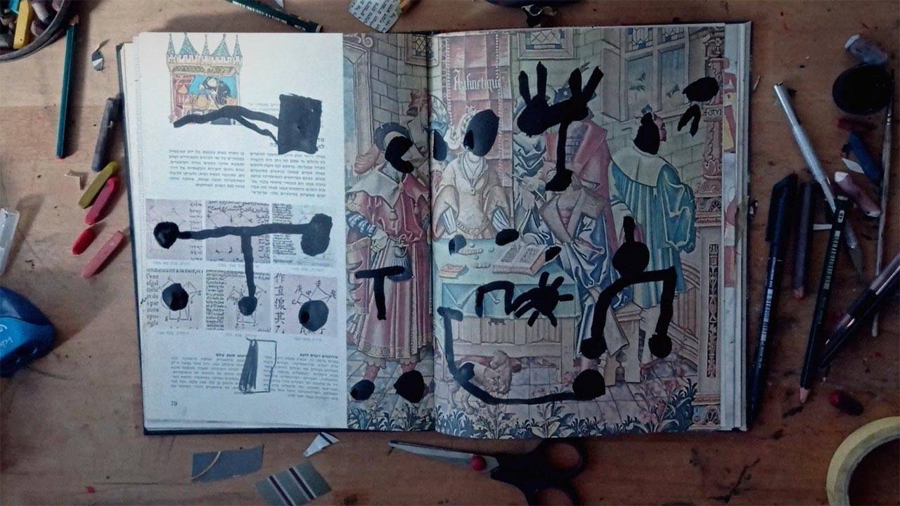 התאמנתי בלצייר ביחד אתו, להבין את המצע שהוא מאפשר ואת הקשר שבין הרישום לטקסט. הבנתי פחות או יותר באיזה חומרים אני רוצה להשתמש, מה עובד, מה פחות, בניתי מהלכים אפשריים במעברים בין הדפים, וגיליתי את האפשרות לחתוך בתוך הספר עצמו כך שייווצר סוג של קולאז׳ בין הרישום ובין האלמנט שמתגלה מן העמוד שמתחתיו.