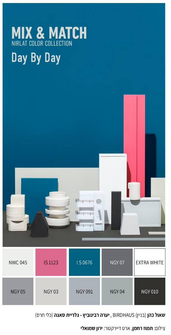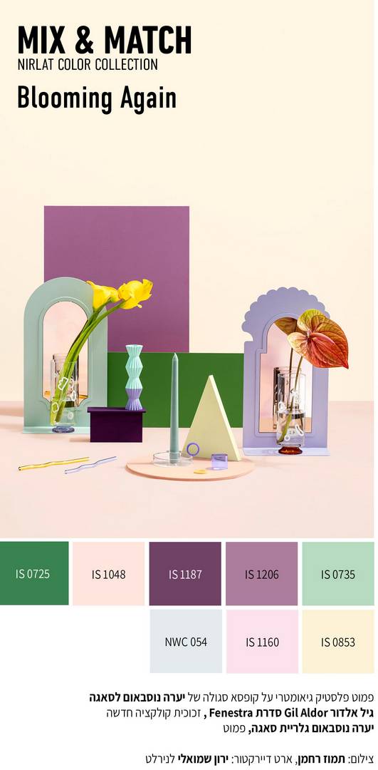 גם השנה, כחלק בלתי נפרד מחשיפת הקולקציה, גובשה סדרה של דימויים אמנותיים. הצילומים הייחודיים מחזקים את הצבעוניות של כל אחד מעולמות התוכן ומשלבים בהתאמה אובייקטים של מעצבים נבחרים שמציגים ביריד ב״עיצוב טרי״. במקביל, מעצבים רבים ביריד בחרו לשבור את חלל ״הקוביה הלבנה״ המוזיאלי והסטרילי, ומציגים את יצירותיהם על רקע צבעוני ומשמעותי של צבעי נירלט.