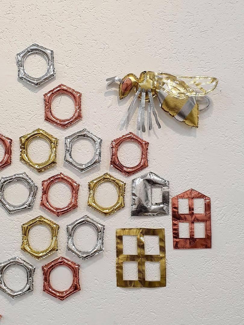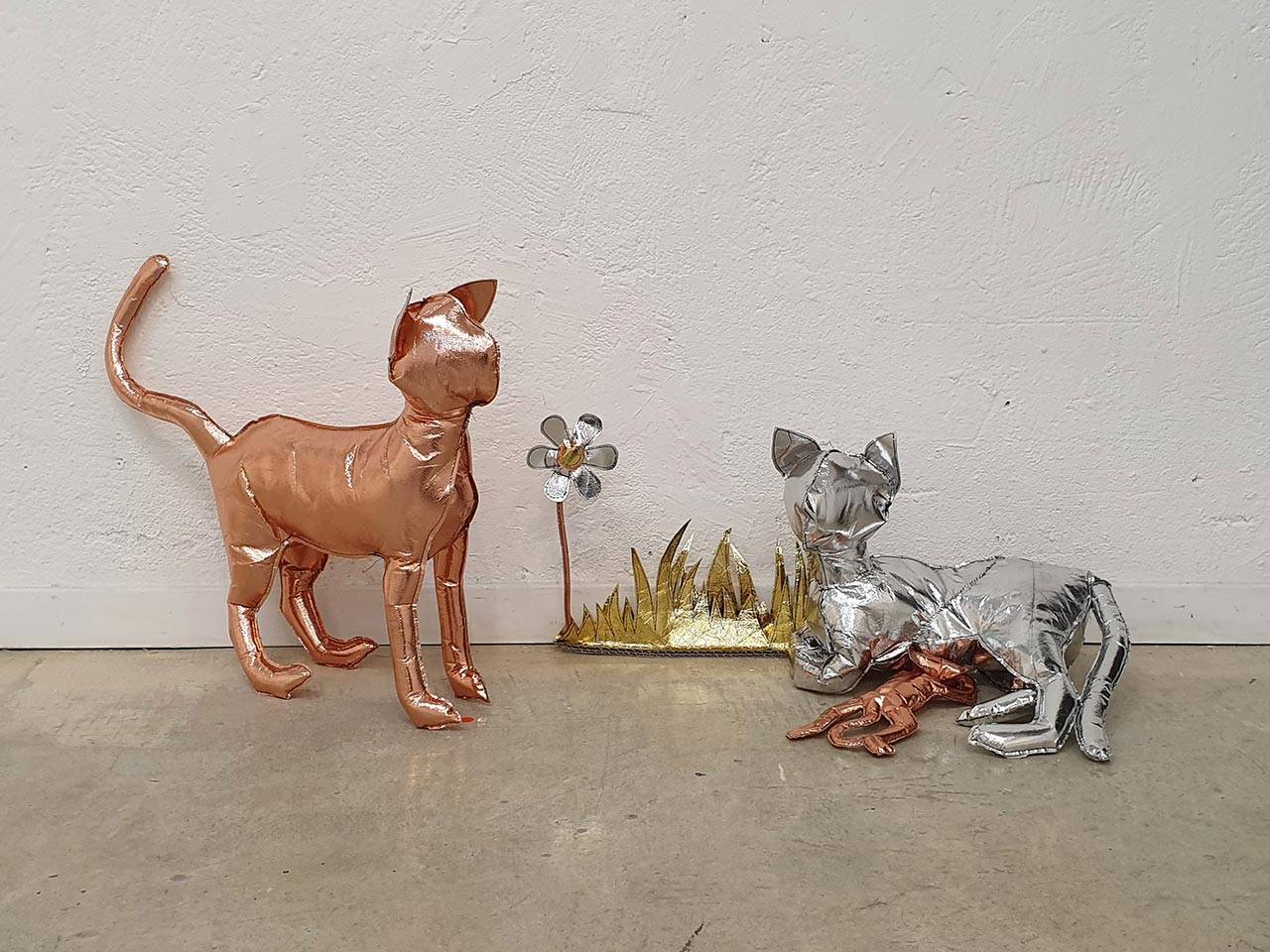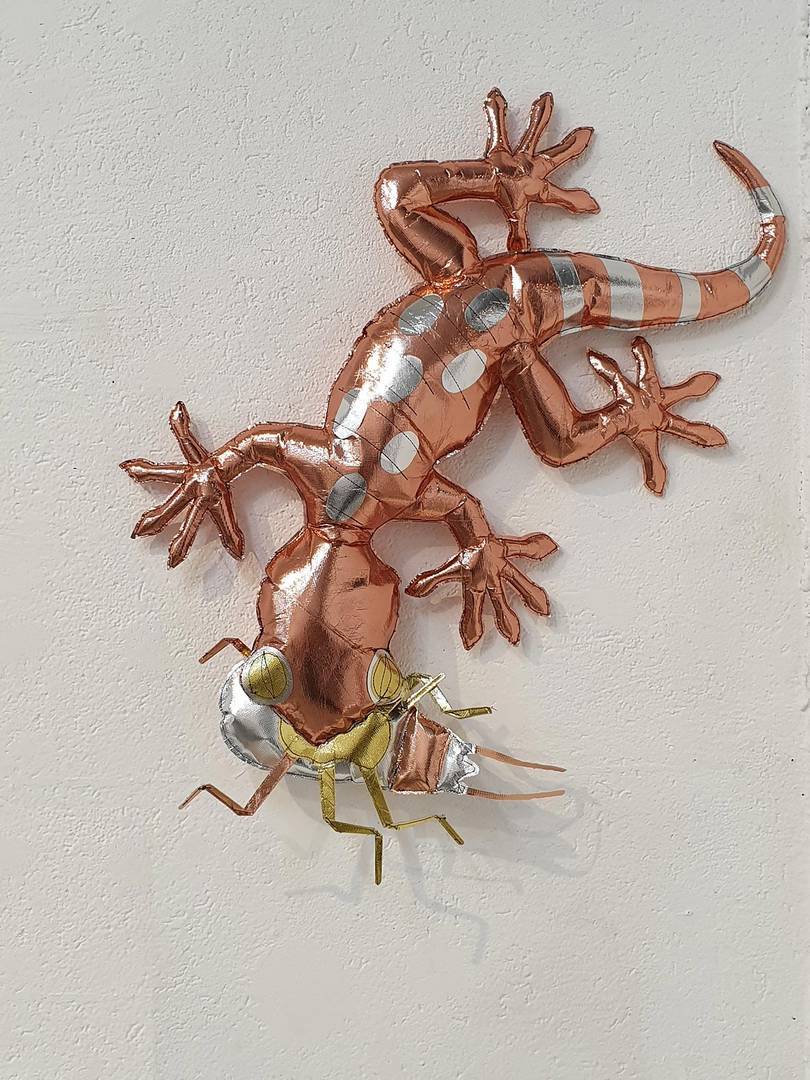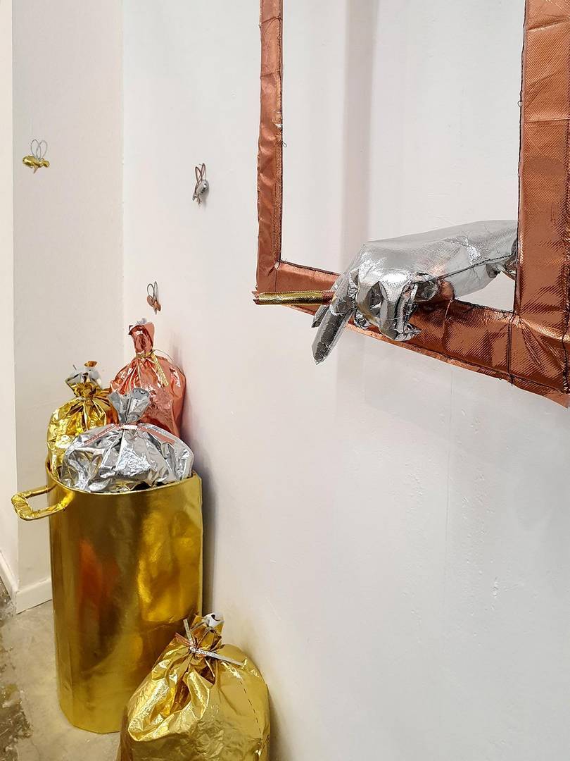 הכל התחיל בתחילת השנה בתערוכת יחיד אחרת שלי (במוזיאון הגיאולוגי רמת השרון- משובצת), שבה הצגתי תכשיטים מחומרים שונים שמצאתי בבית בתקופת הסגרים, ואחד החומרים היה שקית גולדה זהובה. יצרתי ממנה סט תכשיטים תלת־ממדיים מלאים במילוי סינתטי, שאמנם נראים כעשויים מזהב אך היו רכים. ומשם כיד הדמיון הטובה התחלתי ליצור ״ממתכות״ דימויי ענק (בשבילי, כי כצורפת הכל הוא די קטן)