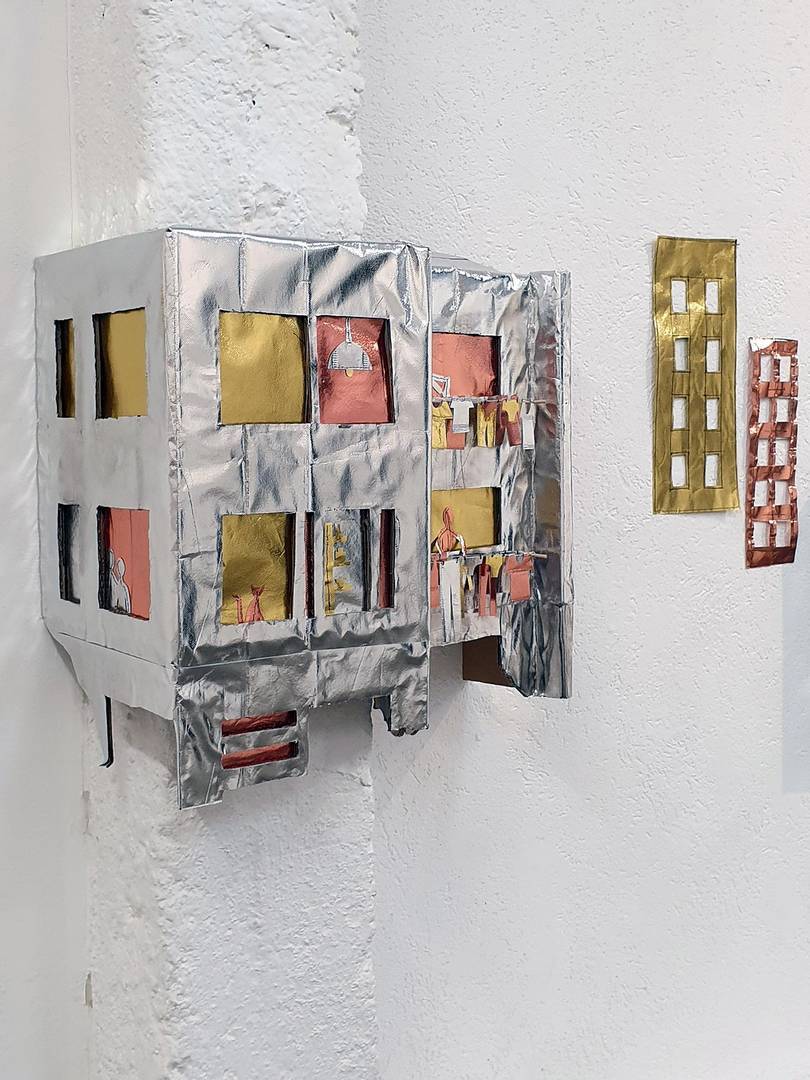 יעל: התערוכה היא של דימויים עירוניים, והעיר שלי היא תל אביב, אז אלו דימויים של תל אביב. כל מיני תמונות וזכרונות שהפכתי לאוביקטים תלת ודו־ממדיים שביחד יוצרים תמונת ענק של עיר. לדוגמה, חלון בלילה עם עשים מעופפים סביבו, פח זבל גולש עם חתולים, בניין עם חבלי כביסה מלאים… וזהו, לא מגלה יותר (-:
