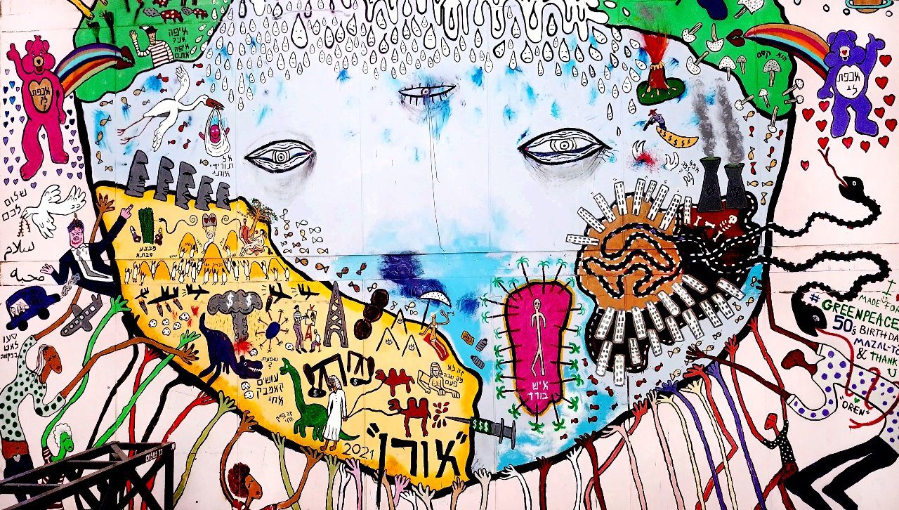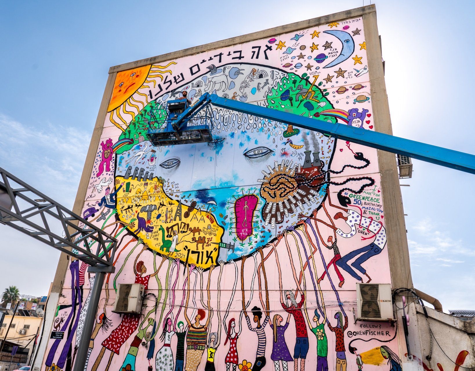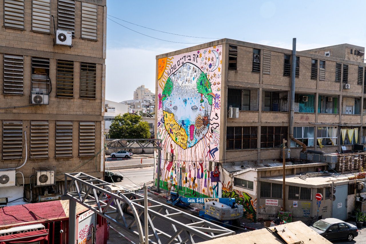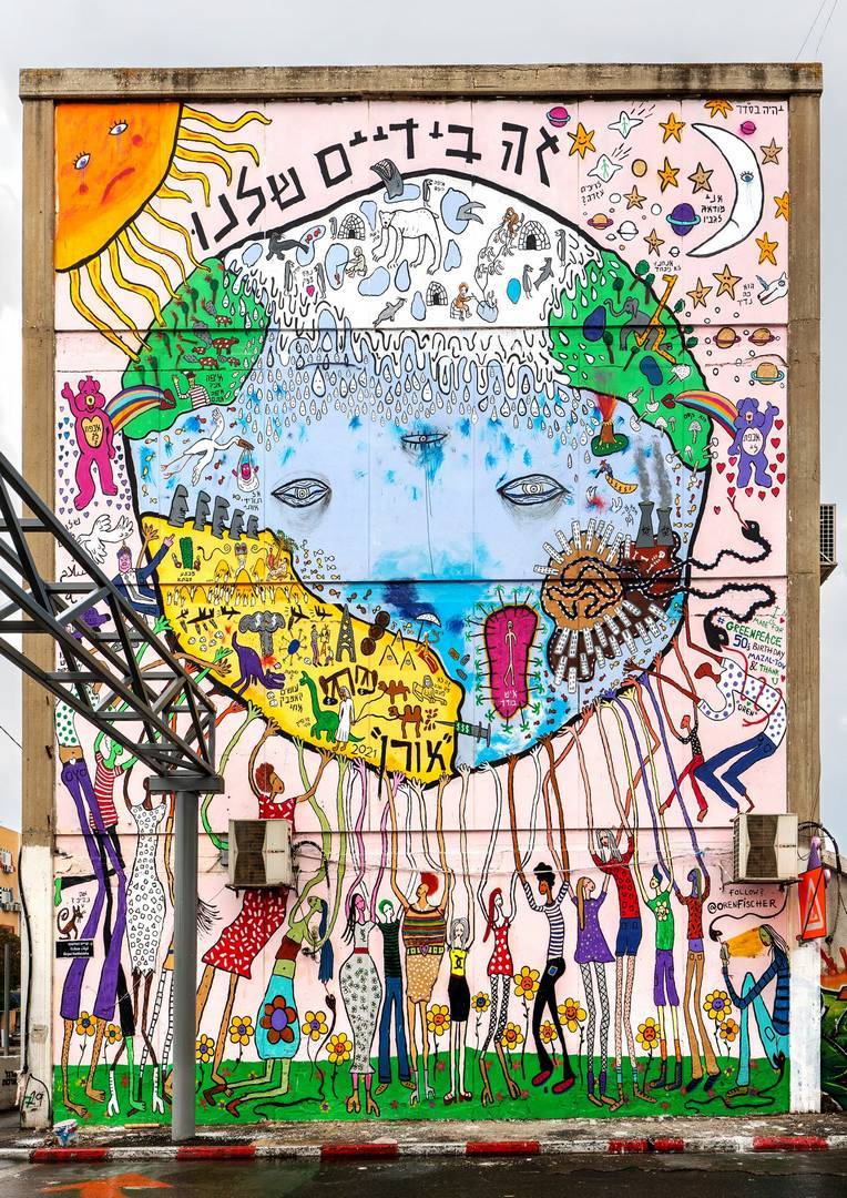 ״זה בידיים שלנו״, רחוב התנופה 7, קריית המלאכה, דרום תל אביב. עבודת קיר במרחב הציבורי, בהזמנת ארגון גרינפיס.