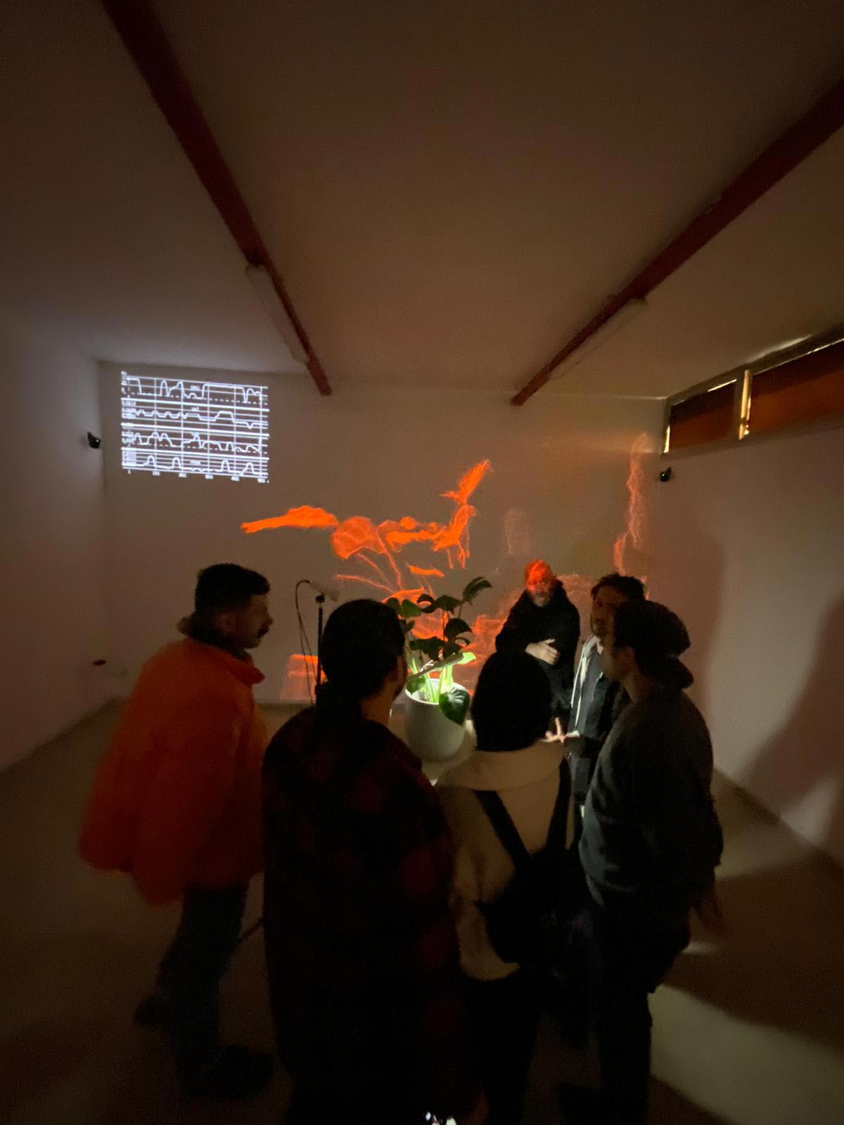 פרח, מיצב ביופידבק אינטראקטיבי, שמייצר ויזואל וסאונד ממדדי מתח חשמלי, אור, מליחות ומוליכות בצמח (אוצר: סימון ברזין). מוצג עד 17.1 בגלריה SPACE A בתל אביב.