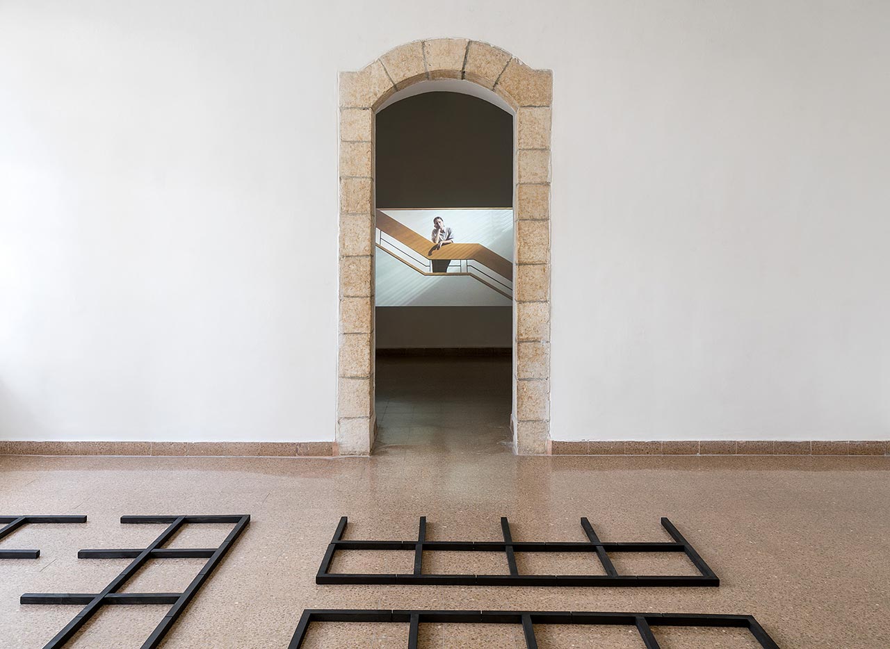 רננה: נכון, התערוכה התהוותה דווקא בזמן של הרבה שקט, לפני שנה ויותר בתקופה של הסגרים. בתערוכה אני מציגה עבודת וידאו ״ספריה״ ועבודות הצבה ״הברות״ ו״תוכנית רצפה״ בשלושה חללים. 25 סימנים, שמה של התערוכה, הם 22 אותיות, פסיק, נקודה ורווח. השם לקוח מתוך ציטוט של בורחס מהסיפור ״ספריית בבל״ בה הוא מתאר ספרייה עצומת מימדים, המכילה את כל הווריאציות האפשריות של 25 סימני הדפוס