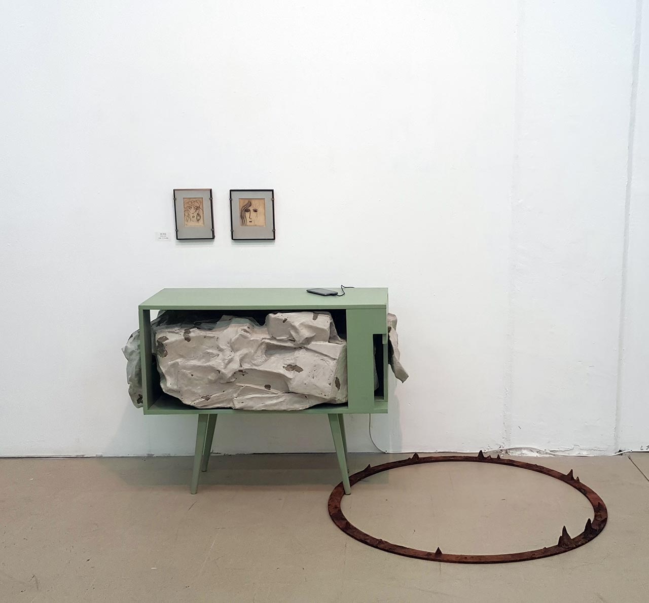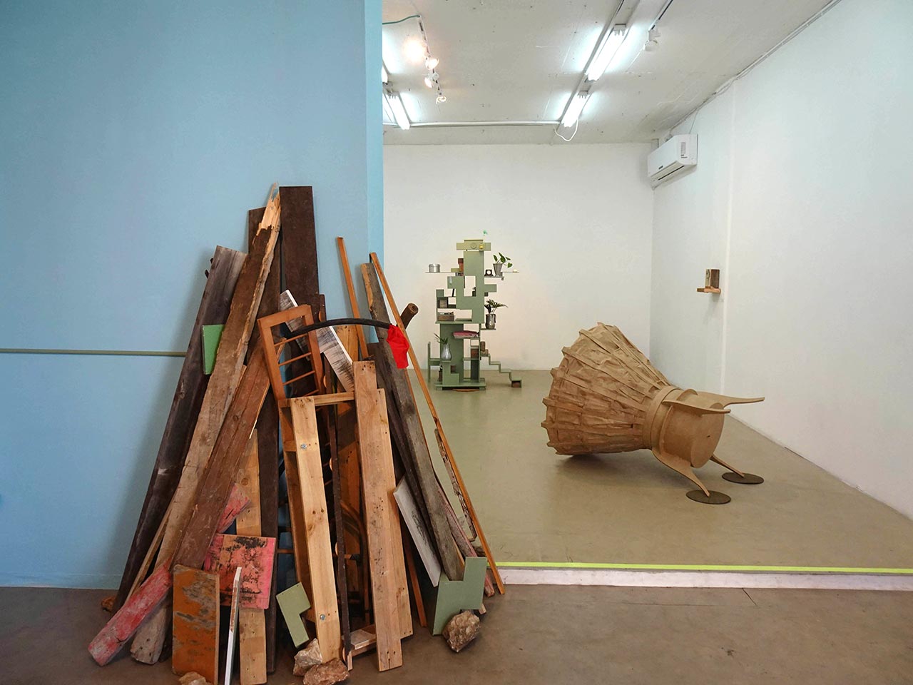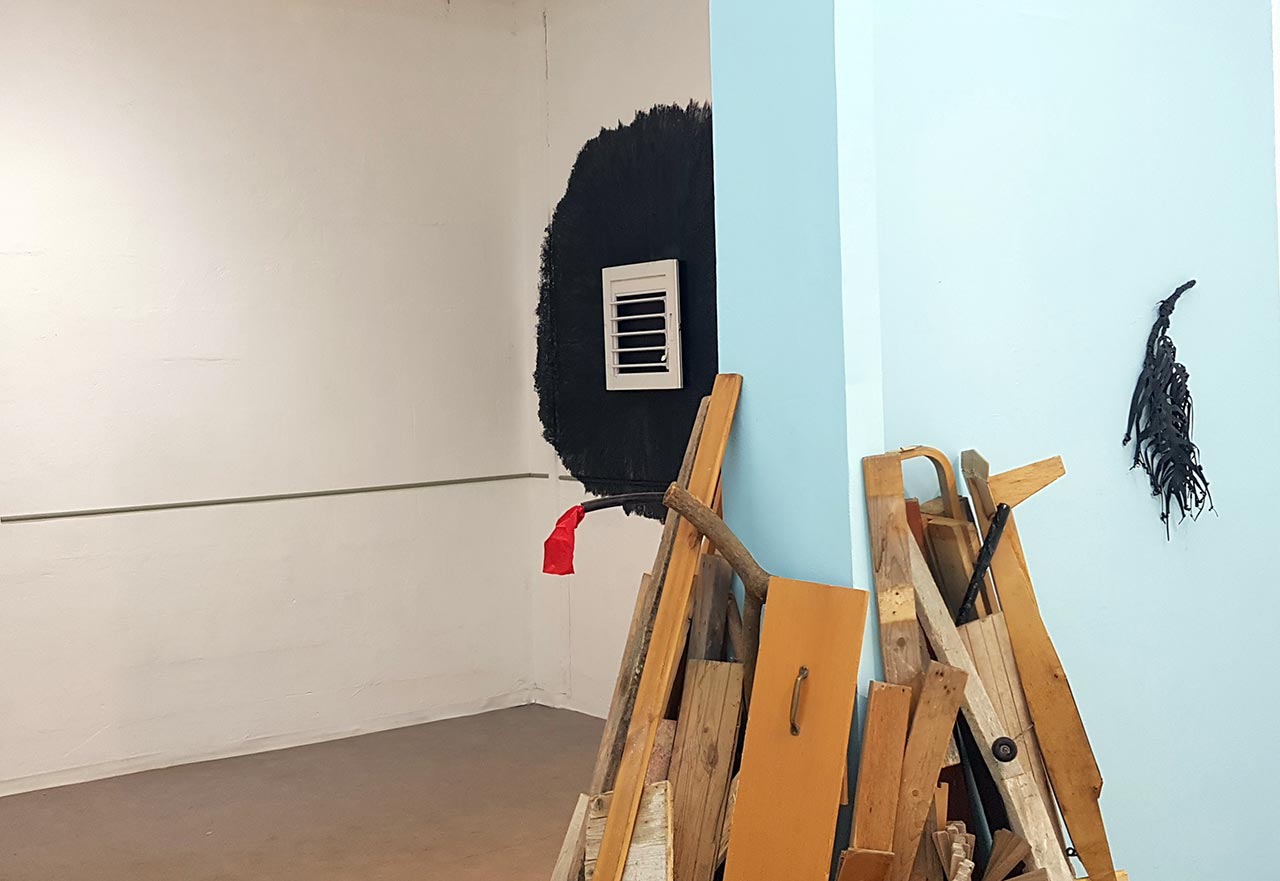 התערוכה מתמקדת בטשטוש הגבולות בין המרחב הציבורי לפרטי/ביתי. יש בה הכלאות פיסוליות שמשלבות צורות וחומרים ממרחבים אלה: ארון מדפים שהוא גם בנין או רובוטריק, שידה שבלעה סלע, מתקן חללי שהוא גם אורגני, ומדורה העומדת להידלק ולהצית את החדר.