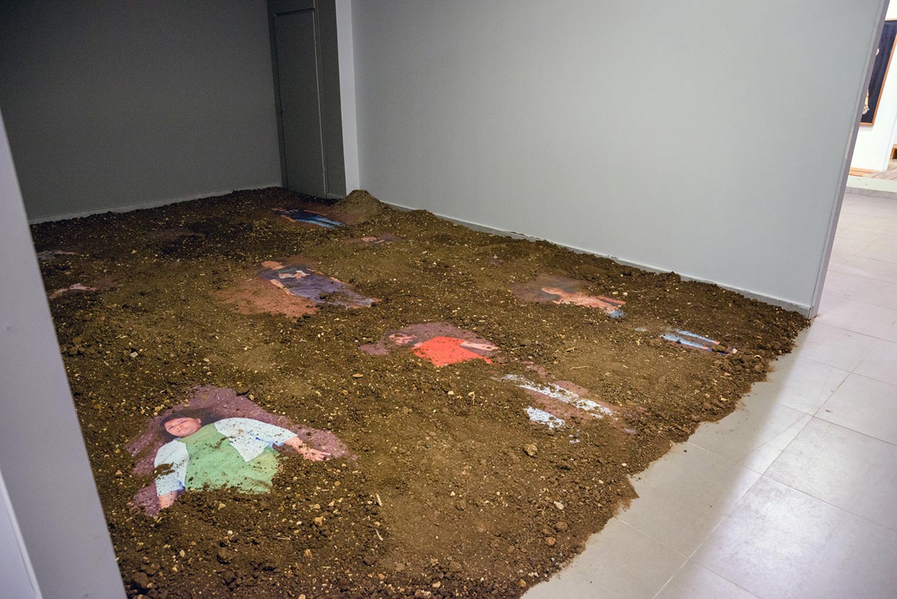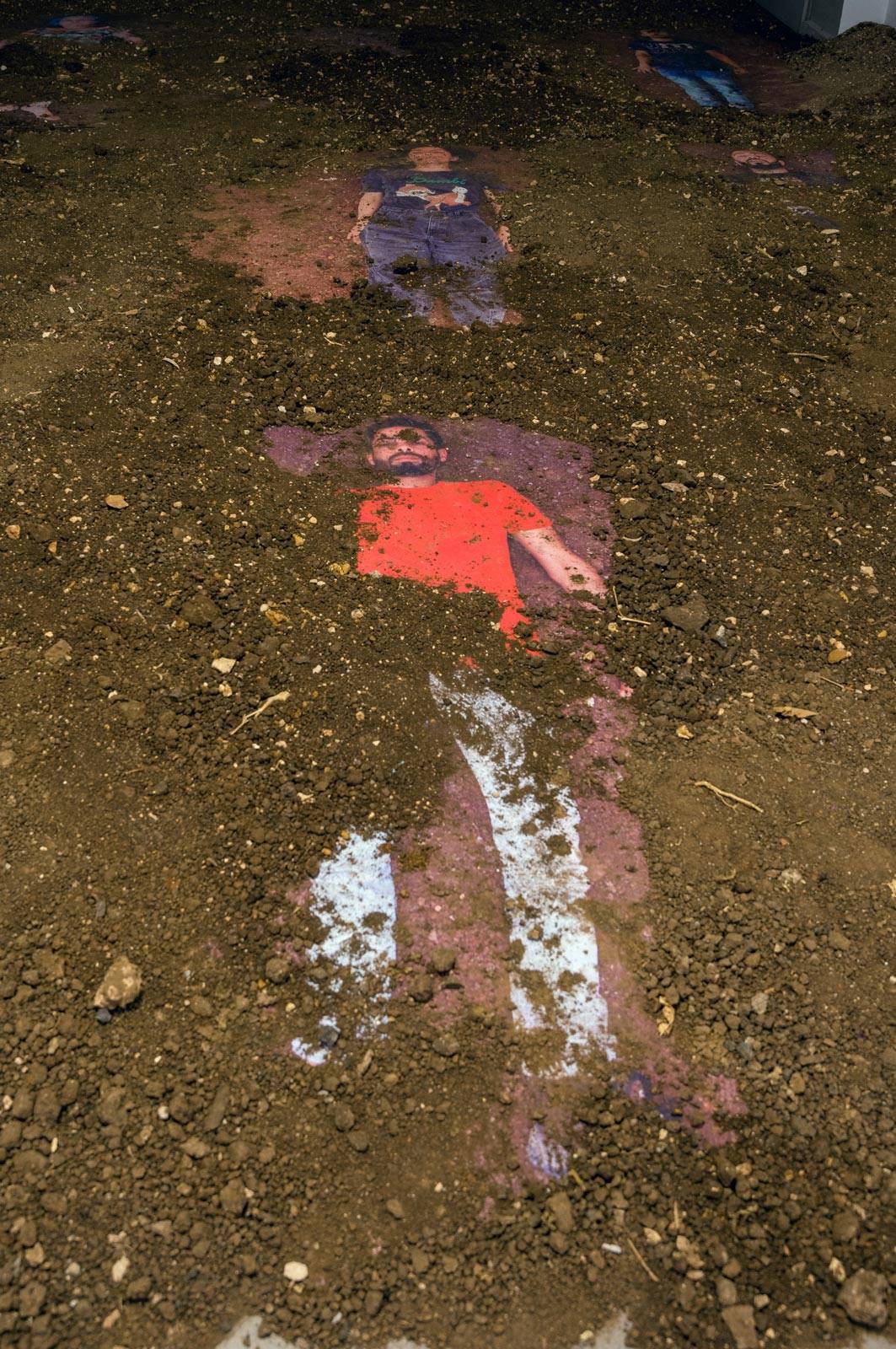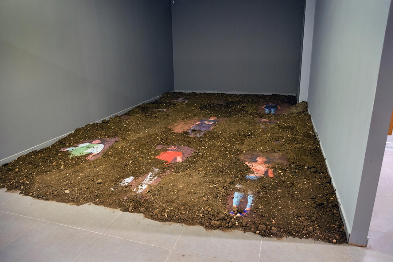 הצילומים מודבקים על הרצפה ומשתרעים בחלל, ערימות של אדמה מפוזרות על פני הדמויות, חלקן מכוסות וחלקן נגלות. המבקרים מוזמנים להיכנס לחלל לעבר הצילומים, לדרוך על העבודות להתבונן, ולהיות חלק מהמיצב.