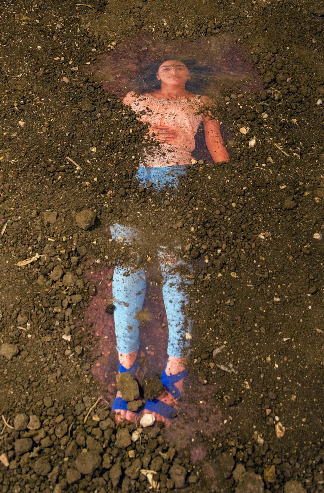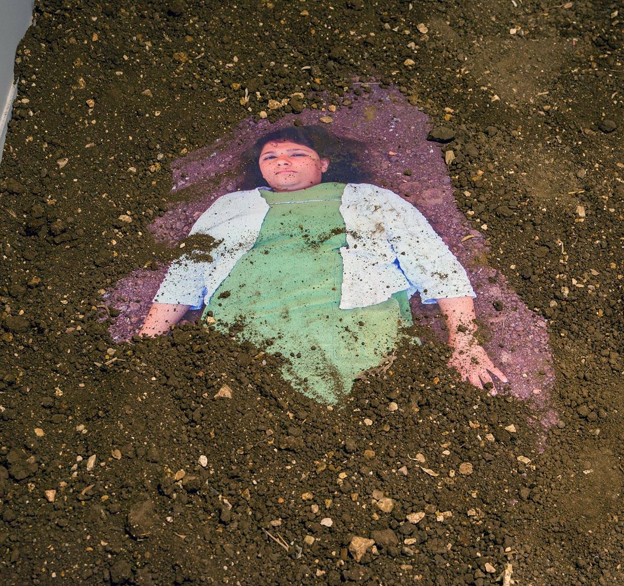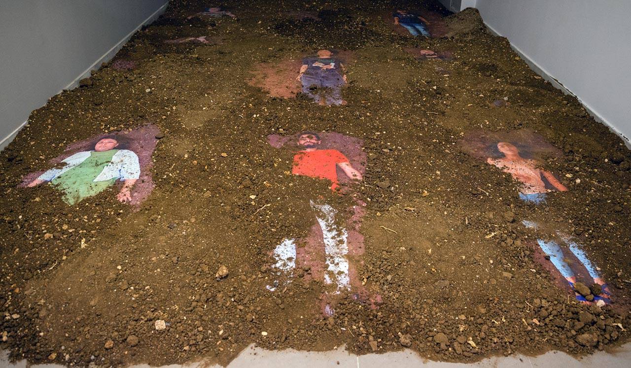 הצילומים מודבקים על הרצפה ומשתרעים בחלל, ערימות של אדמה מפוזרות על פני הדמויות, חלקן מכוסות וחלקן נגלות. המבקרים מוזמנים להיכנס לחלל לעבר הצילומים, לדרוך על העבודות להתבונן, ולהיות חלק מהמיצב.