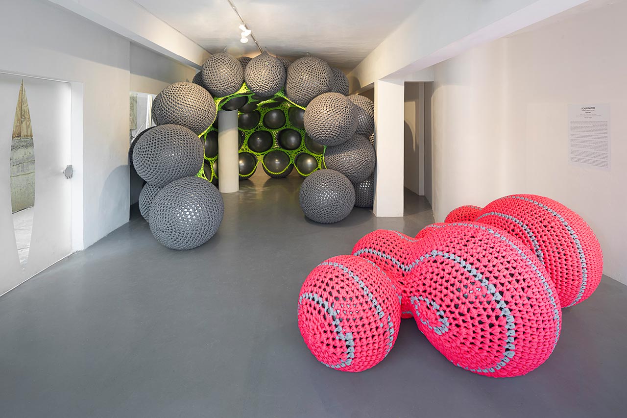 בתערוכה בגלריה פריסקופ בתל אביב (אוצרת: ענת גטניו) מציגה תמר ניקס, דוקטורנטית בעיצוב תעשייתי, מיצב המשלב אמנות ומחקר אקדמי. המיצב הוא מבנה פנאומטי עשוי מכדורים, בעל מעטפת שסרוגה כולה בטכניקת המסורתית של סריגה במסרגה אחת: Crochet. המחקר של ניקס עוסק במעבר של סריגת Crochet ממלאכת יד לייצור רובוטי והוא מתקיים במעבדת MTRL בטכניון.