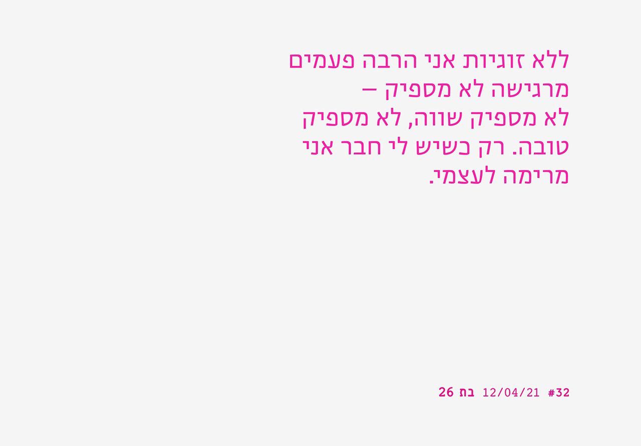 לפני שנתיים, עדיין בלימודים, במהלך שיחה עם חברה על בחורים, זוגיות ודייטים, היא אמרה לי שבגלל שאני נראית בטוחה בעצמי – אני נתפסת כמאיימת. ובגלל זה בחורים לא ניגשים אליי או מתחילים איתי.