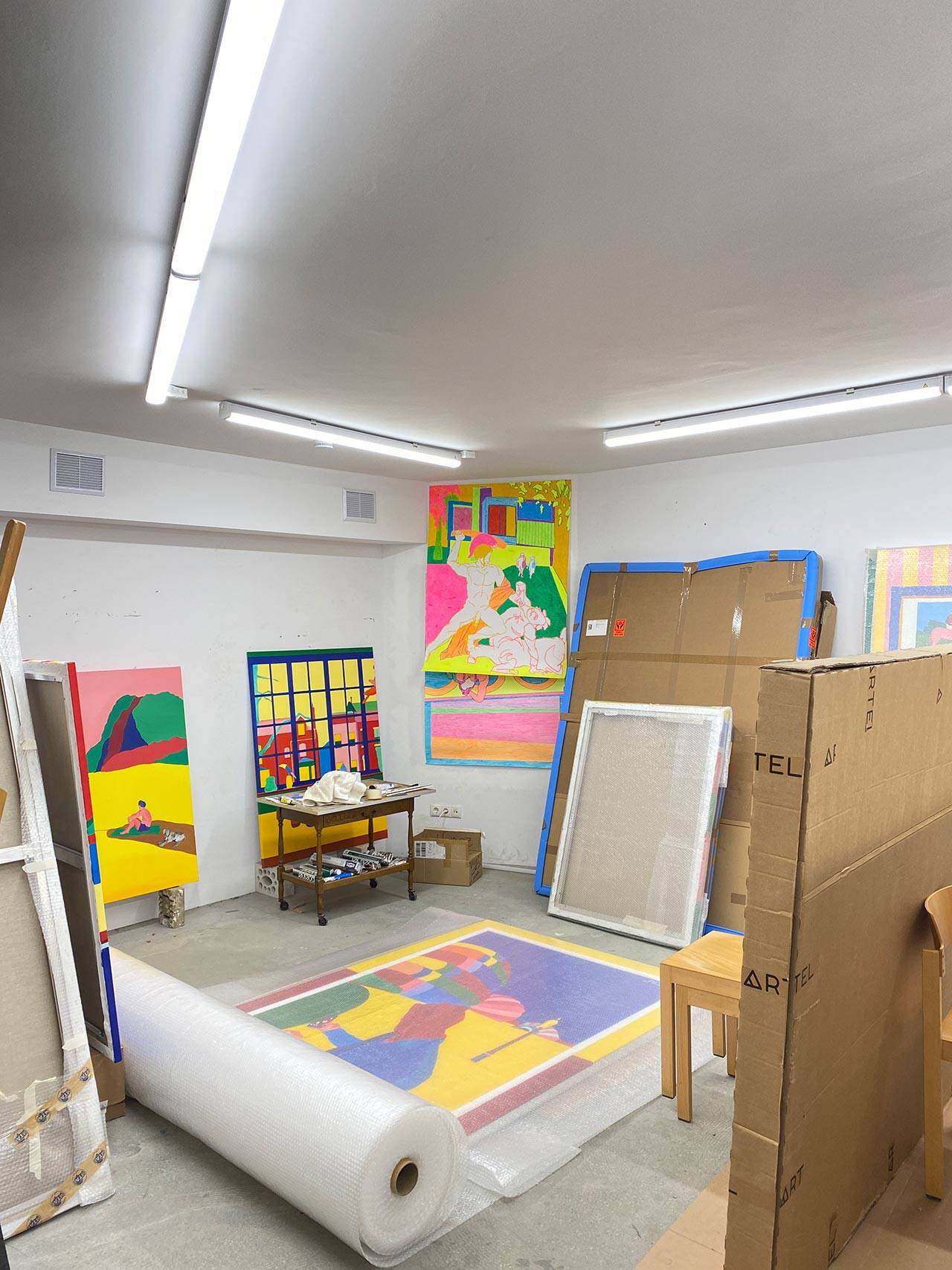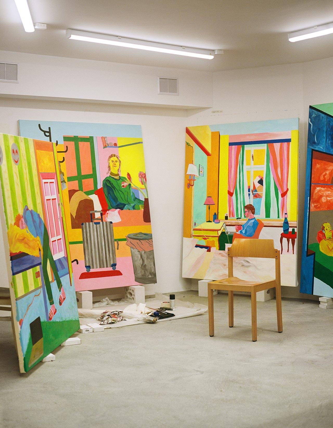 ״בהתחלה, ביסודות, היינו אמורים לעבוד רק עם עיפרון ואני אמרתי אין מצב. במשך שבועיים היינו אמורים לצייר אוזן. שאלתי אם אני יכול לצייר מה שאני רוצה וציירתי עם פסטלים ניאונים. אהבתי את זה, עד שלאט לאט הגוון הניאוני הפך לפחות ניאון ויותר פסטלי. ככה המשכתי עד ינואר 2021, לפני שנה וארבעה חודשים, כשעברתי לסטודיו החדש בברלין. פעם ראשונה סטודיו שלי: זה איפשר לי לעבור בחומרים אחרים ובקנה מידה גדול יותר.