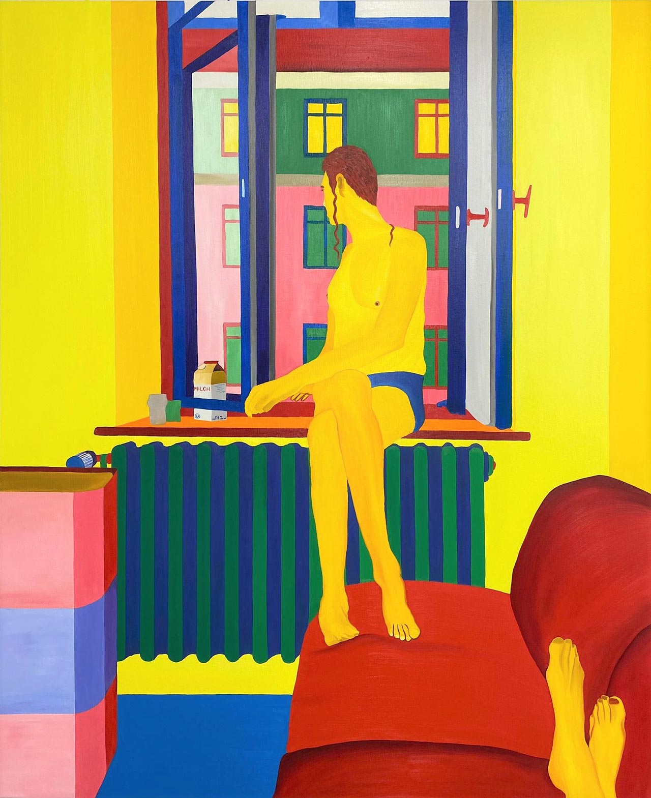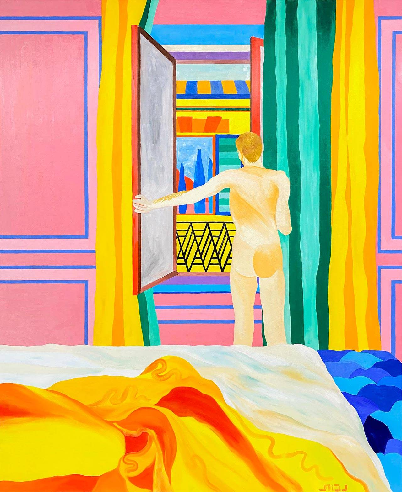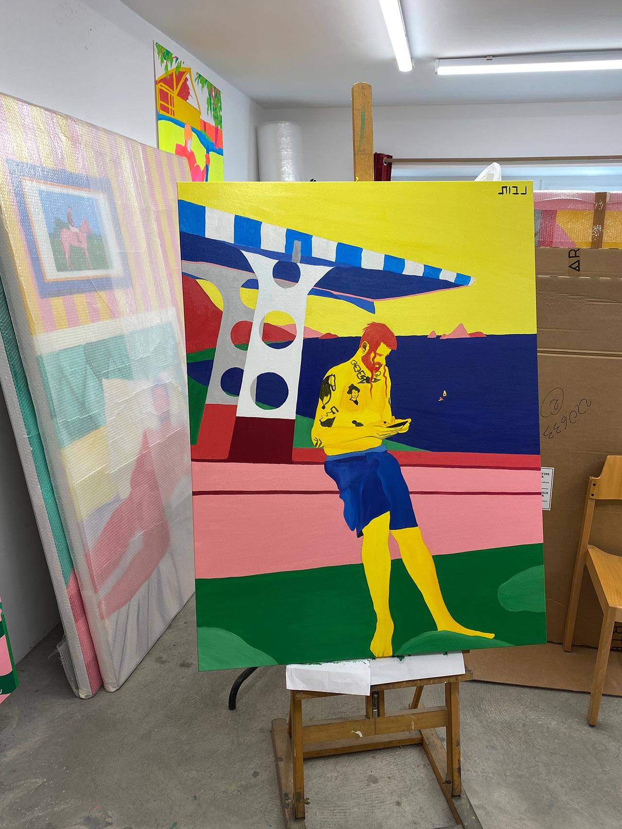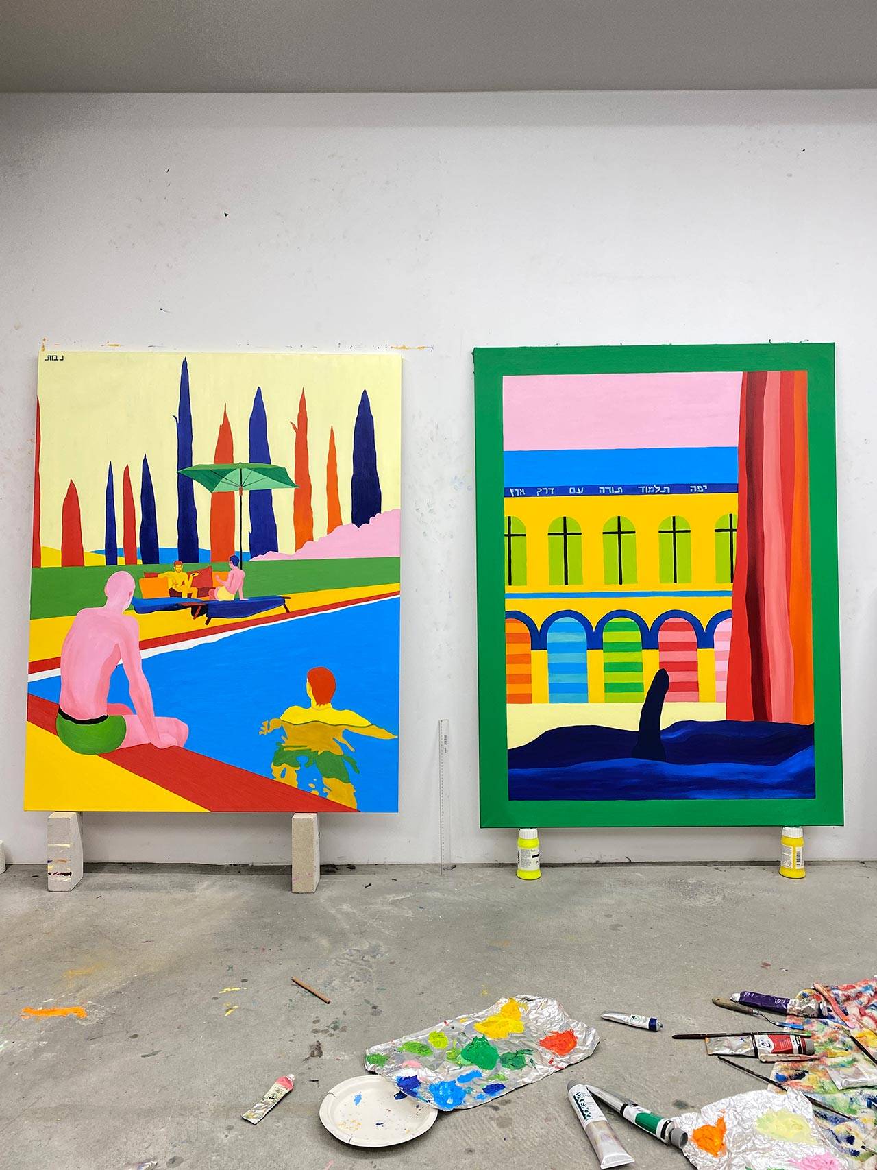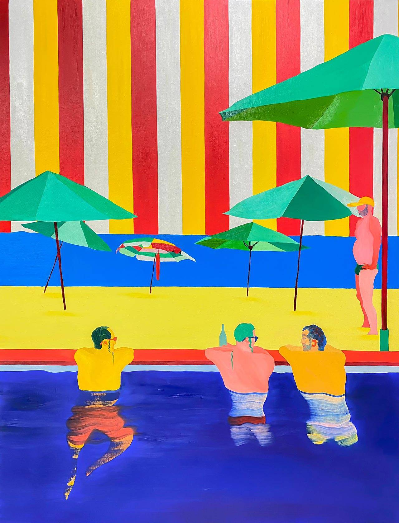 ואז, שעה לתוך השיחה הקולחת, הוא מוריד לרגע את כובע המצחיה שלו. פתאום מתגלות הפאות שלו, ולמרות שידעתי שהן שם, הרגע הזה מצליח להפתיע ולבלבל אותי; קצת כמו העבודות שלו. הדבר הראשון בציורים גדולי הממדים, שחלקם מגיע לגודל של 1.8/2.2 מטרים, הוא הצבעוניות העזה: צהובים, כחולים, ירוקים, אדומים, ורודים; חגיגה לא מתנצלת ומלאת תנופה של צבע. הדמויות, רובן גברים צעירים – בבריכה, בחדר מלון, בחוף הים, בבית קפה, בבר – לבושים וערומים.