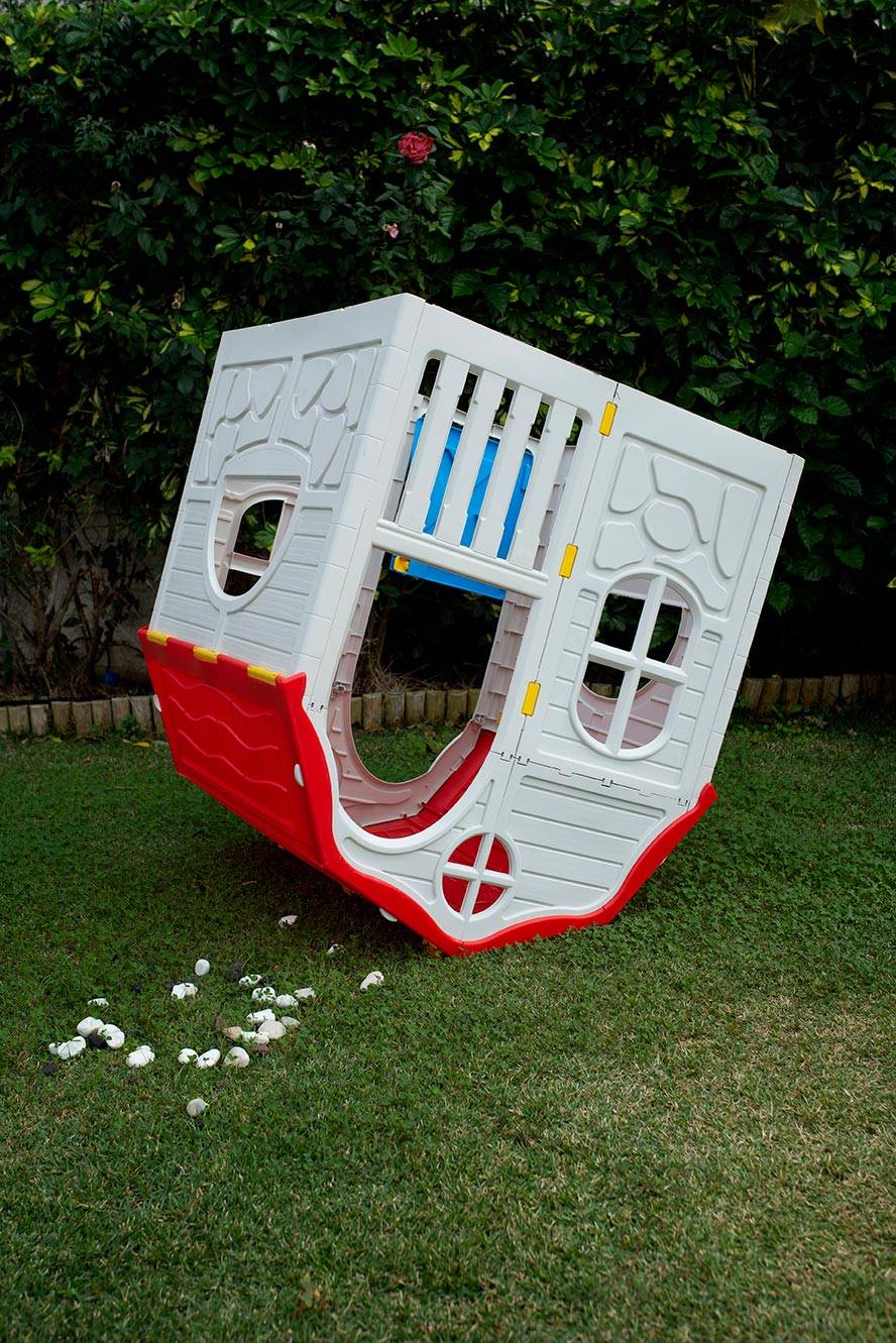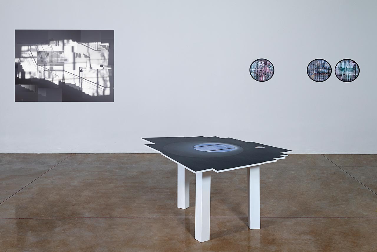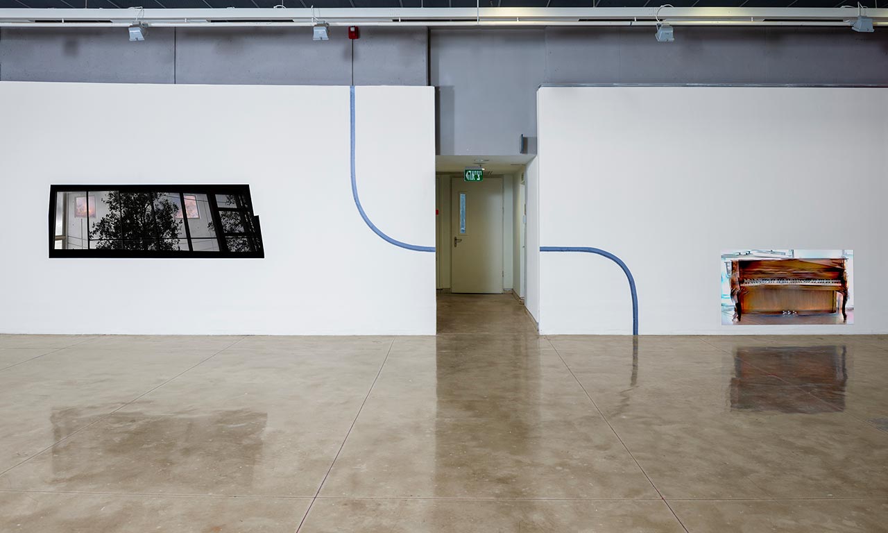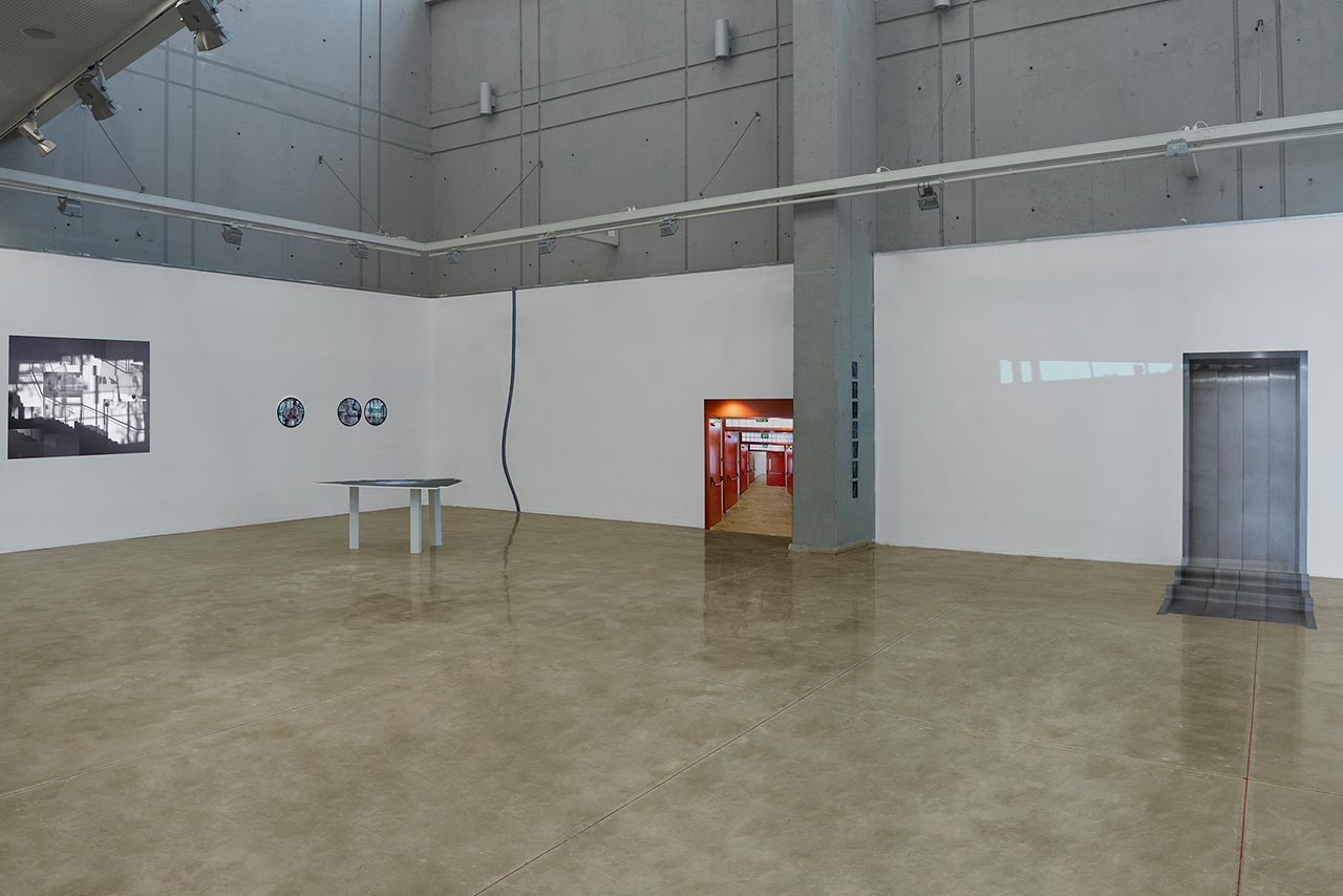 ״הבניין״ של ענבל כהן חמו (שגם כותבת אצלנו בפורטפוליו) הוא פרויקט בתוך משכן האמנויות בחיפה, שבו הוא מוצגת. מעשרות ומאות צילומים של המשכן כהן חמו תפרה דימויים חדשים, שבה בעת מצביעים ומכוונים אל המשכן עצמו אבל גם אל מציאות חלופית, בדיונית ואישית. התערוכה מכילה דימויים גדולי ממדים, הקרנה והתערבויות פיסוליות. בין הדימויים שמוצגים – דימוי של מעלית שמתארכת אל הרצפה ונשפכת אליה בגלים, דלת אדומה הדומה לדלתות המשכן הסמוך הופכת למסדרון אינסופי אל הלא ידוע. הקרנה איטית של כתם אור נע, מדמה את תנועת האור והצל, וחרצי הרצפה מולאו בסיליקון אדום, שכמעט ואינו נראה, אבל מרמז על הצפה שבאה מקרקעית הבניין.