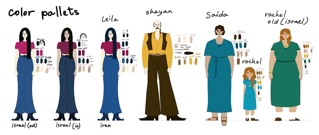 מה שהנחה אותנו בעיצוב הדמויות היתה העובדה שרצינו לייצר הזדהות איתן, אבל לא רצינו שהעיצוב שלהן יהיה ילדותי מדי ומנותק מהנושא. ויתרנו על קו המתאר השחור כדי שלא יראו קרטוניות. גזרנו מהסרט ״צוללת צהובה״ של הביטלס את המבנה ה״בוגר״ של ראש קטן וגוף גדול, כמו גם את סגנון הלבוש של שנות ה־70 שהיה אופנתי אז באיראן.