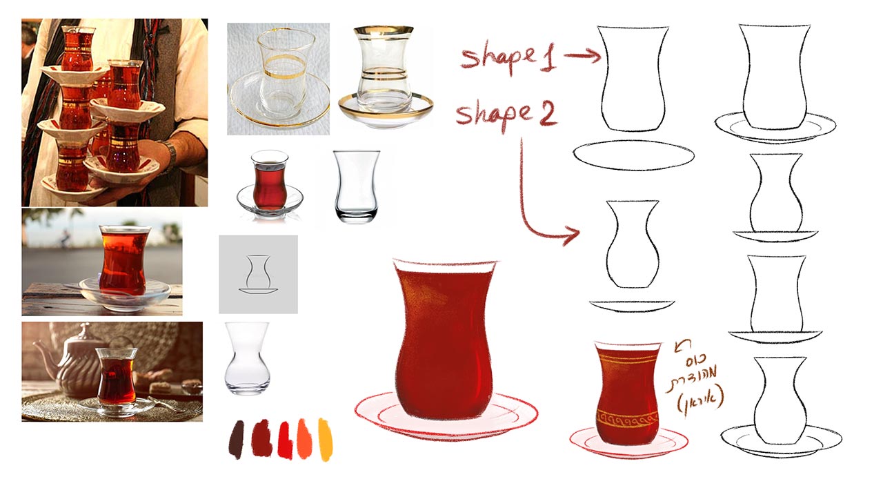 כתיבת התסריט היתה מאתגרת במיוחד: הרכבנו אותו בפתקיות על הקירות של מרכז הצעירים בחולון ועבדנו שם במשך כל שנת הלימודים, גם אחרי ההגשה לבצלאל. חיפשנו מוטיב שישזור את שני הסיפורים יחד – ואז הגיע התה. תגלית רנדומלית הובילה אותנו למבנה המיוחד של כוס ה״סטיקאן״ שהיה זהה בשתי המדינות, וטקסי התה שהיו חלק בלתי נפרד מהתרבויות עזרו לנו לאפיין את השונה והדומה בין שתי הדמויות וארצן.