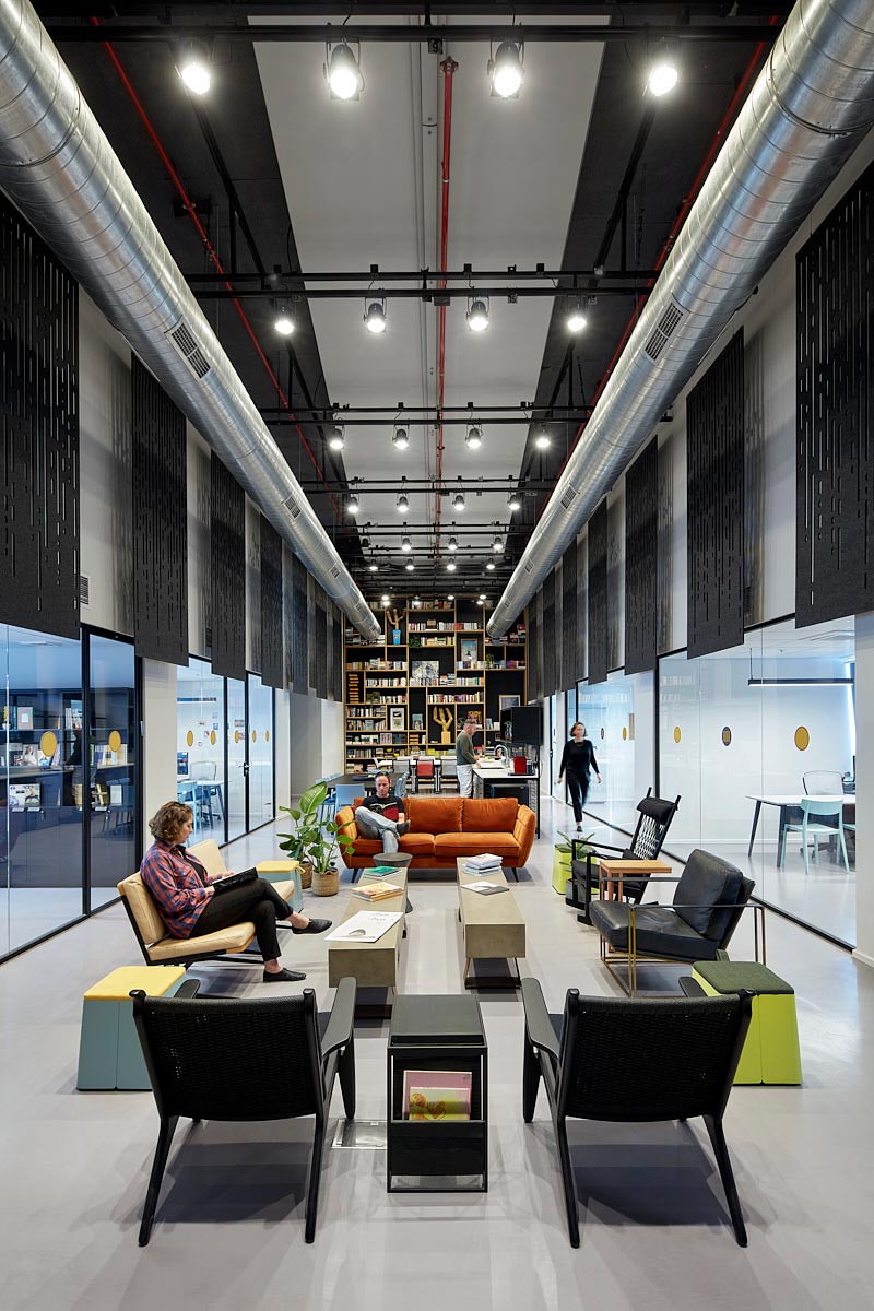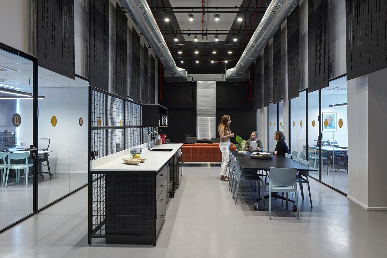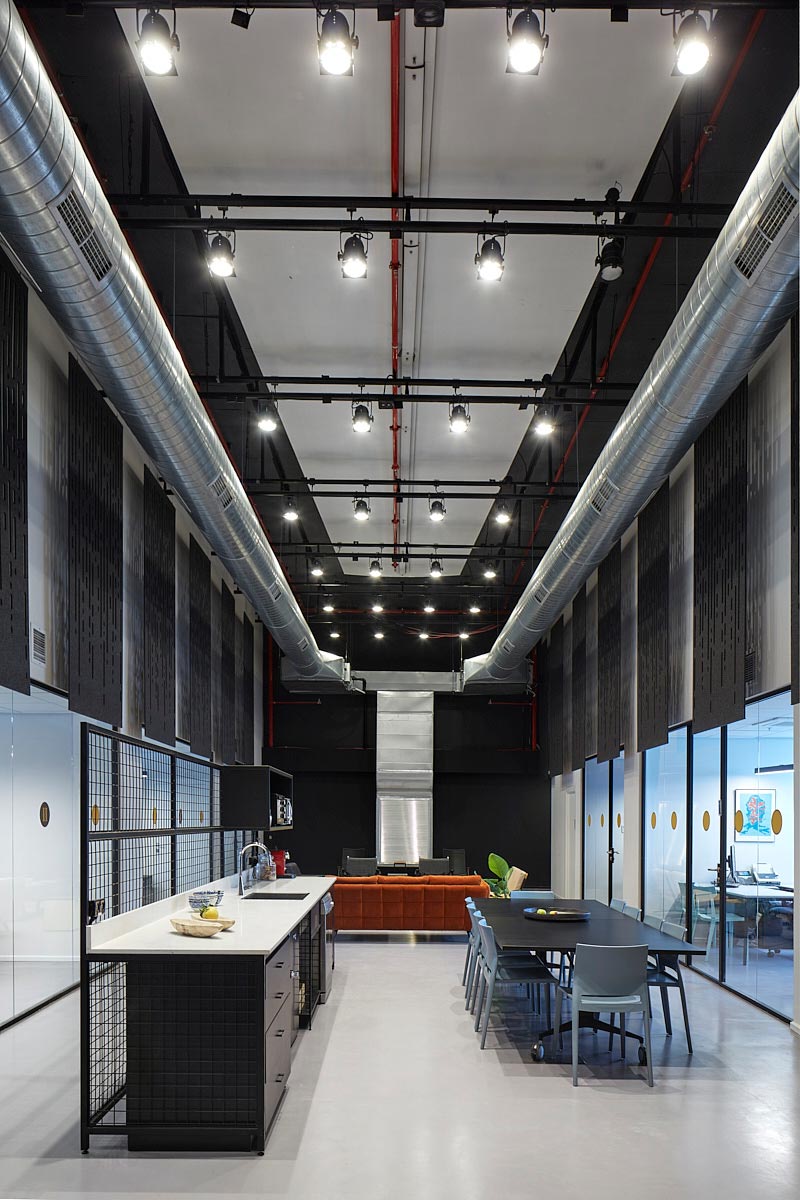 הכניסה אל החלל גבוה־התקרה ששטחו כ־200 מ״ר עוברת דרך הלובי של הבניין והוא מאופיין במבנה מלבני צר וארוך. הקונספט שטווה עבורו לוי נשען על ניצול ממד האורך ליצירת מרחב גמיש שיכיל את הפונקציות שהוגדרו, תוך שמירה על שקיפות המאפשרת קשרי מבט ישירים ביניהן. המשרדים שבתוכו נתחמו בזיגוג שקוף ומוקמו משני עברי החלל, תוך הותרת מעין שדרה מרכזית המרכזת בשטחה את אזורי האירוח והמטבח, וכן אזור ישיבות פתוח. בעוד באזורי המשרדים התקרה הונמכה, בשדרה המרכזית שמר לוי על הגובה הכפול ועל מקצביו המקוריים של החלל, דוגמת החלונות, שלצד מקצבים שנוספו בתכנון מייצרים לשיטתו קומפוזיציה המאחדת אותם ומייצרת עניין.