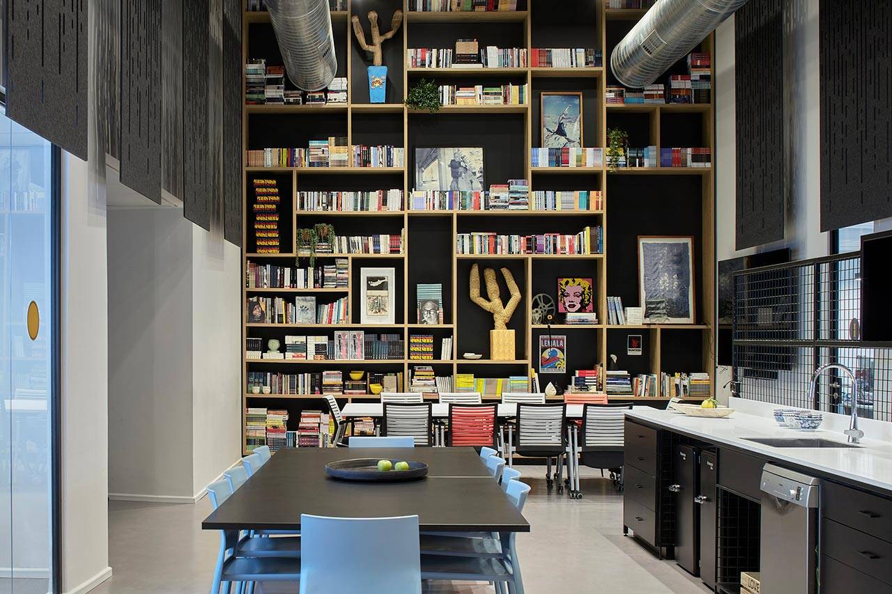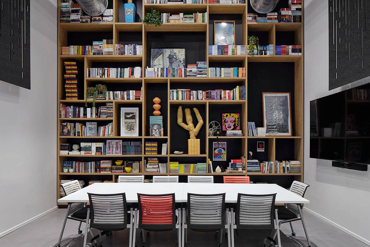 הריצוף בוצע בדבק איפוקסי דמוי בטון מוחלק, ואת אזור המטבח שבחלל תוחמת רשת פלדה שחורה המגלמת את הממד האורבני־מחוספס של העיצוב. הרשת משמשת לתלייה פונקציונלית של אביזרים נדרשים וגם כאלמנט עיצובי המשמר את ממד השקיפות, ומאפשר קיום קשר עין עם המשרדים שמאחוריה. אלמנט מרשים במיוחד בחלל היא ספרייה ייעודית שתוכננה לטובתו, שלמרגלותיה הוצב שולחן הישיבות. גובהה המתנשא ל־5.5 מטר מחפה את כלל שטחו של הקיר ומתפקד כך גם כאלמנט אקוסטי. כל הספרים הרבים שהיא מאכלסת בתוכה יצאו לאור בהוצאת מפעל הפיס.